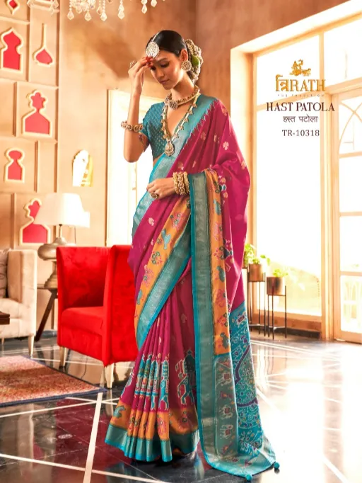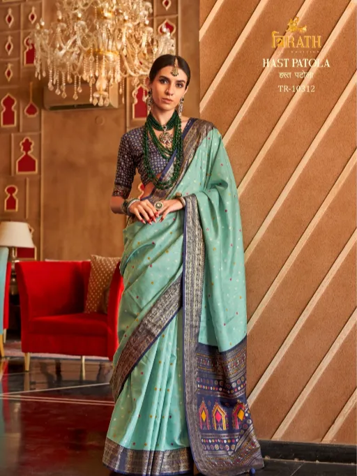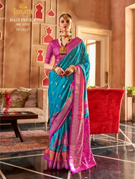 Shop Trirath Hast Patola sigma silk sarees featuring classic Patola design and Sambalpuri pallu. Aqua finish elegance at wholesale rate.