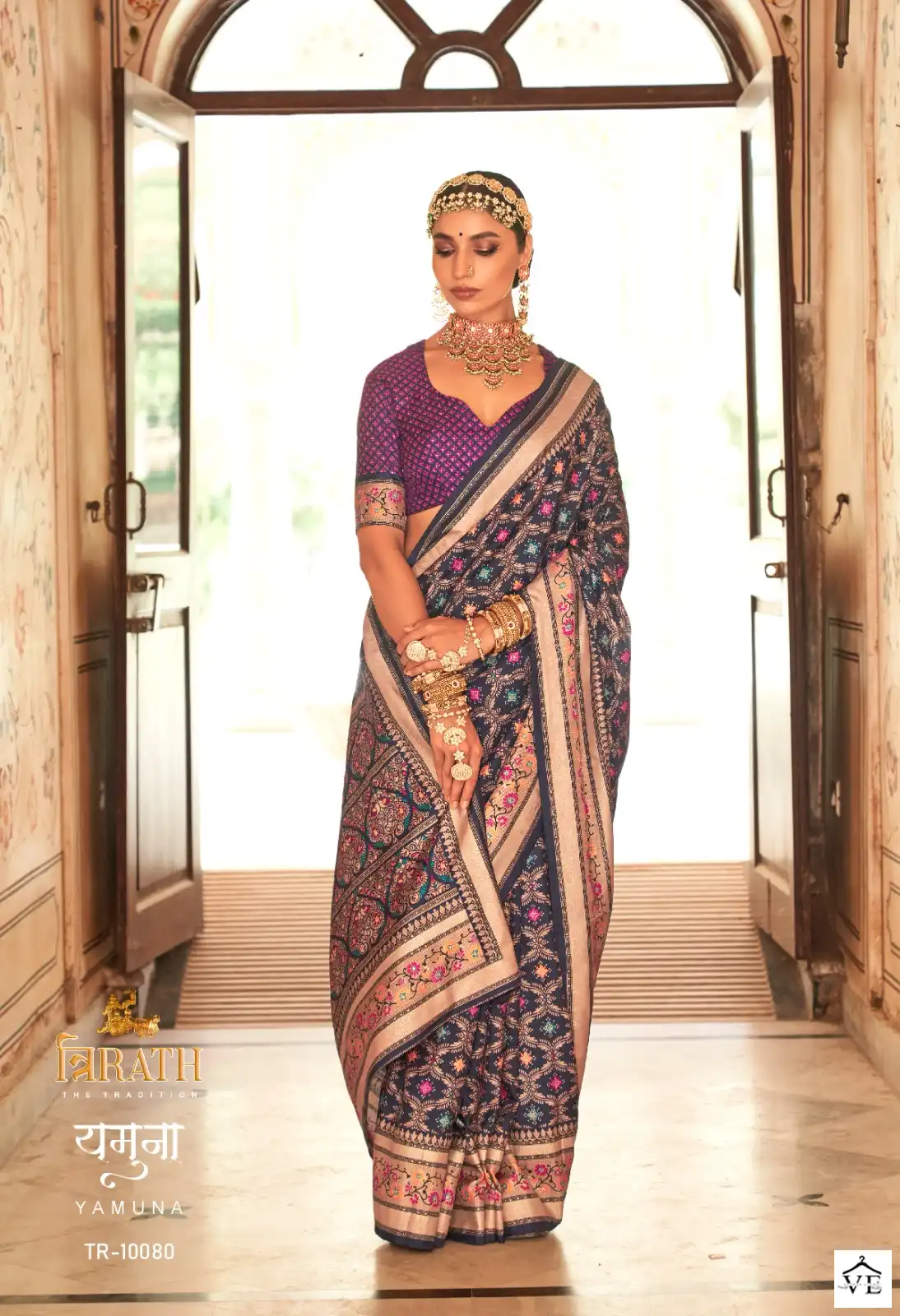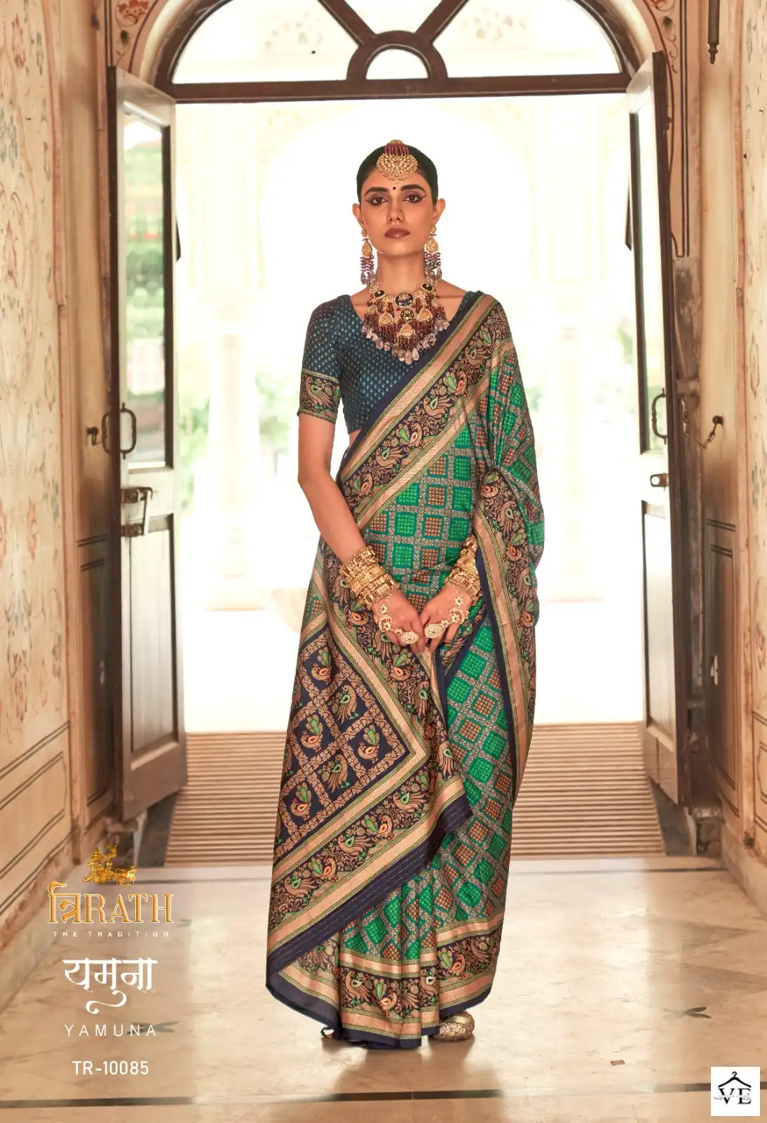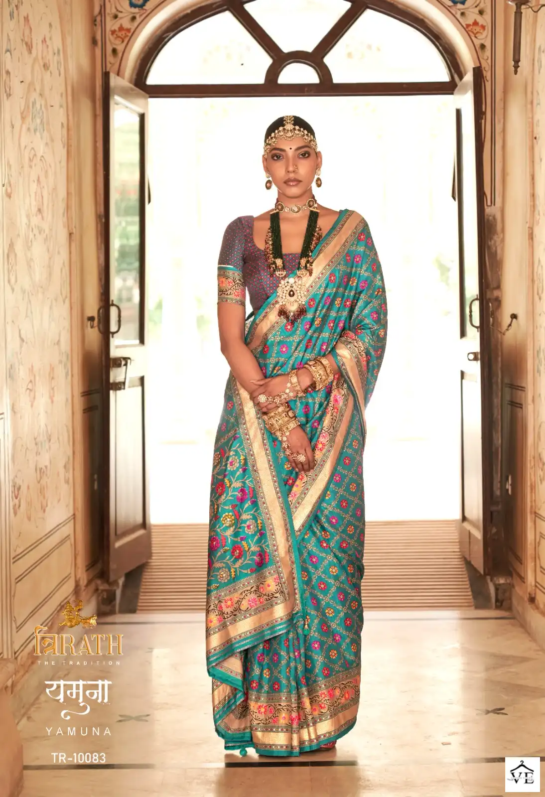Trirath Yamuna S.P. Silk Wholesale Saree Catalog of 9 Pcs. We deal in Kurtis, Sarees, Dresses Materials, Leggings, and Designer Salwar Kameez.