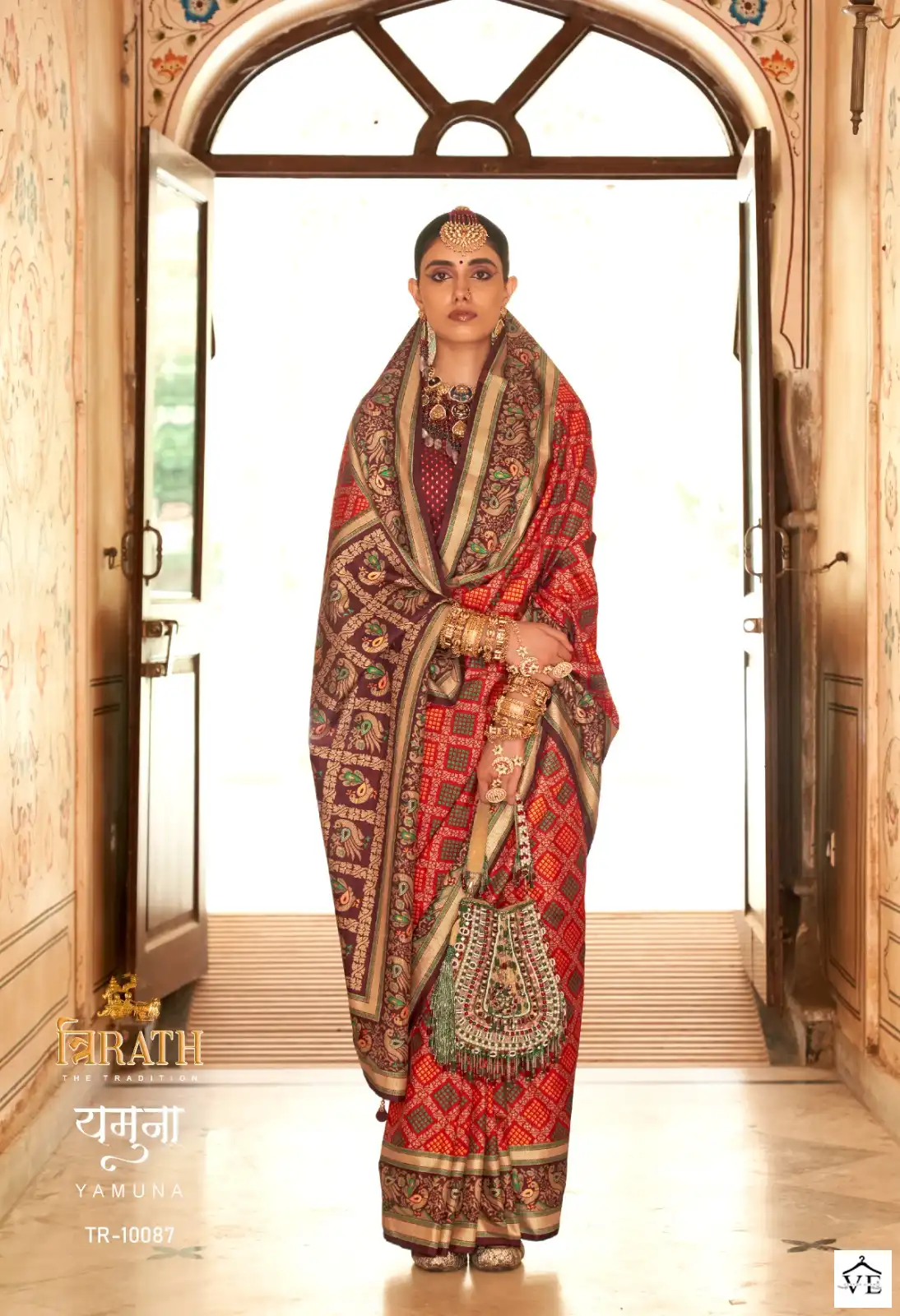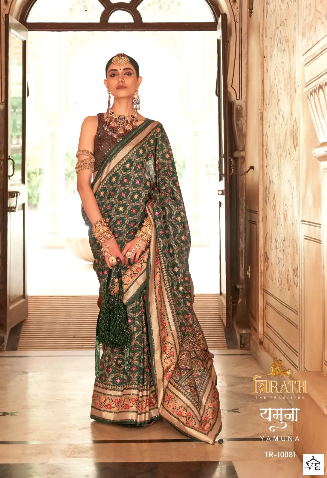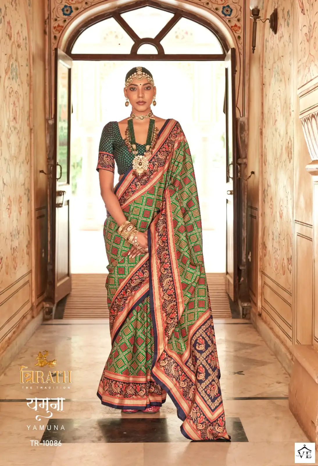 Trirath Yamuna S.P. Silk Wholesale Saree Catalog of 9 Pcs. We deal in Kurtis, Sarees, Dresses Materials, Leggings, and Designer Salwar Kameez.