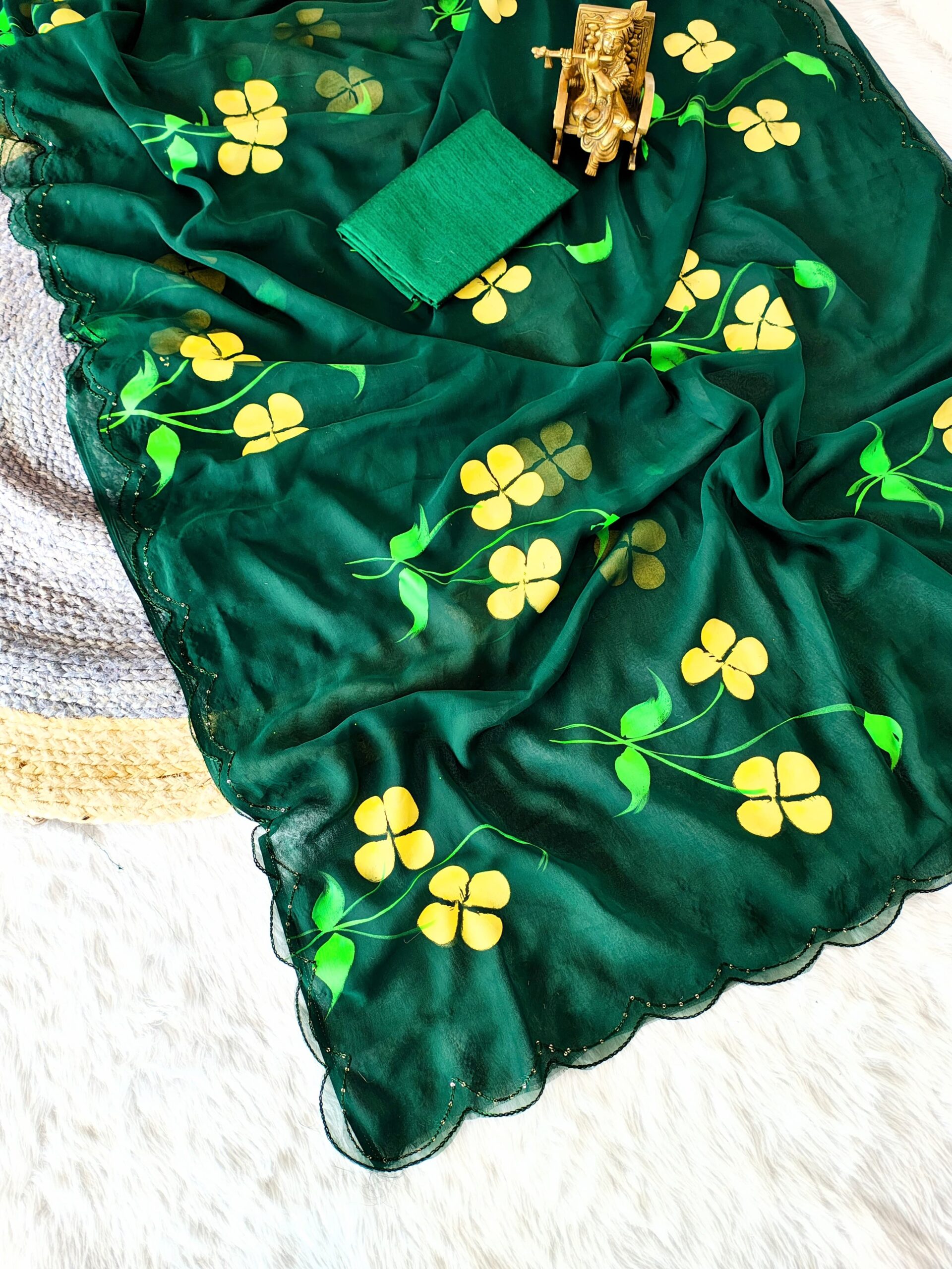A premium handcrafted pure georgette saree featuring exclusive handbrush floral designs and intricate Aari embroidery. Ideal for festive occasions, parties, and elegant daywear.