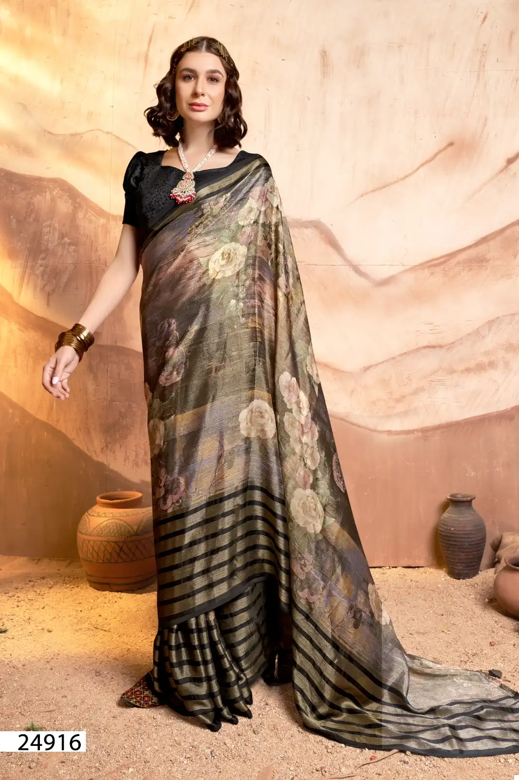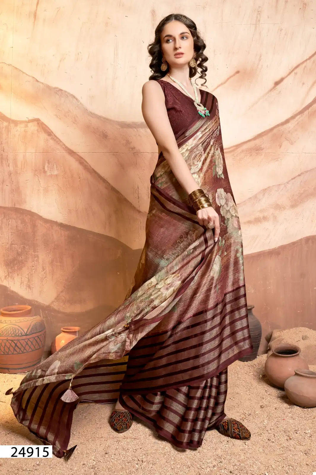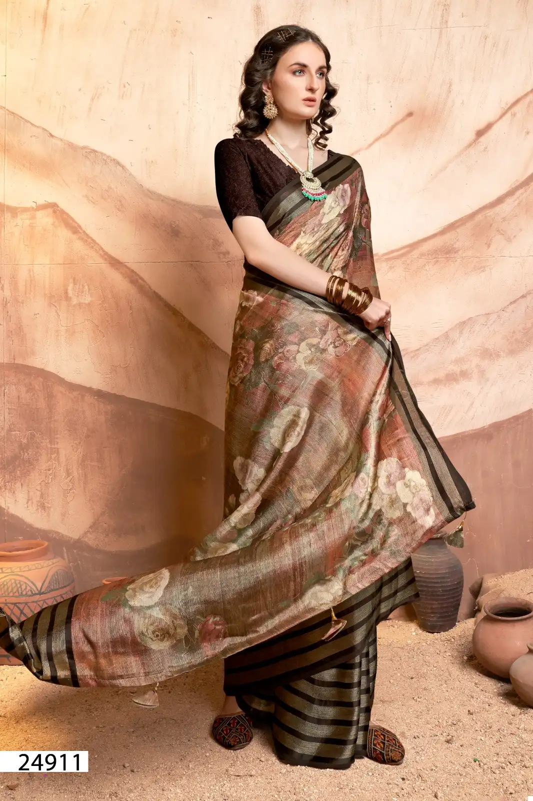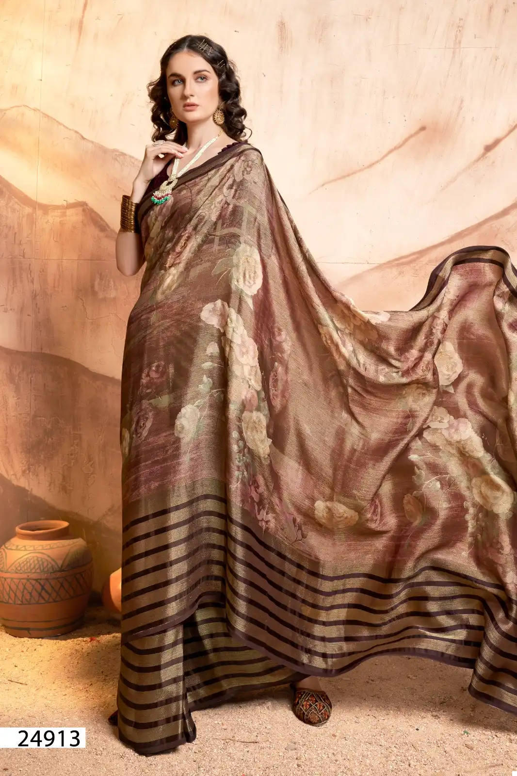Saree: Each saree in this collection is crafted from exquisite Brasso fabric, known for its unique texture and durability. The floral print adds a touch of nature-inspired beauty, while the foil-embellished details provide a subtle yet stunning shimmer. These elements come together to create a saree that is both elegant and eye-catching, suitable for a variety of occasions, from festive celebrations to formal gatherings.