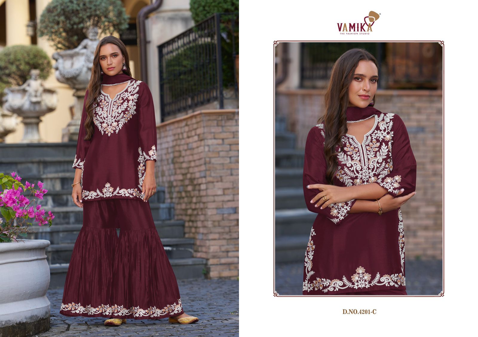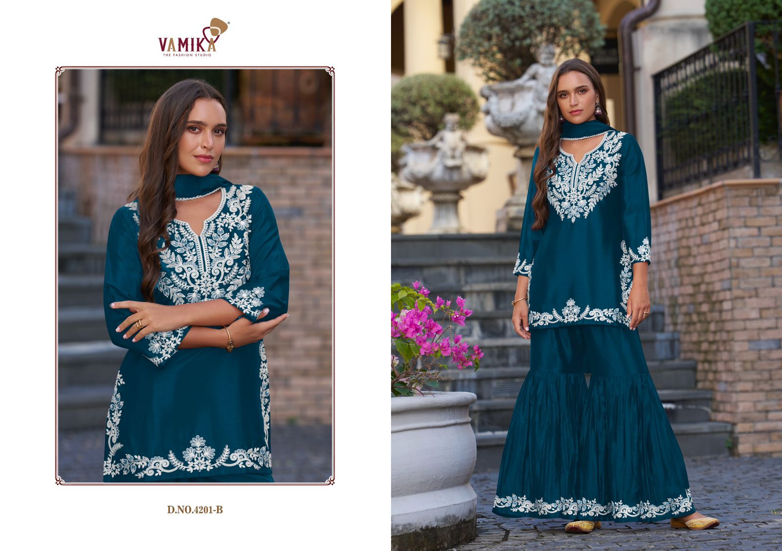 Step into elegance with Vamika Anamika Vol 1, a stunning collection featuring luxurious Chinon fabric and exquisite craftsmanship. Designed for festivals, parties, and special occasions, this set offers: