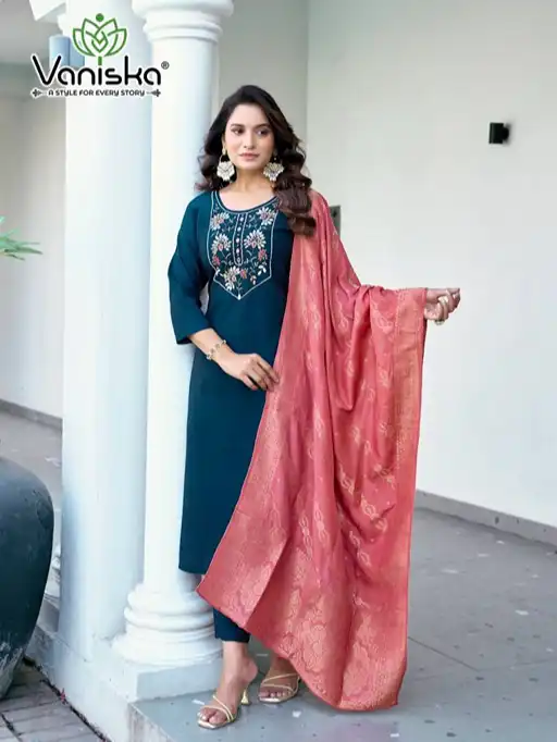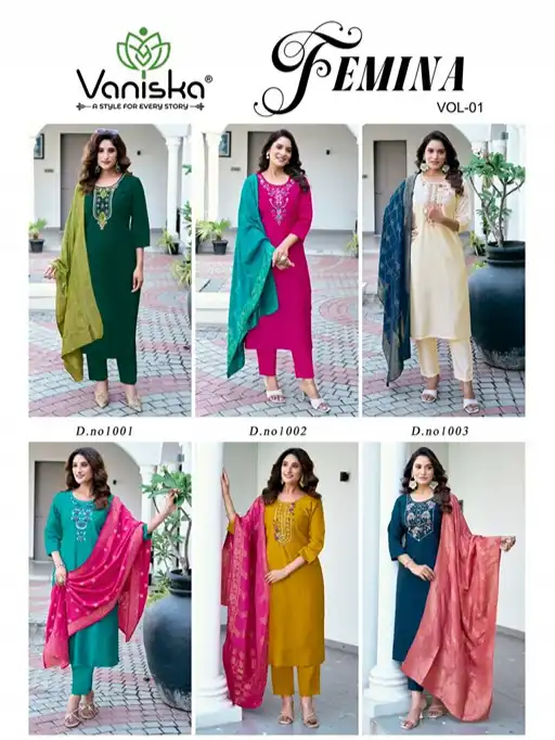Shop Vaniska Femina Vol 1 Masleen Kurti Sets with rich Gadhwal Silk, detailed handwork, and Muslin Jacquard Dupatta at ₹899 + GST. Premium ethnic collection with 6 designs in sizes S to 3XL.