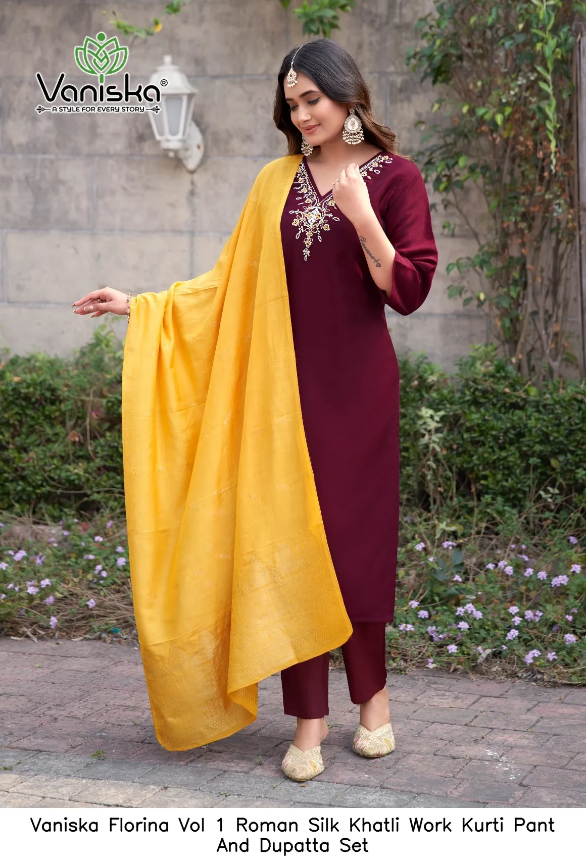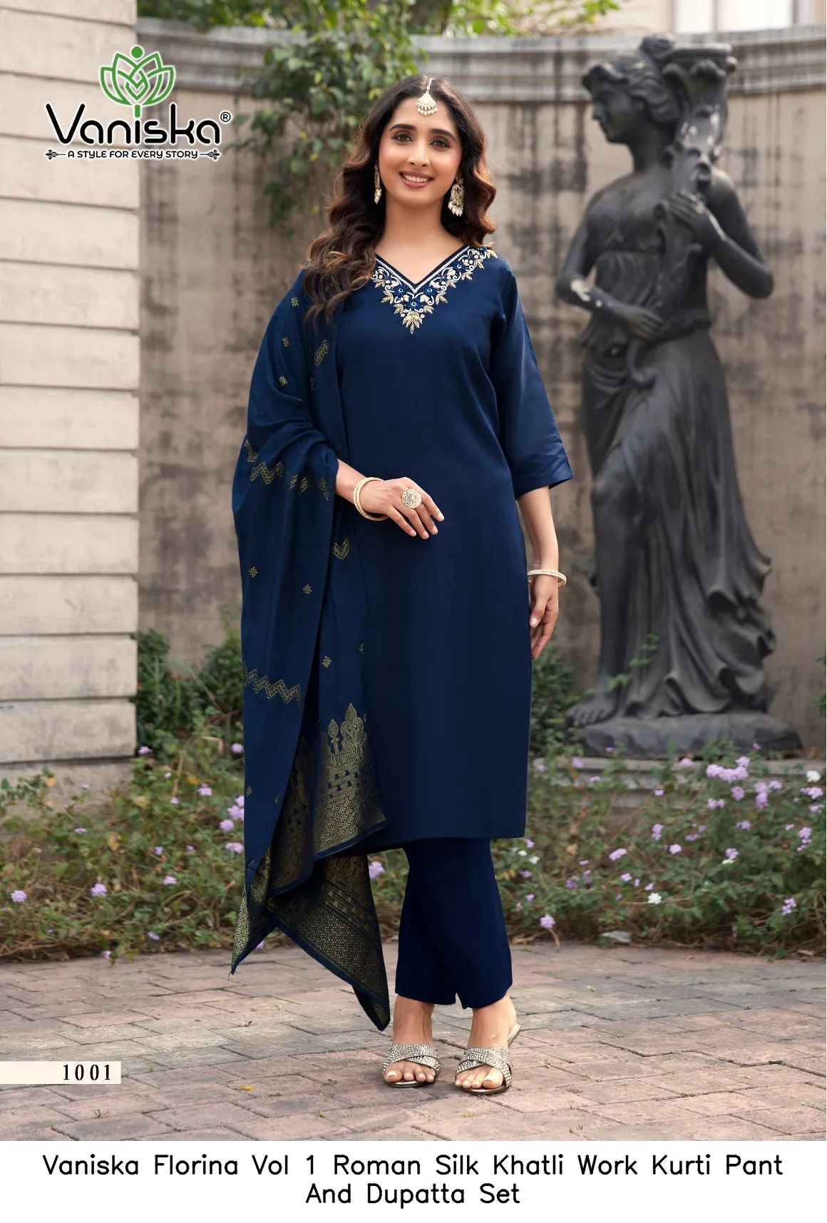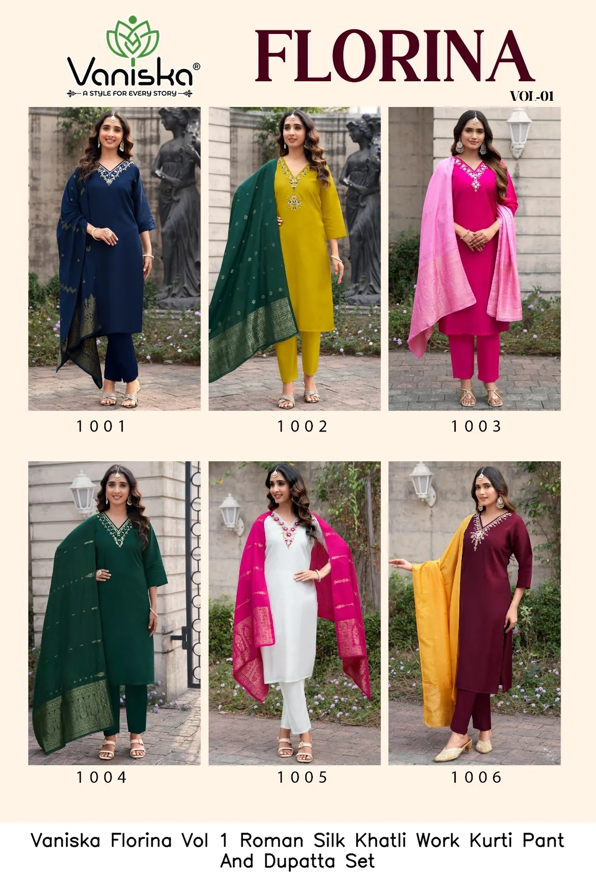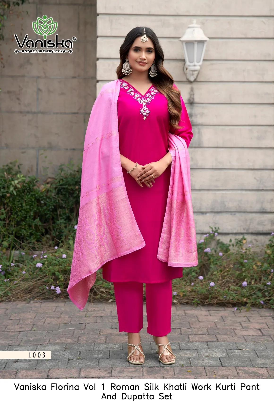 Vaniska Florina Vol 1 Roman Silk Khatli Work Kurti Pant And Dupatta Set