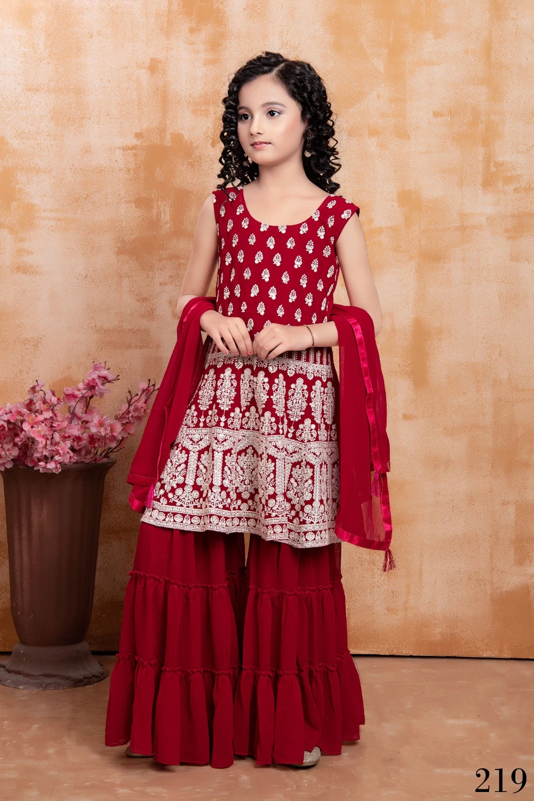 - Sharara: The plain faux georgette sharara complements the embroidered top, offering a sleek and modern silhouette that enhances the outfit’s overall appeal.