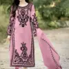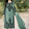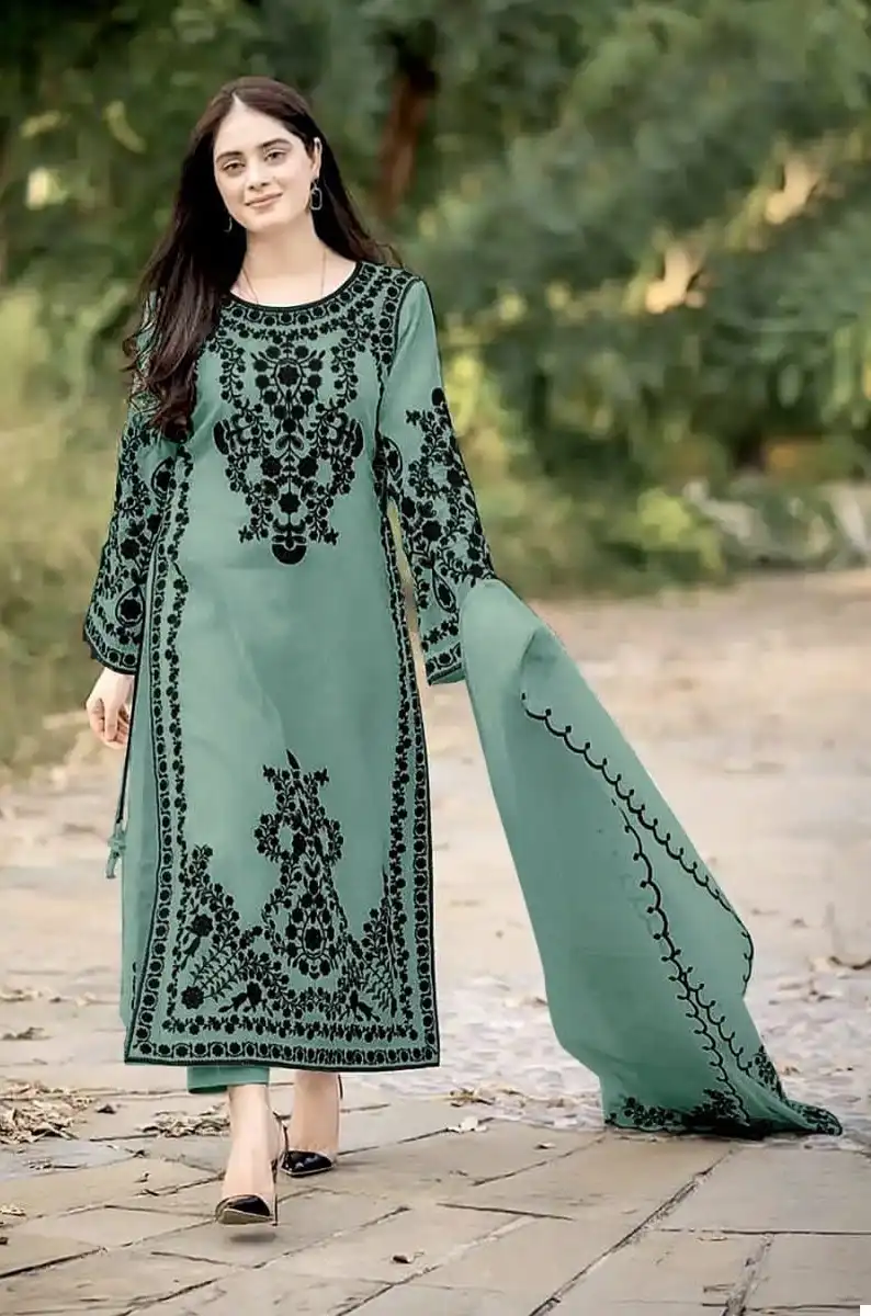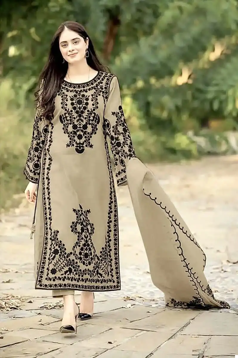 - Bottom: The bottom is made from heavy Dull Santoon, offering comfort and ease of movement. Its versatile design pairs effortlessly with the embroidered top, creating a cohesive and stylish ensemble that exudes elegance and grace.