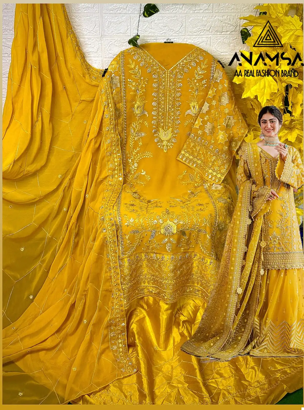 Heavy Pure Fox Georgette Top: The star of this ensemble is the heavy pure fox georgette top, which exudes opulence and charm. Crafted from high-quality material, it features an intricate and mesmerizing design with heavy embroidery and stunning sequence work. The top is a work of art that will make you the center of attention at any event.