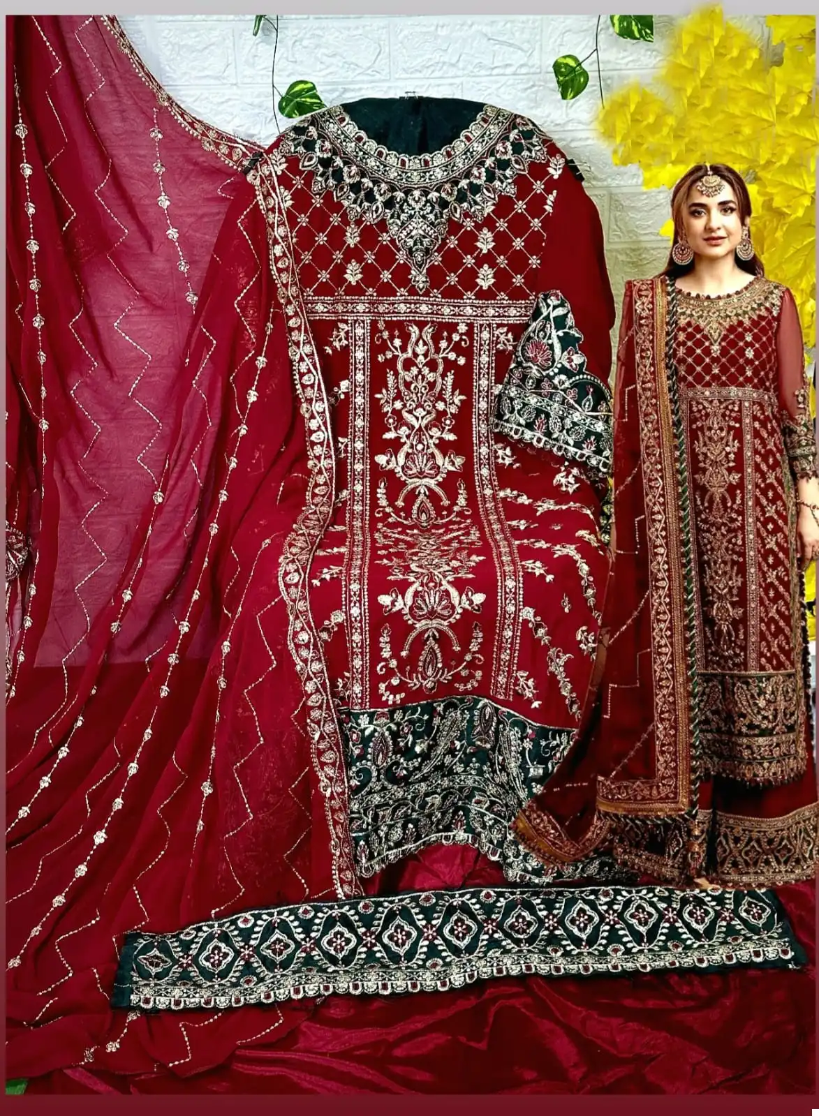 The top of this salwar suit set is made from Heavy Pure Faux Georgette fabric, known for its luxurious look and feel. It features heavy embroidery work with a beautiful design and intricate sequence work. The high-quality material ensures comfort and elegance.