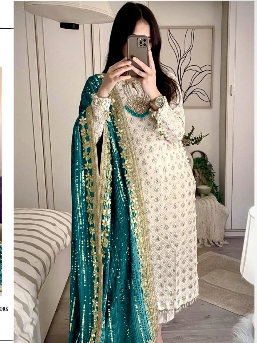 - Dupatta: The ensemble is completed with a very beautiful pure Nazneen chiffon dupatta, decorated with fancy embroidery. The dupatta adds a graceful flow and enhances the overall look.