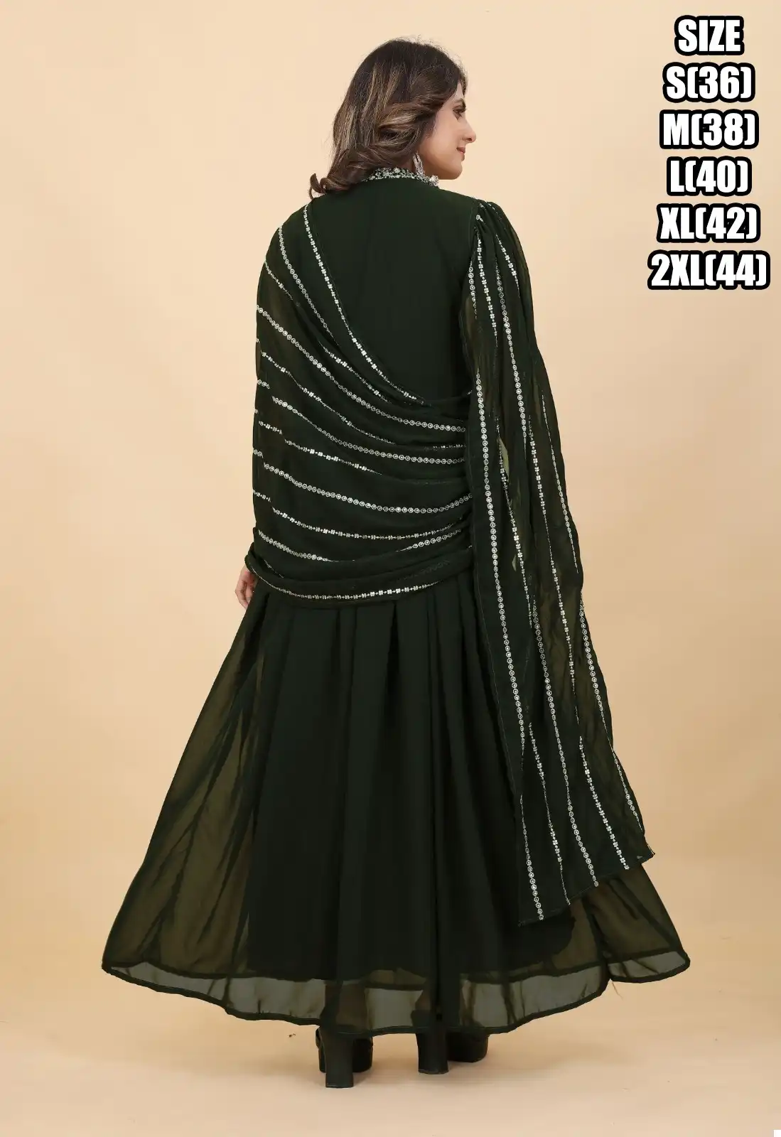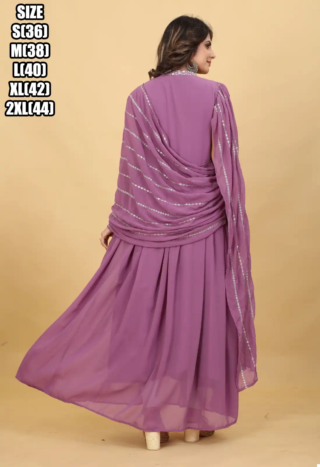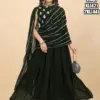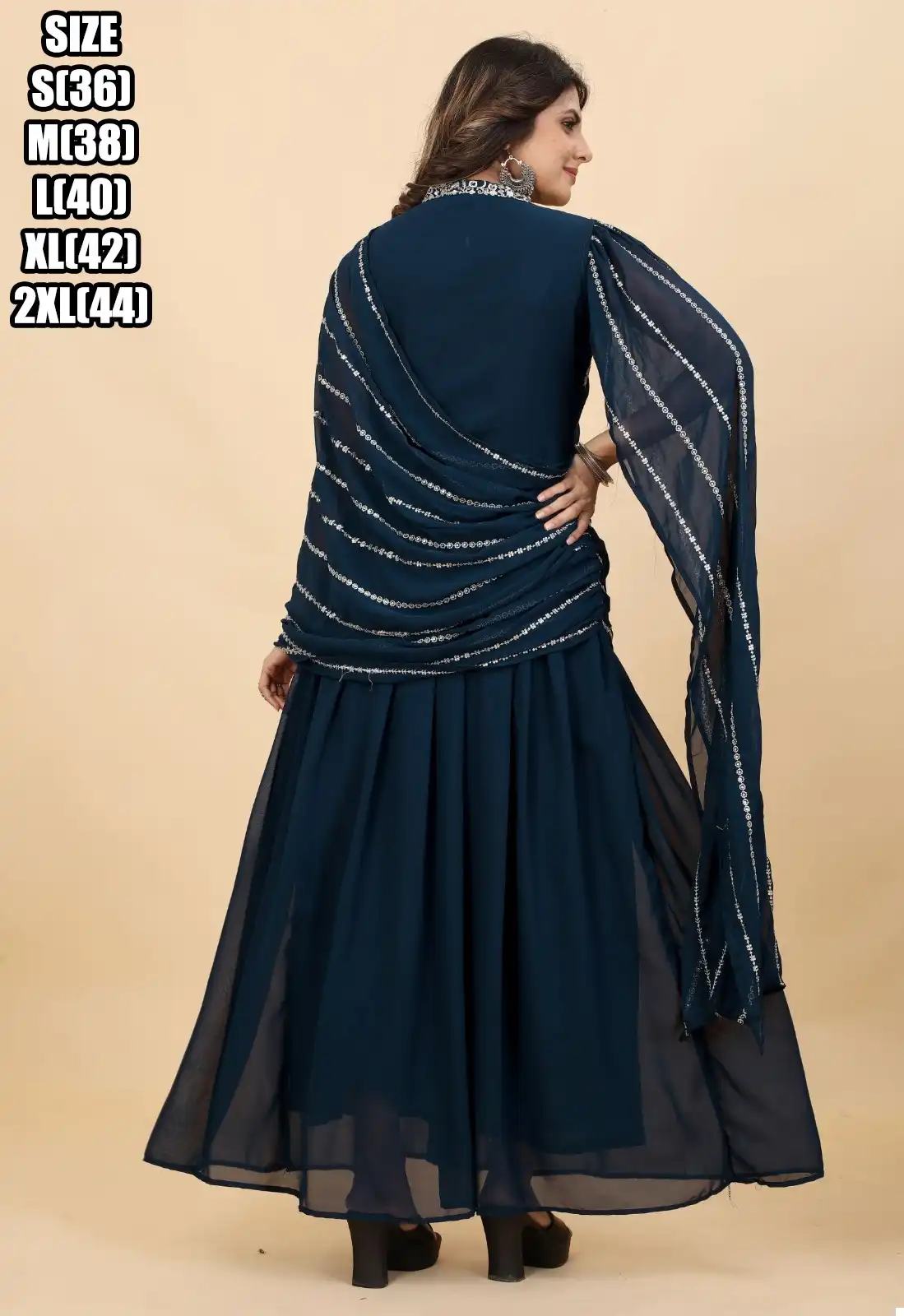 - Top: Described as having heavy georgette embroidery, which suggests a rich, detailed, and possibly elaborate design on a lightweight, sheer, and typically crinkled fabric that is commonly used in evening wear and dressier garments.