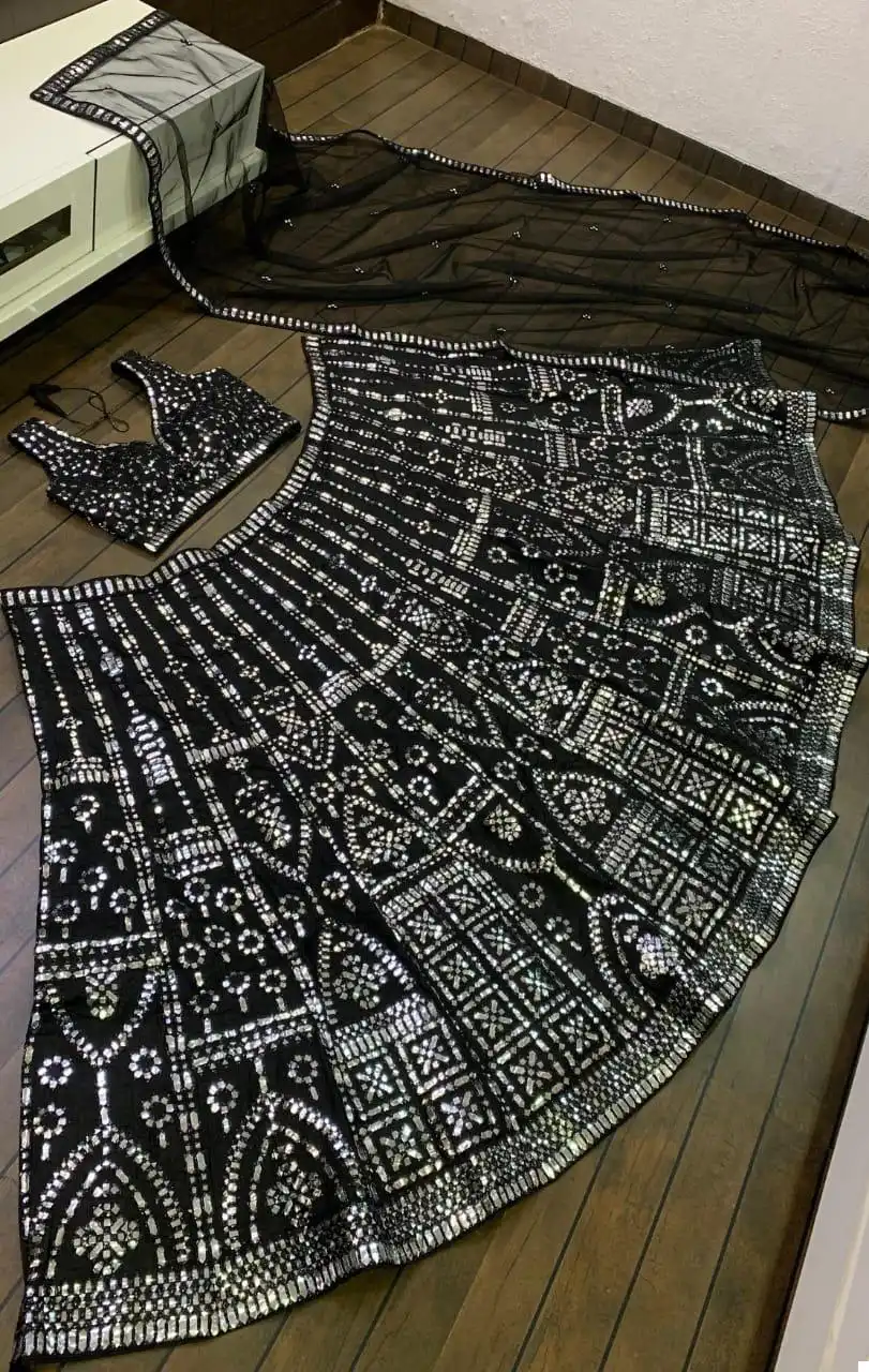 Artistry and Craftsmanship: The intricate paper mirror and thread work on the lehenga and blouse reflect the dedication and skill of our artisans. Each piece is a work of art that tells a story of timeless beauty.