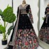 This elegant black lehenga set in faux georgette features thread and sequin work with a micro inner. The semi-stitched lehenga (up to size 44) includes cancan and canvas pata. The unstitched choli has front-and-back embroidery, and the 2.2-meter dupatta is adorned with lace borders. Total weight: 2 kg.