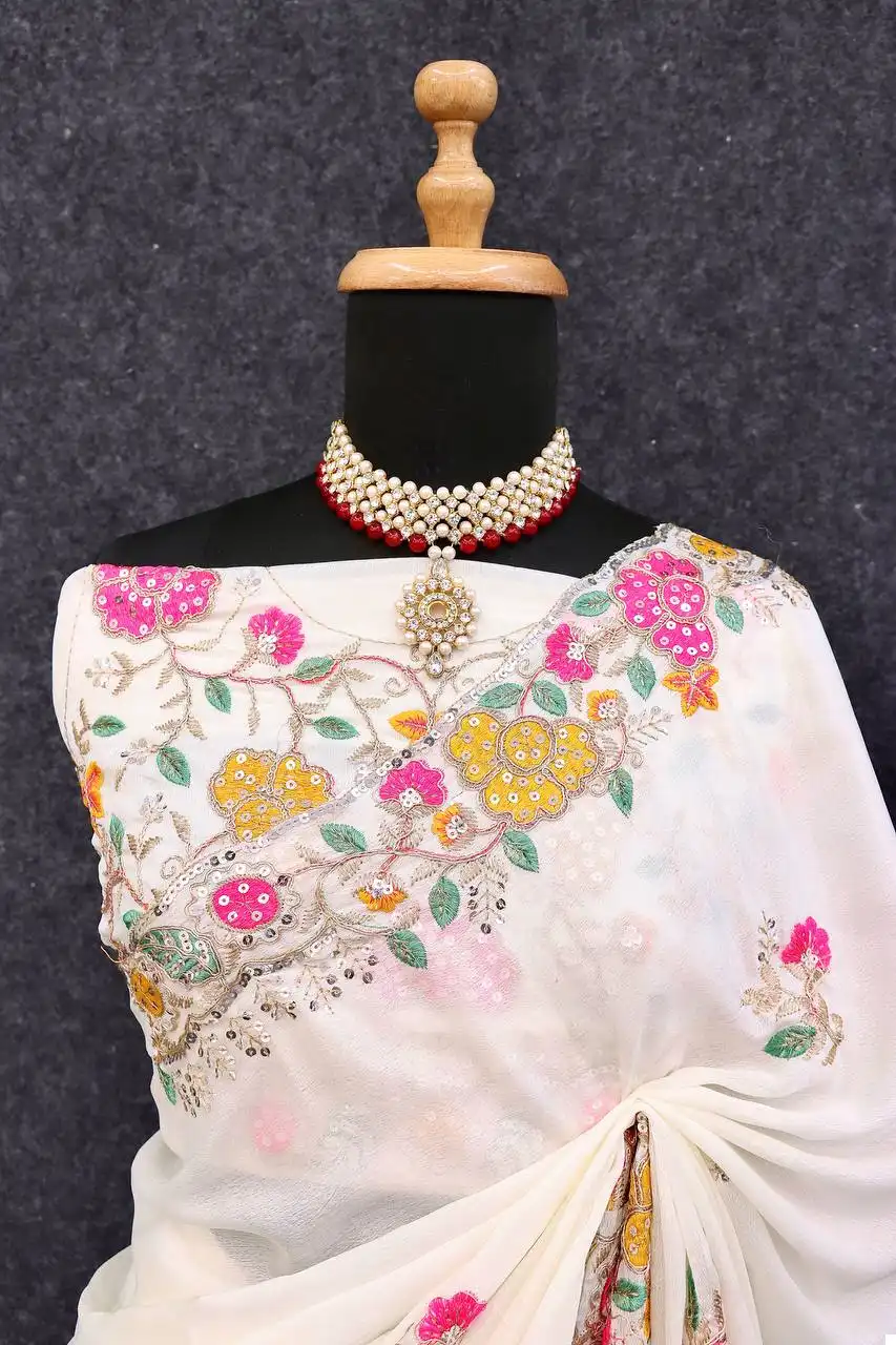 - Saree: Premium Diamond Chinon Silk with Heavy Embroidery Codding Multi Threads & Sequins Work