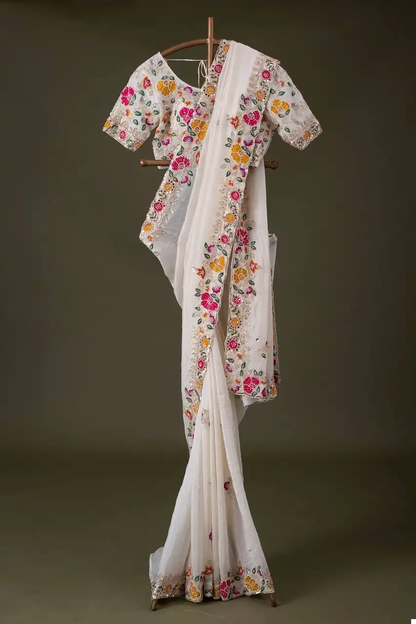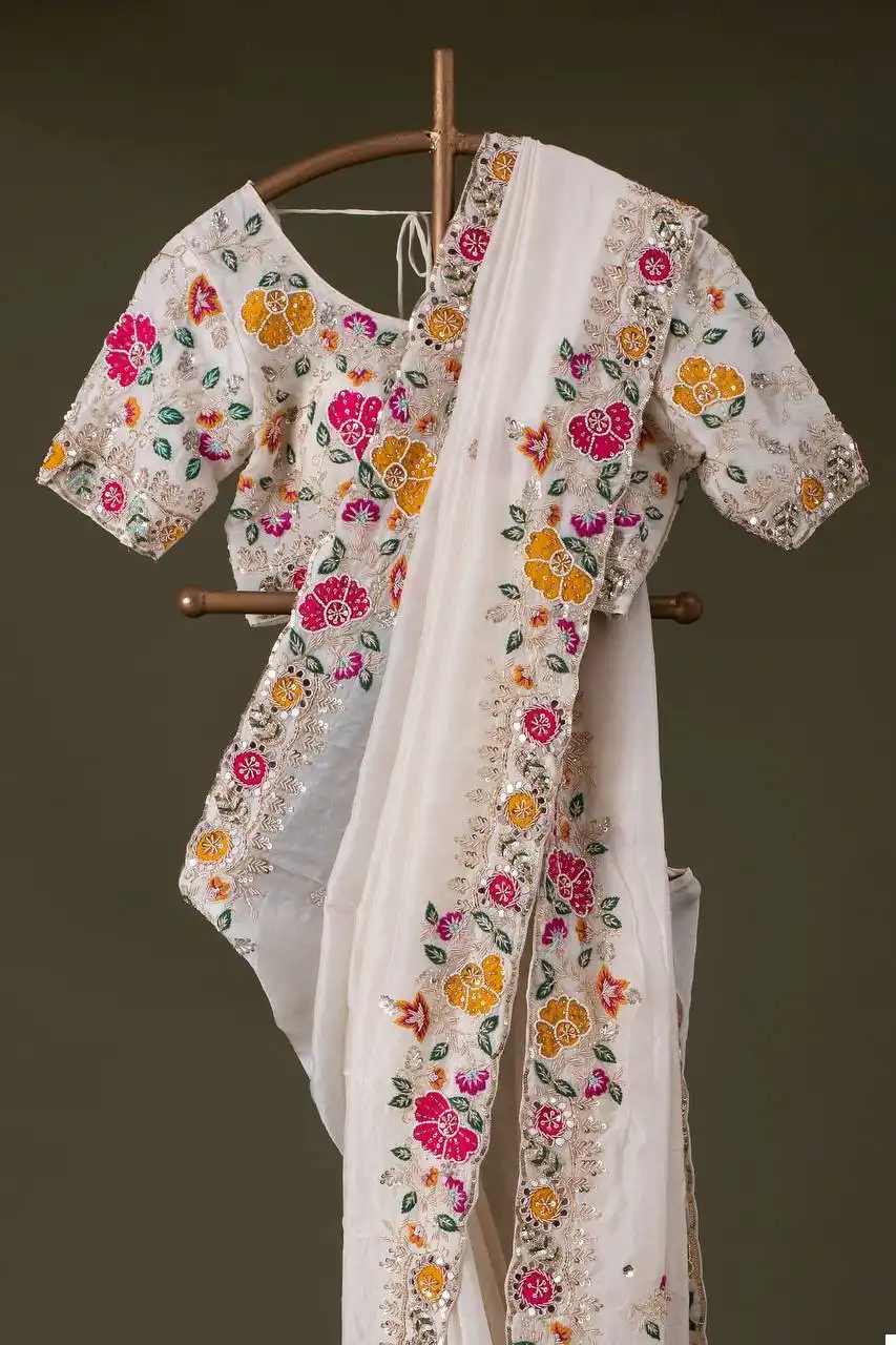 - Blouse: Premium Diamond Chinon Silk with Heavy Embroidery Codding Multi Threads & Sequins Work (Blouse Unstitched)