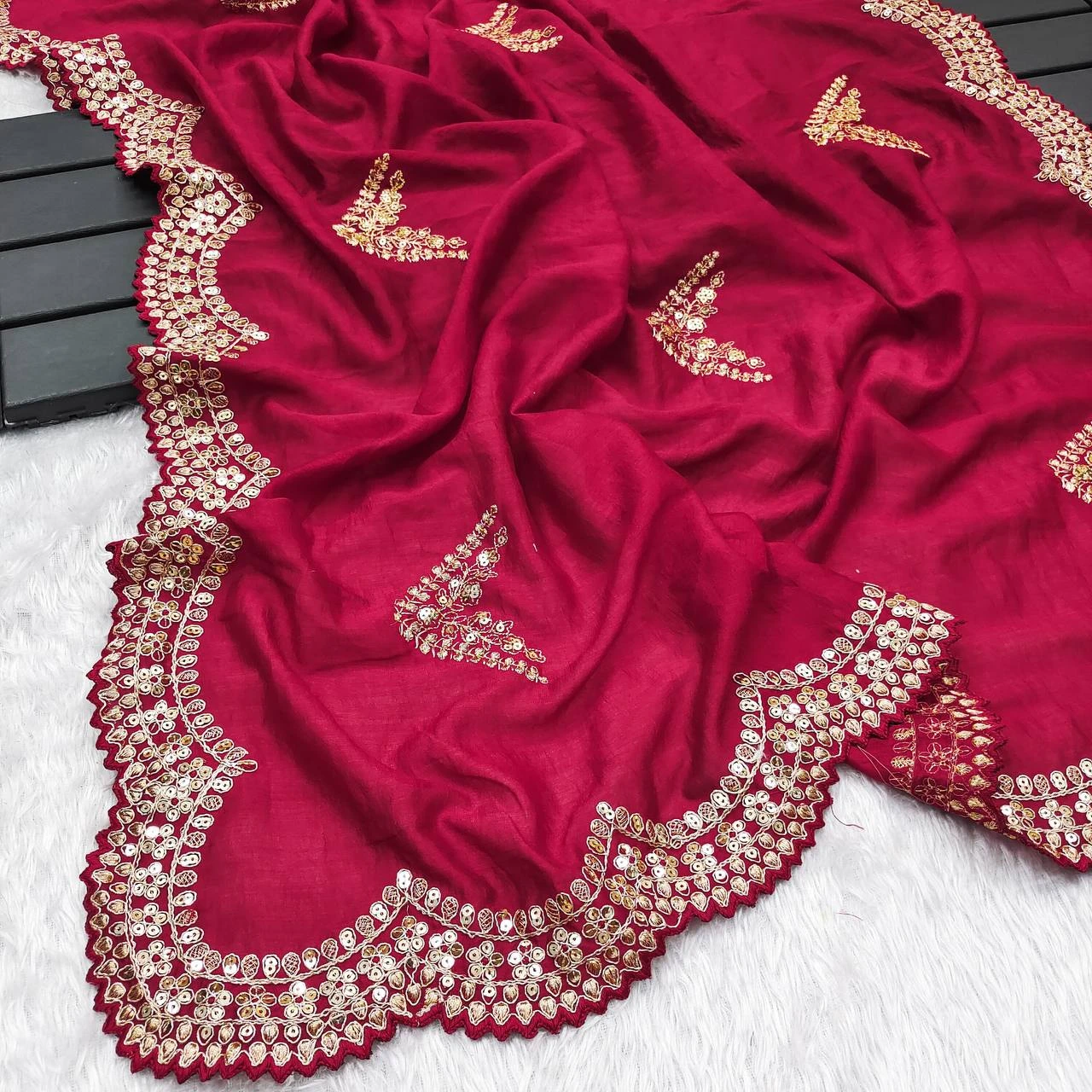 - Description: This saree is crafted from luxurious two-tone Vichitra silk, known for its rich texture and vibrant sheen. It is adorned with intricate embroidery that combines coding and sequin work, creating a dazzling and detailed design. The saree is further enhanced with a cutwork border, adding a touch of modern elegance to its traditional charm.