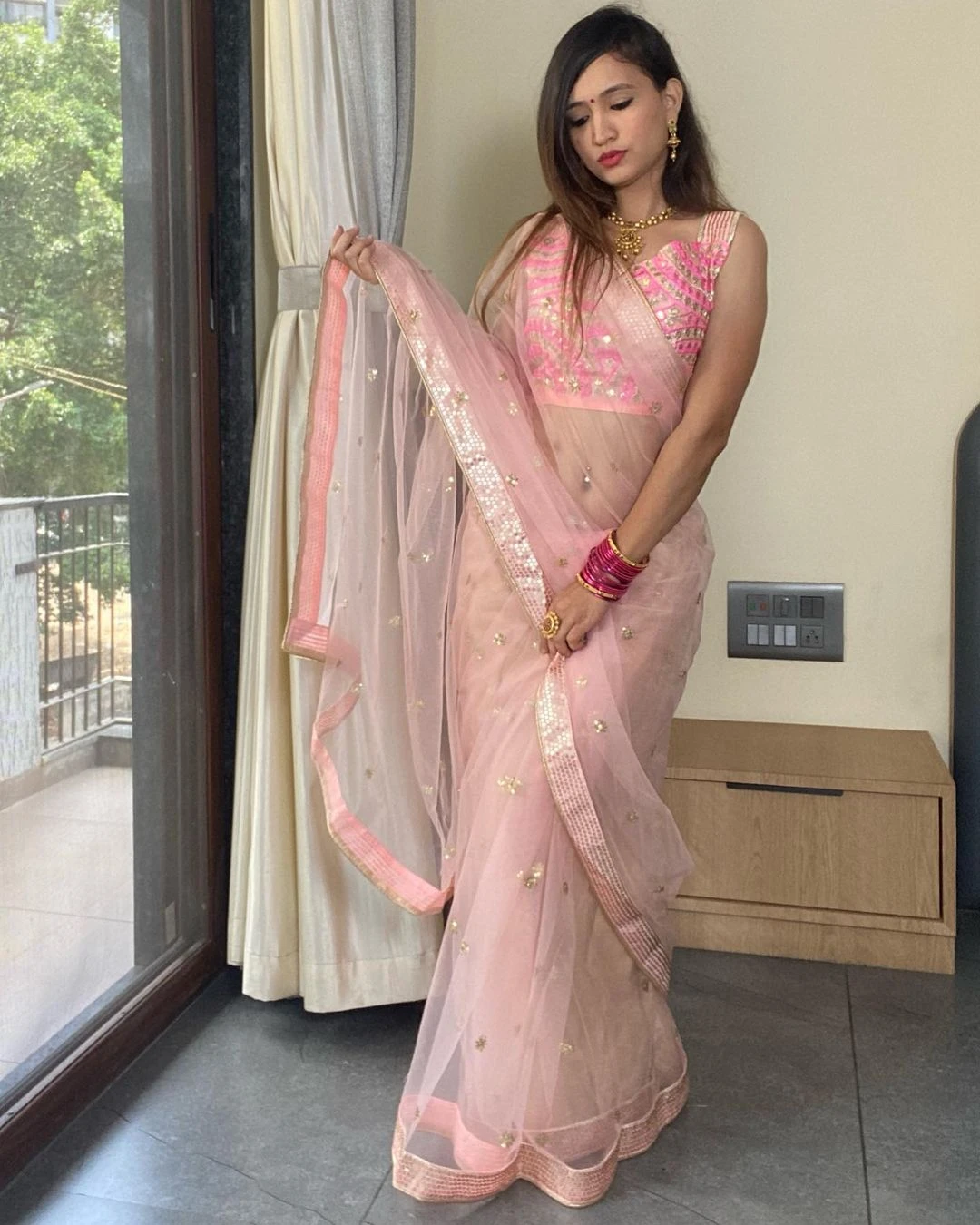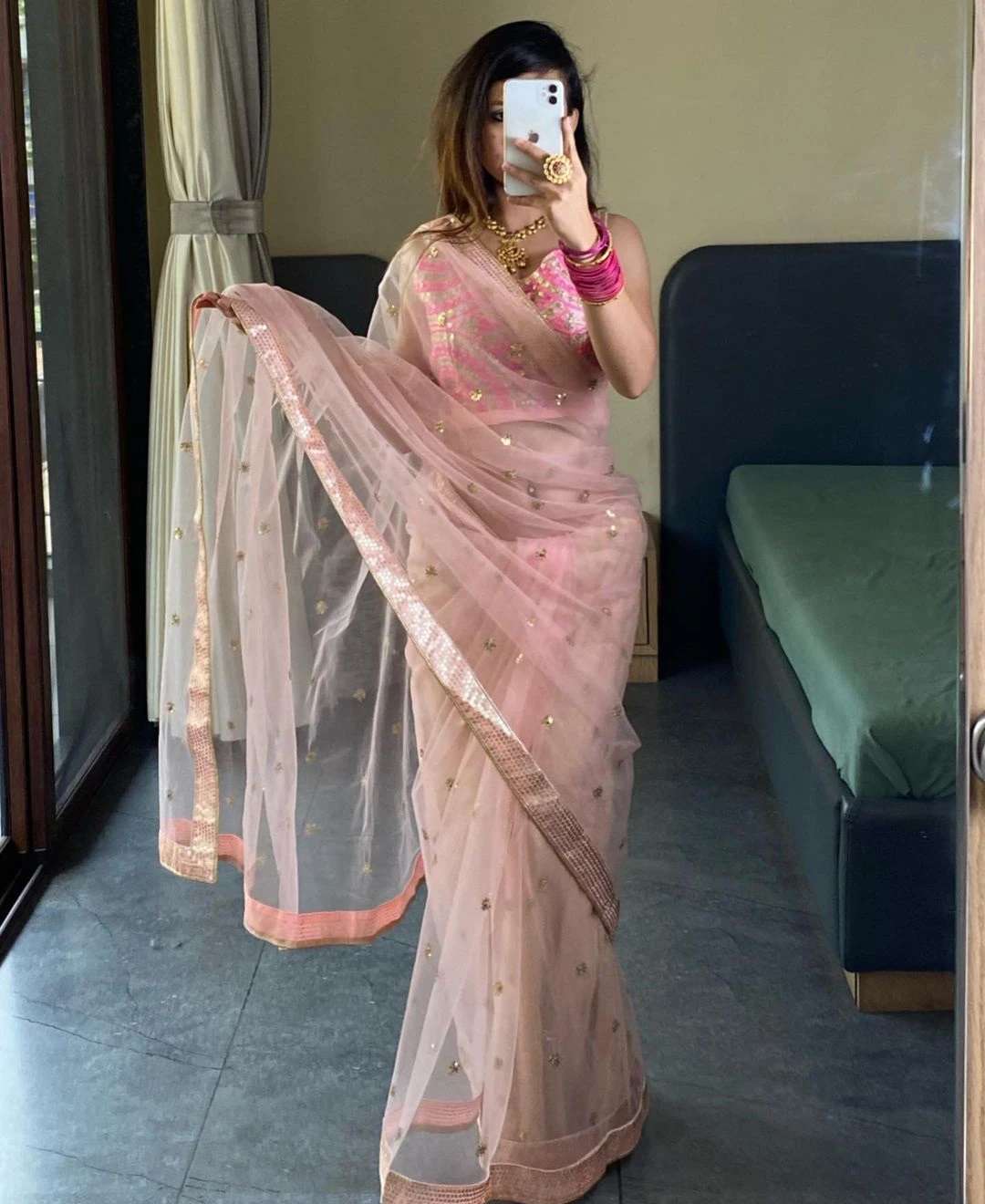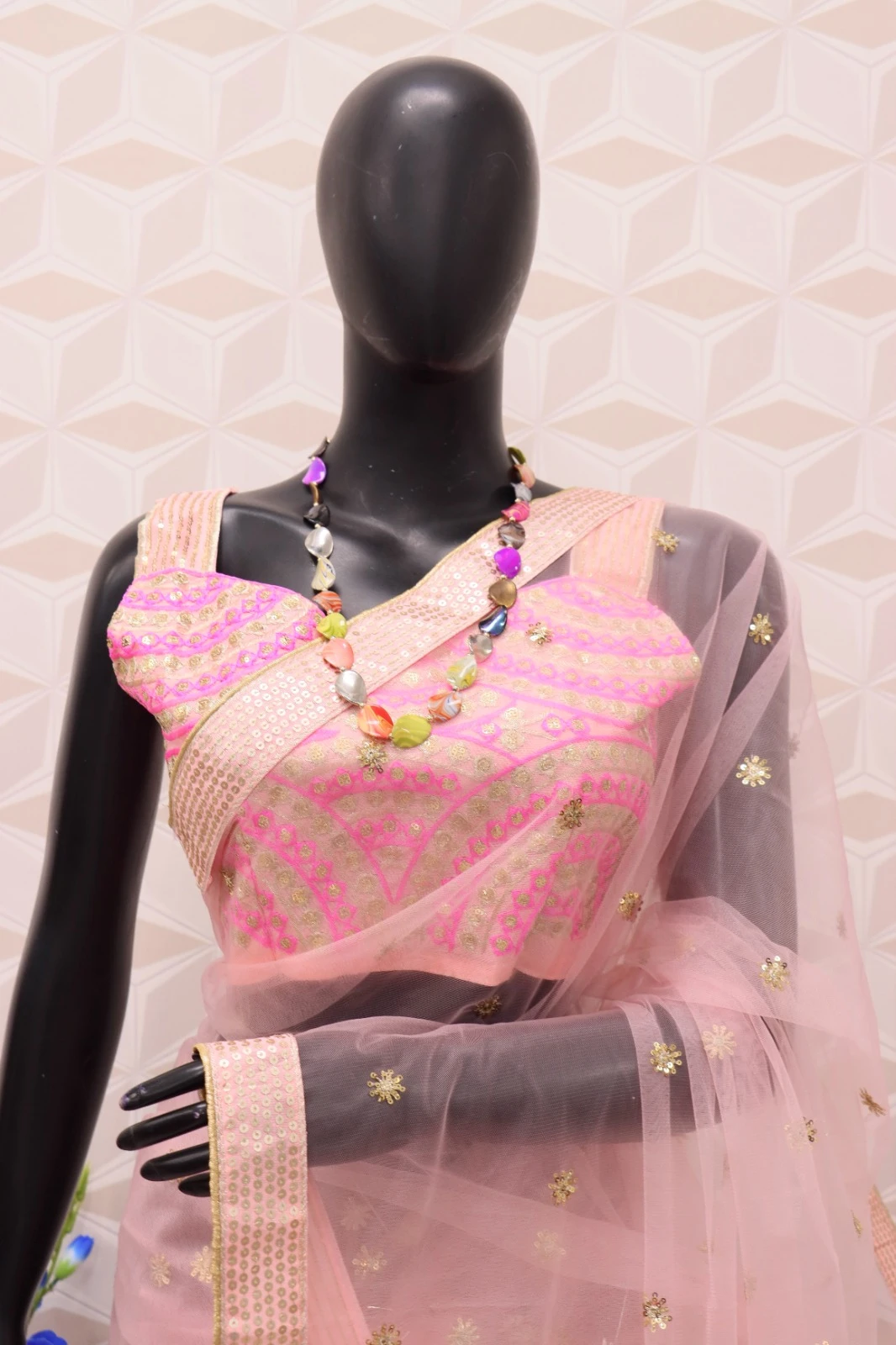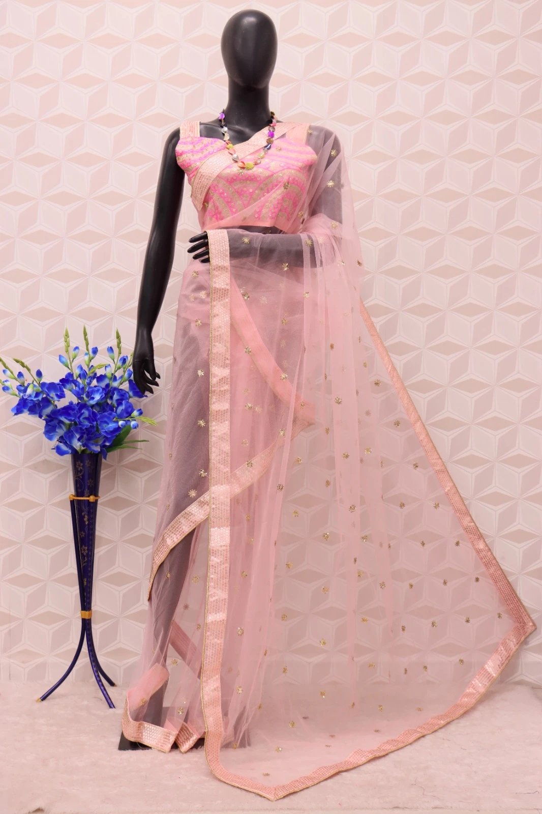 👚 Blouse: Made from heavy Thai silk, featuring intricate multi-thread lace and sequin work that complements the saree beautifully.