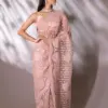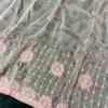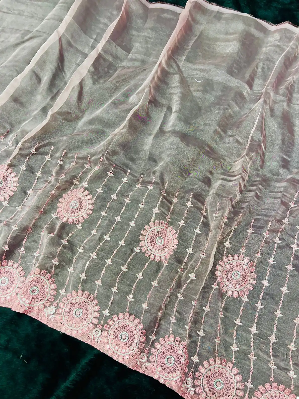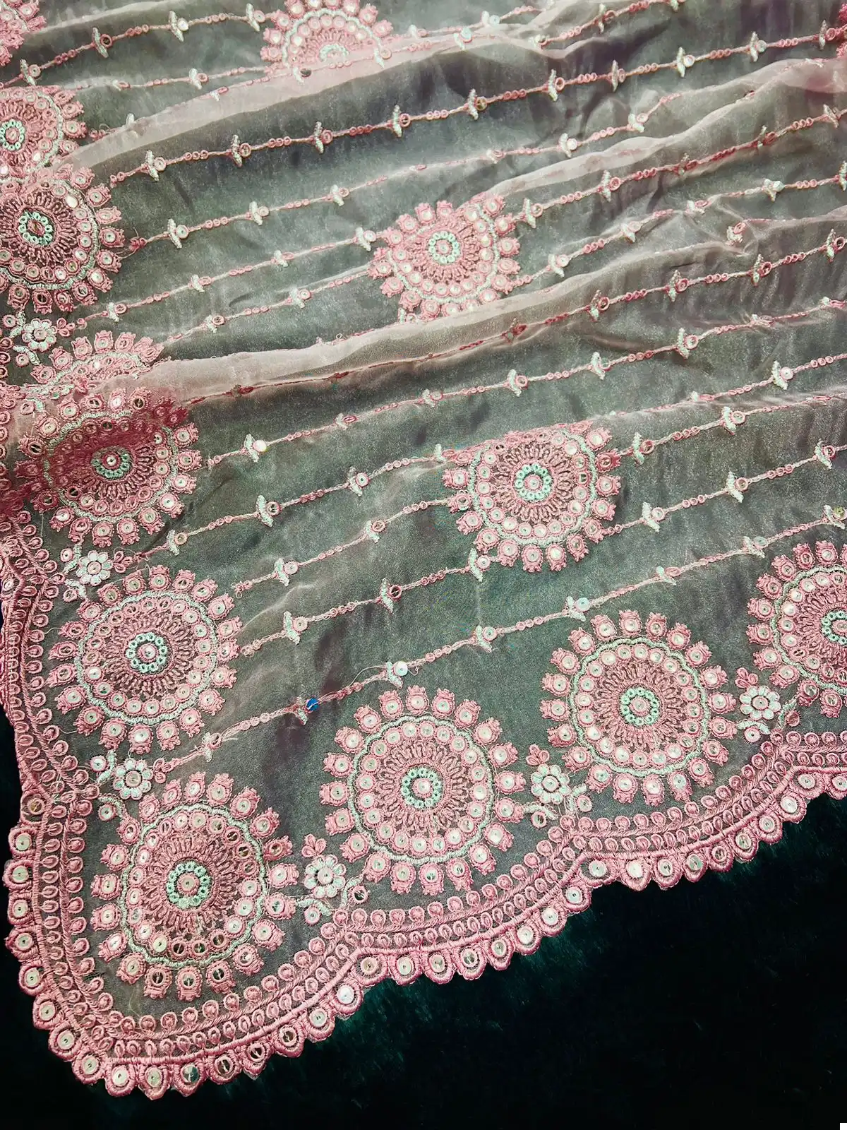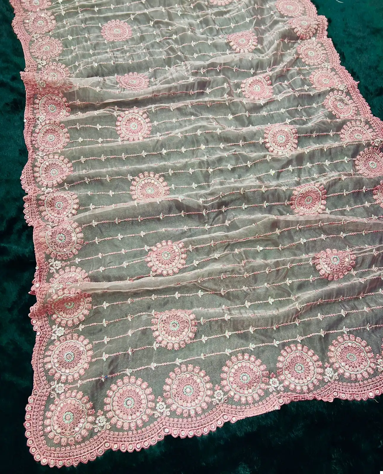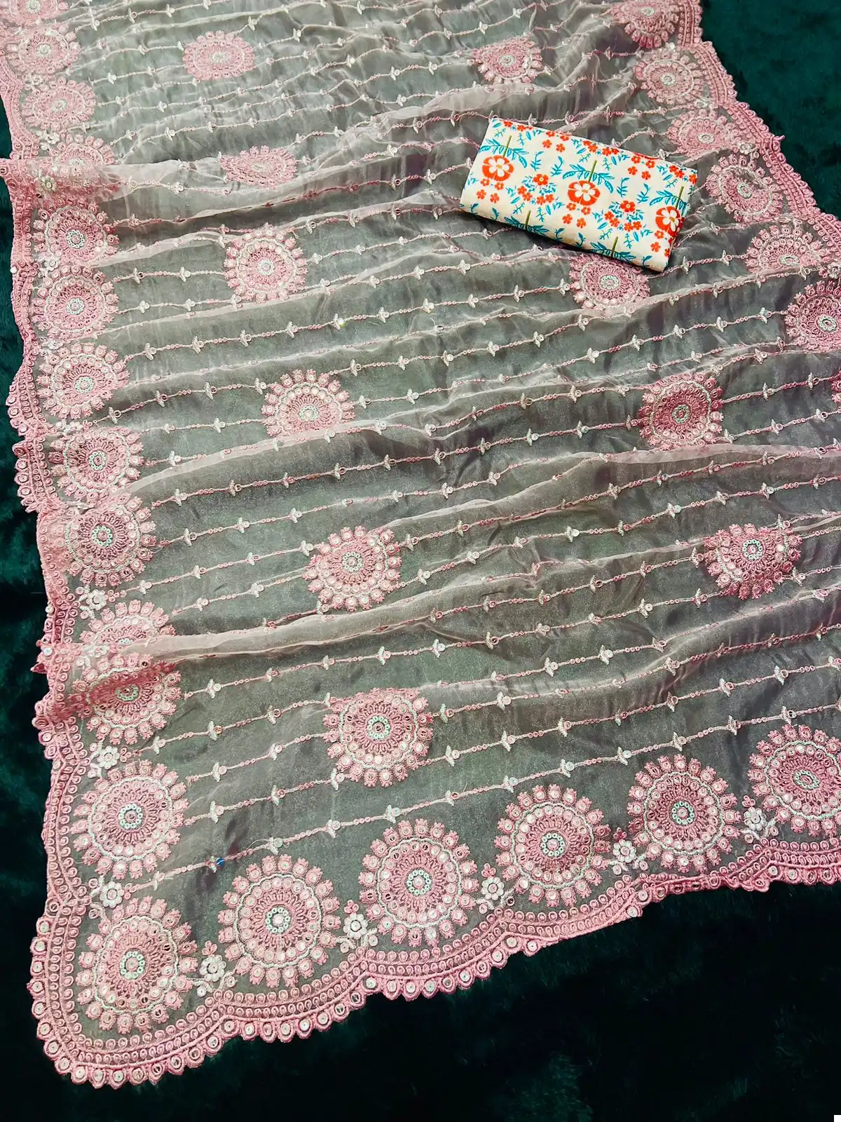 - Saree: The saree is made from soft organza silk, a fabric renowned for its delicate yet firm texture. It features multi-thread embroidery interspersed with 7+5 mm sequins across 5.50 meters, adding sparkle and elegance to the exquisite drape.