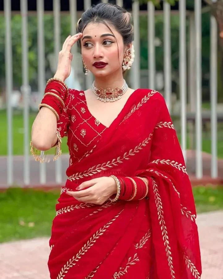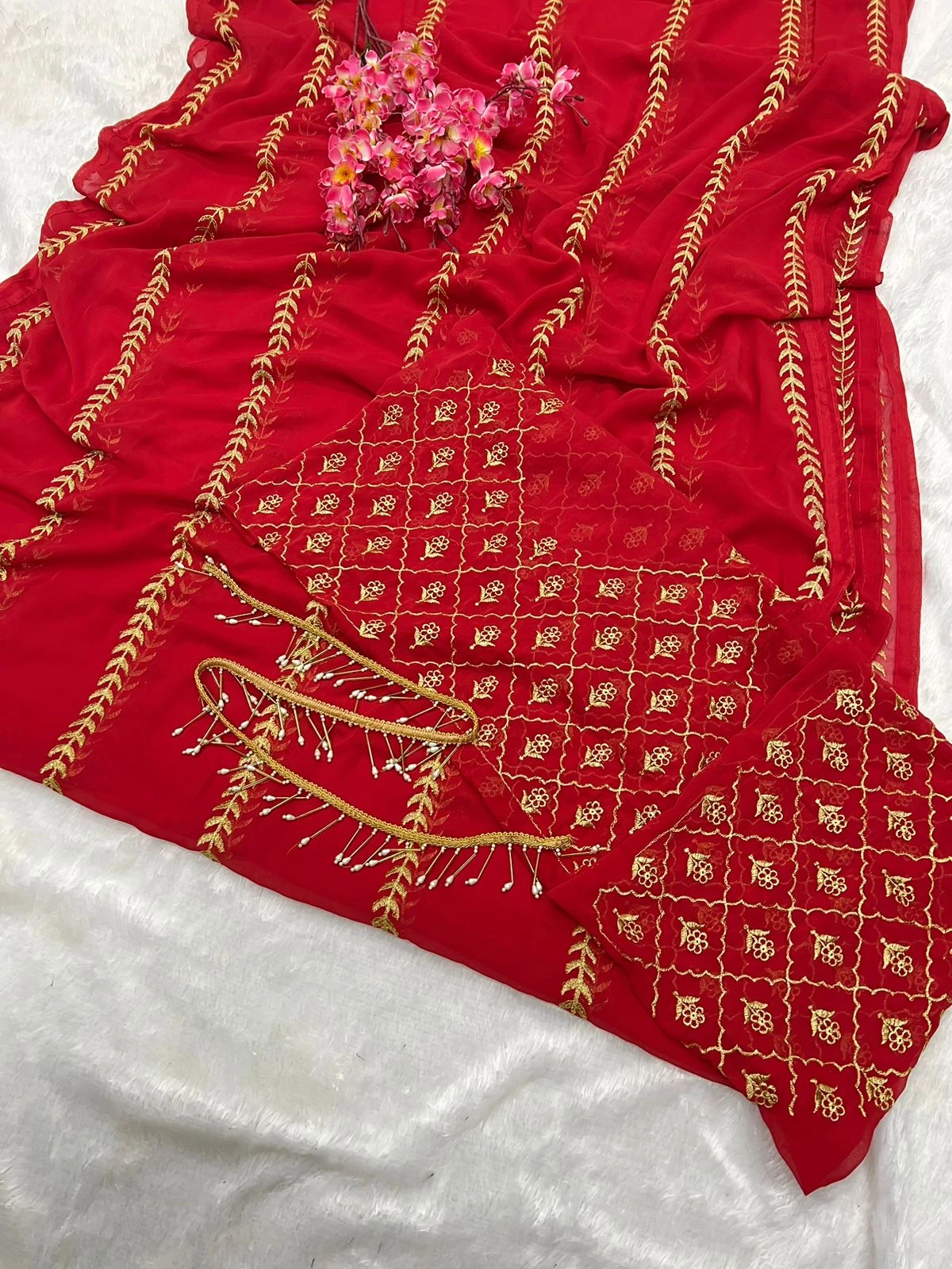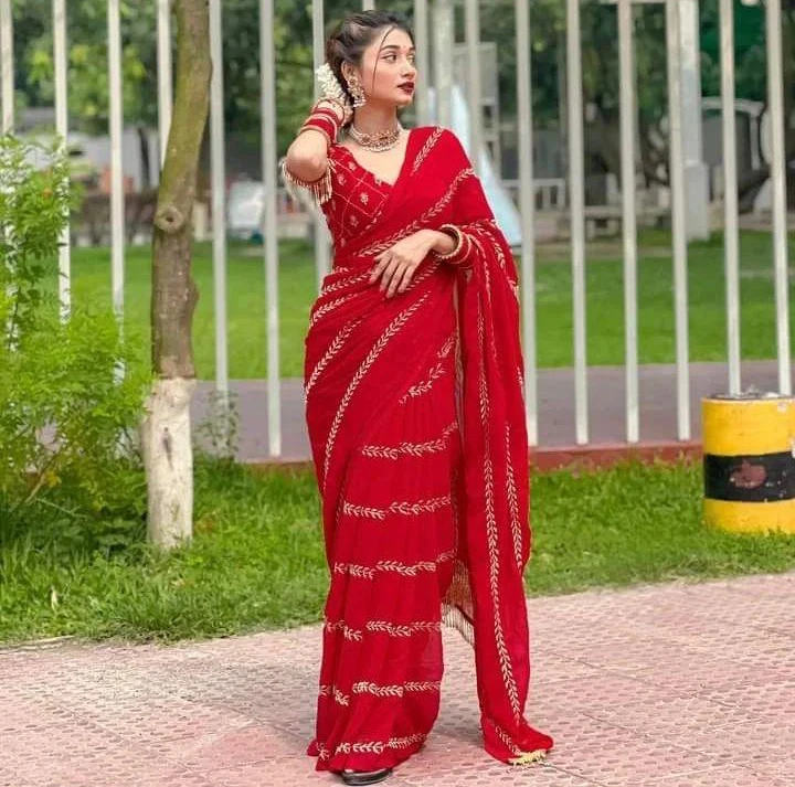 This saree set features a georgette saree with intricate embroidery using thread and zari work, measuring 5.50 meters. The blouse, also made of georgette, includes similar embroidery with thread and zari work, complemented by zalar lace, and measures 0.90 meters. Each piece is priced at ₹1170 and can be picked and chosen individually.