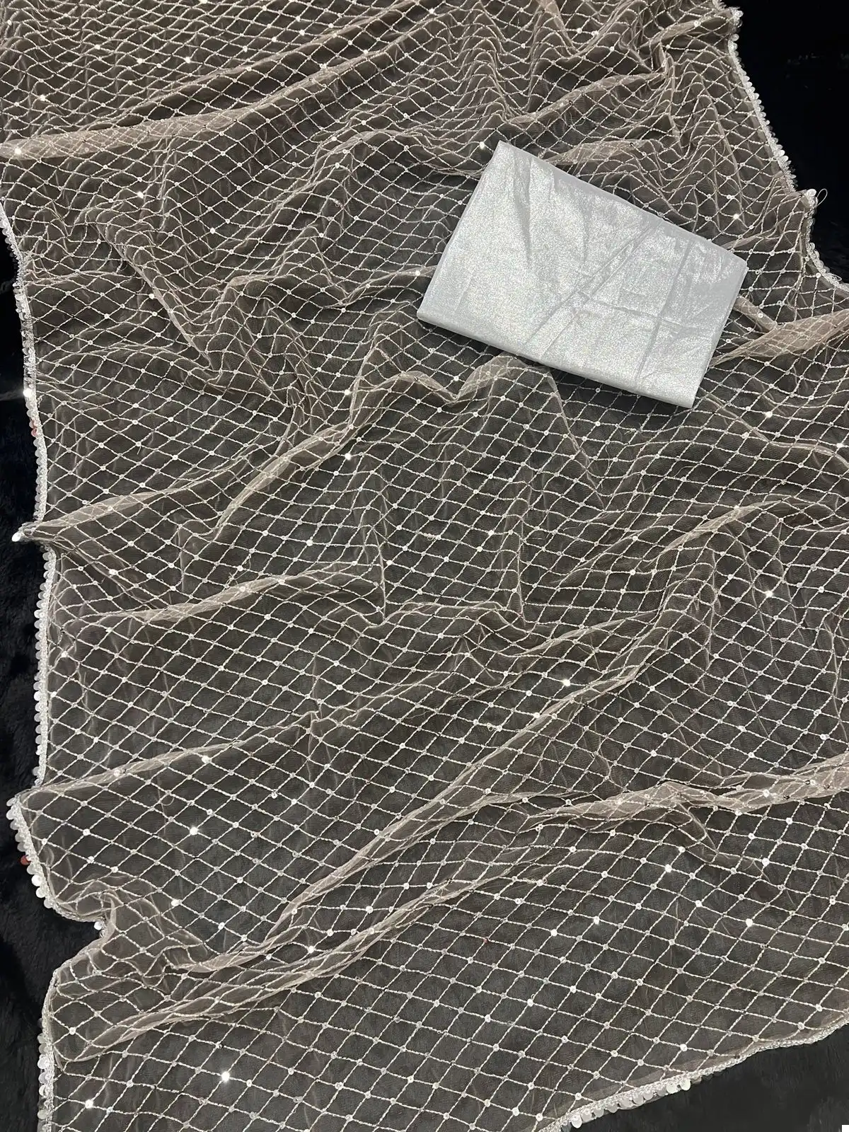 - Saree: Heavy Nylon Butterfly Net Fancy Multi & Sequence Work with Sequence Attached Lace Border (Length: 5.50 meters)
