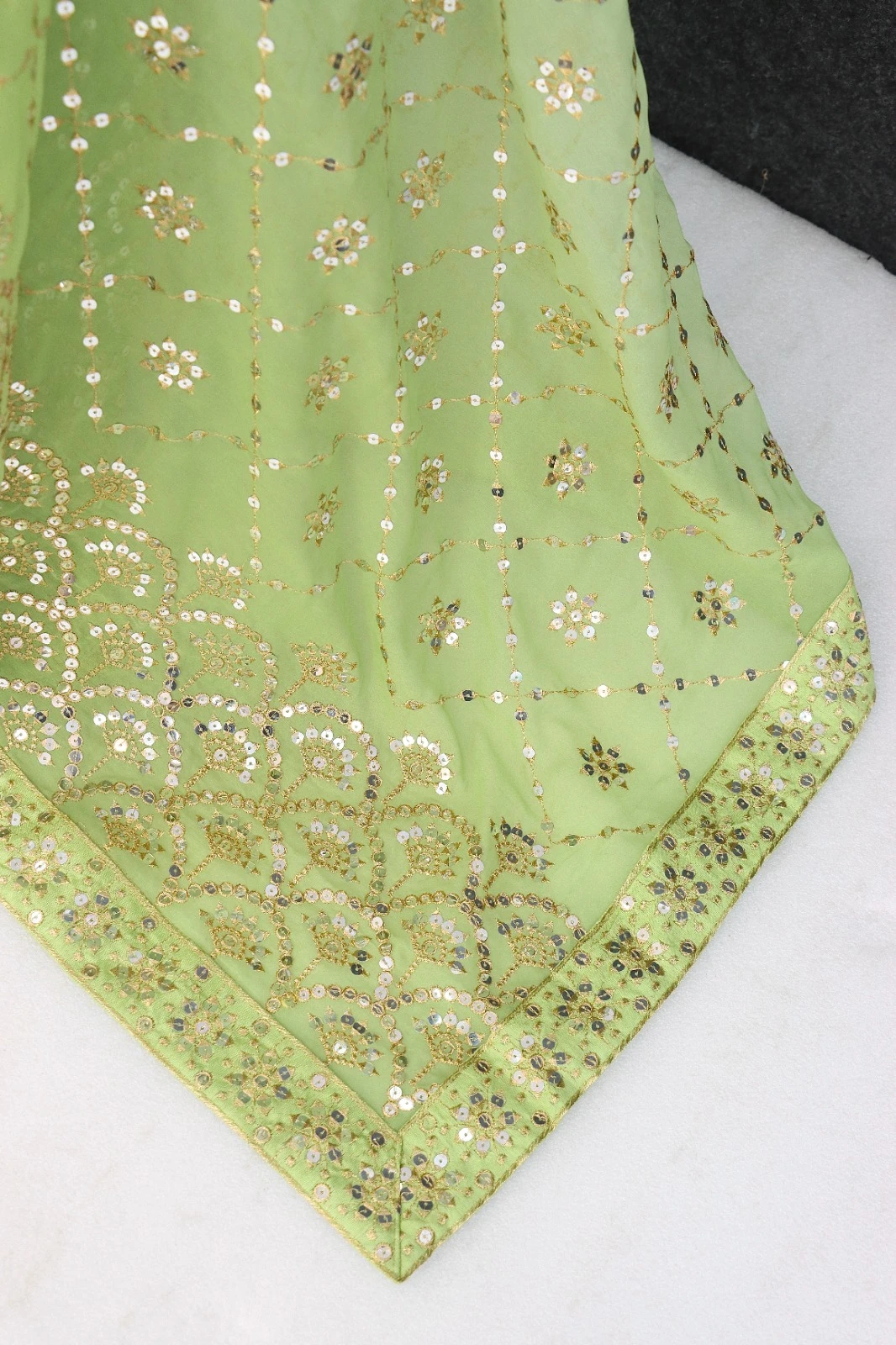 - Description: This saree is crafted from premium soft georgette fabric, known for its lightweight and flowy texture. It features stunning 7 mm embroidery with heavy sequin and thread work, creating a dazzling effect. The saree is finished with a delicate lace border, adding to its overall elegance and sophistication.
