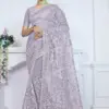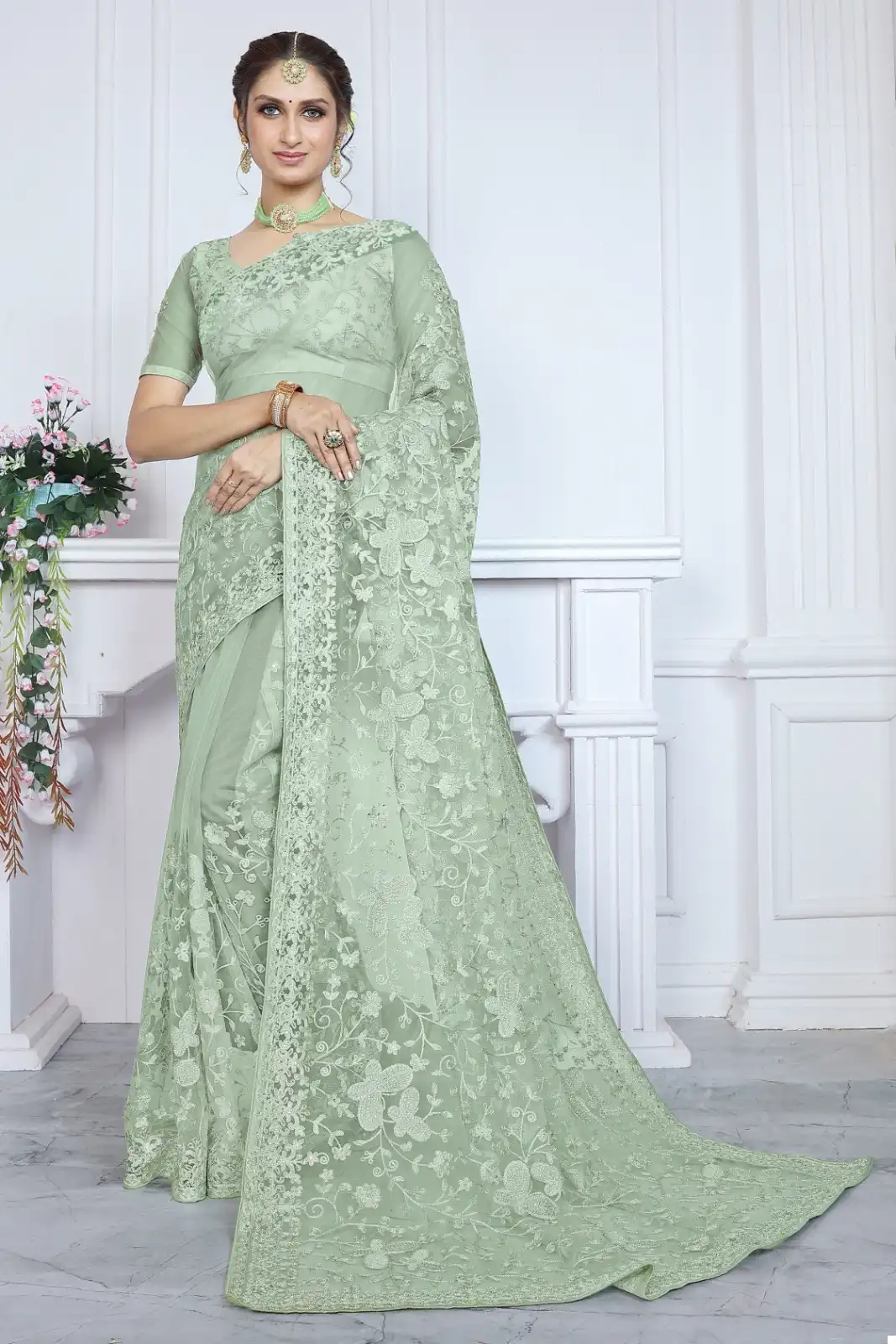 - Description: Beautiful Multi-Color Aari Embroidery Work With Stone Work. The saree features intricate embroidery done with the Aari technique, which involves hand embroidery using a special needle. Stone work adds embellishment and enhances the overall look.