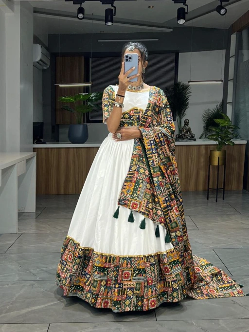 Buy Vardan Ethnic Navratri Full Stitched Chaniya Choli Collection online at a wholesale rate. This ready-to-wear lehenga set features pure rayon cotton fabric with foil and patchwork detailing, perfect for festive and traditional events.