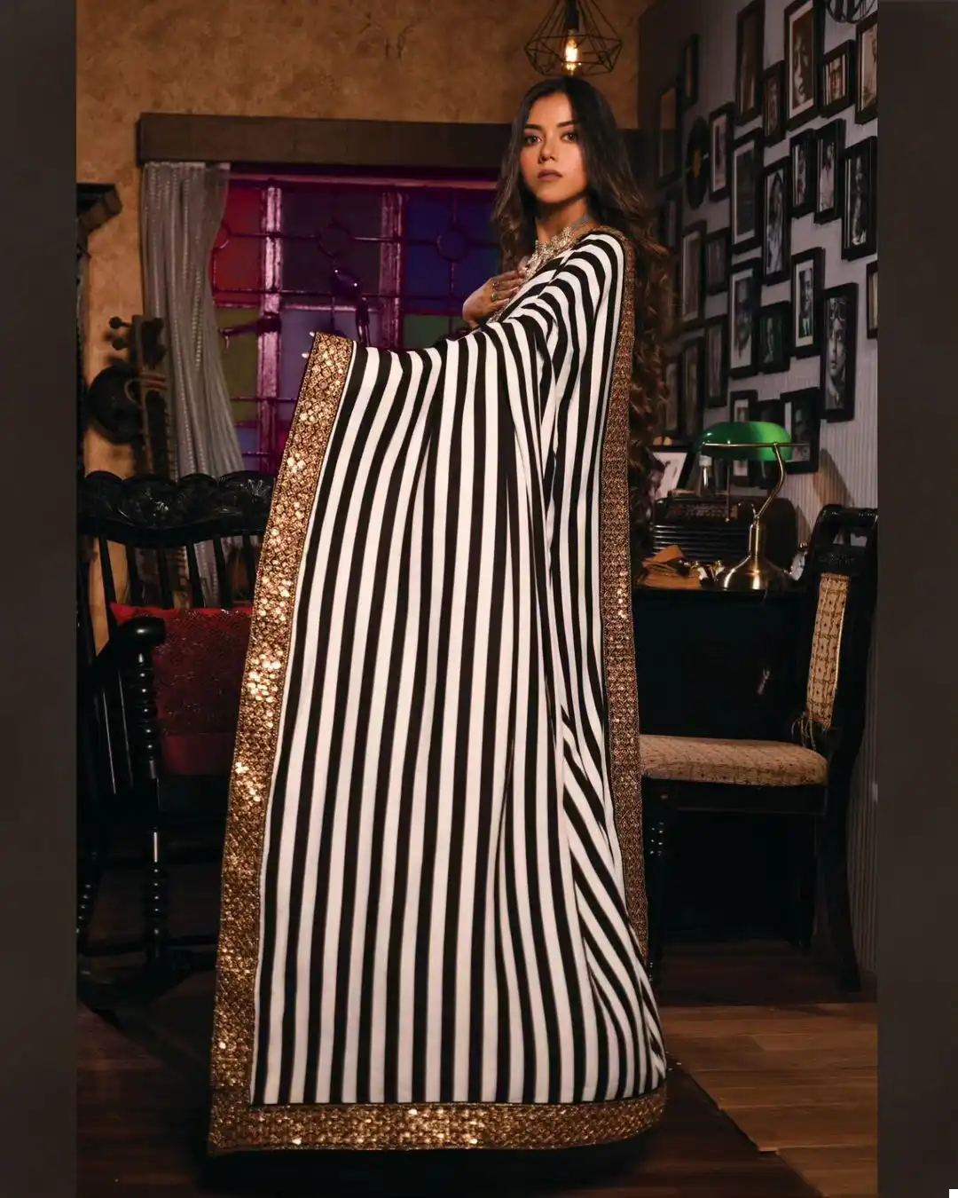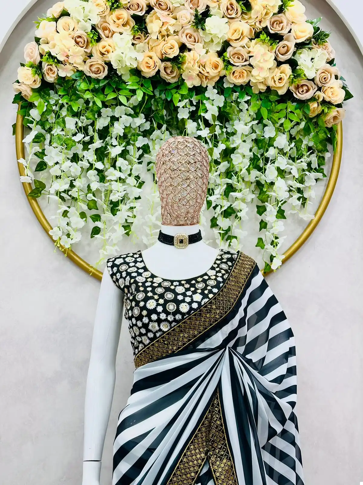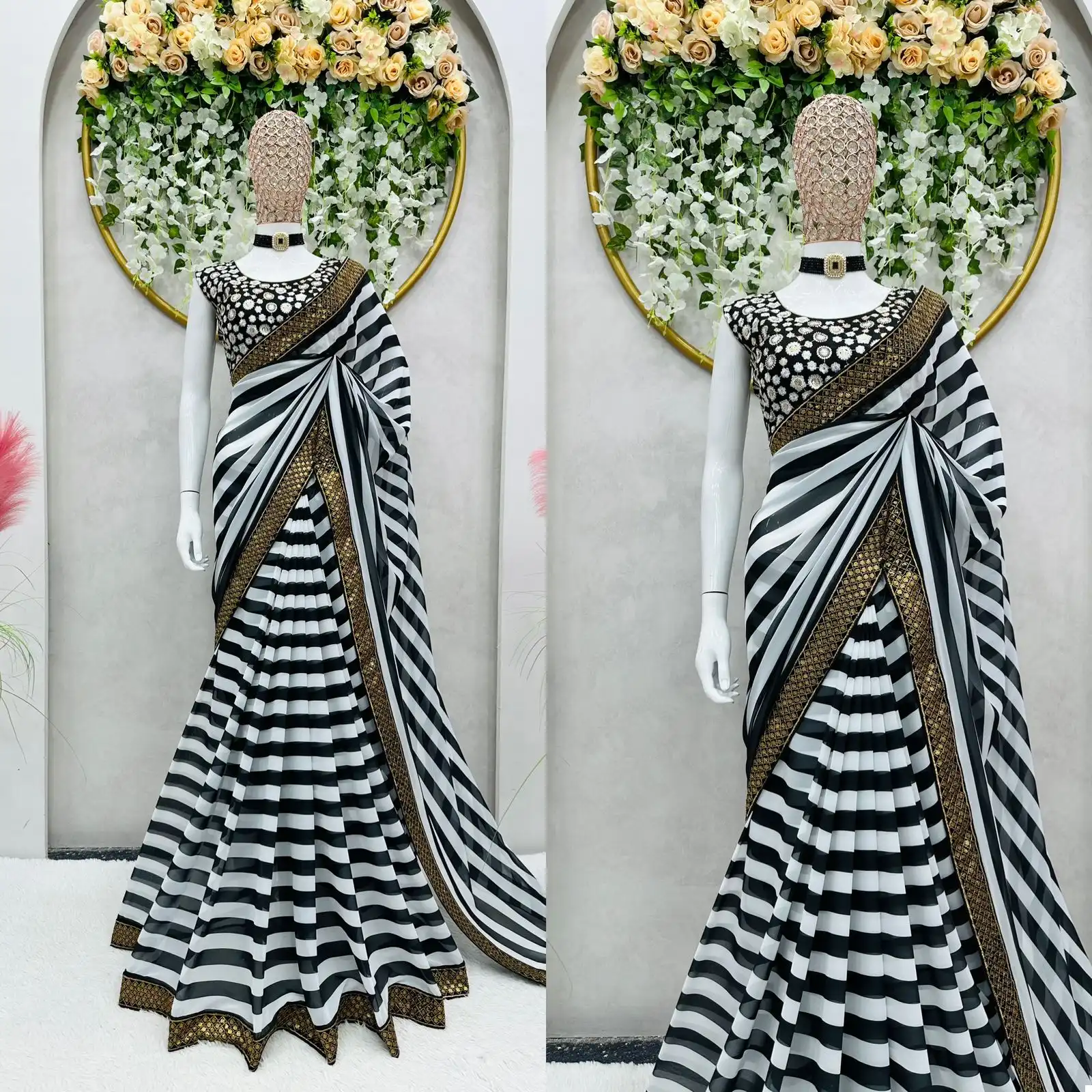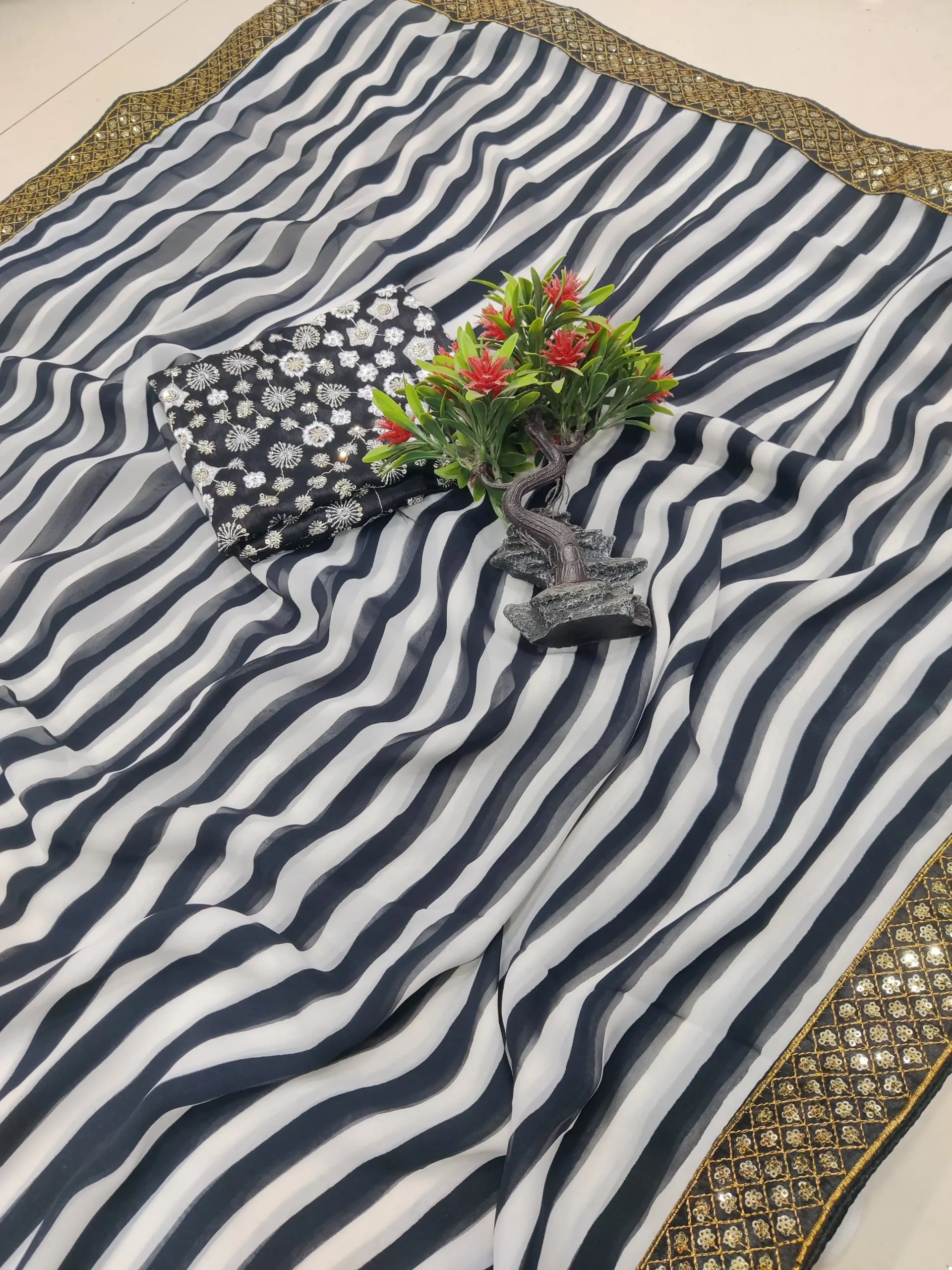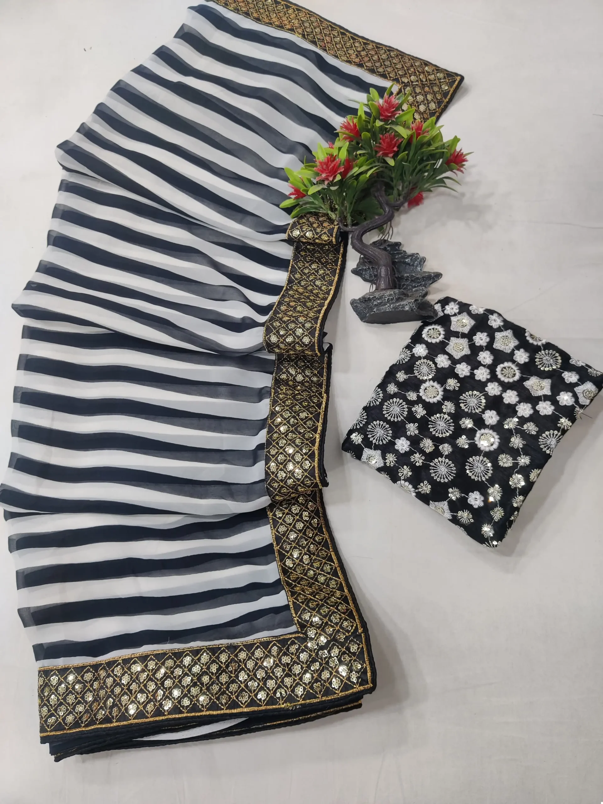 Saree: The saree boasts a stunning combination of printed georgette fabric, heavy embroidery work, and intricate lace detailing. With a generous length of 5.50 meters, it offers graceful draping and effortless elegance. The exquisite embroidery adds a touch of glamour to the overall look, making it perfect for special occasions and festive celebrations.
