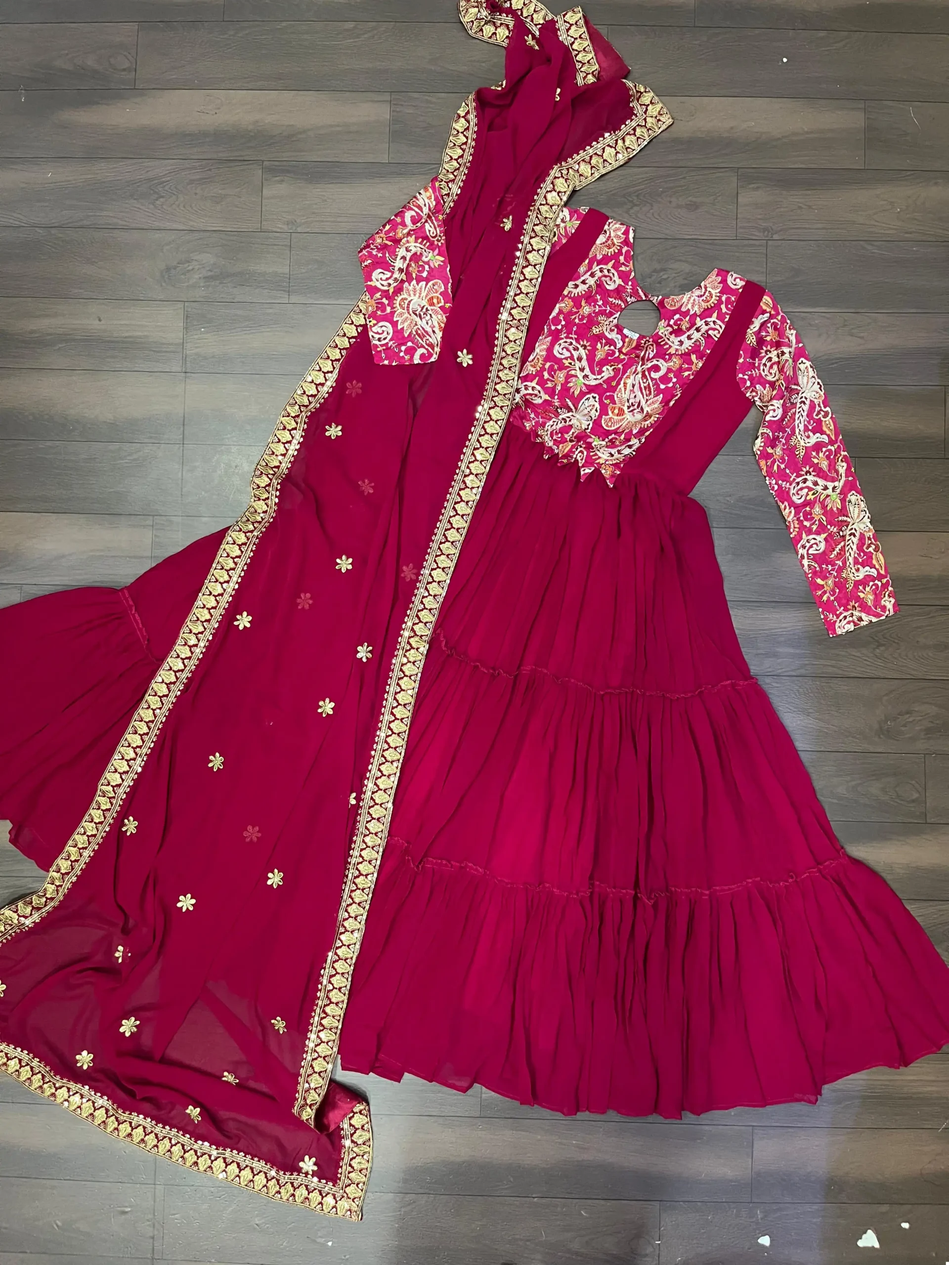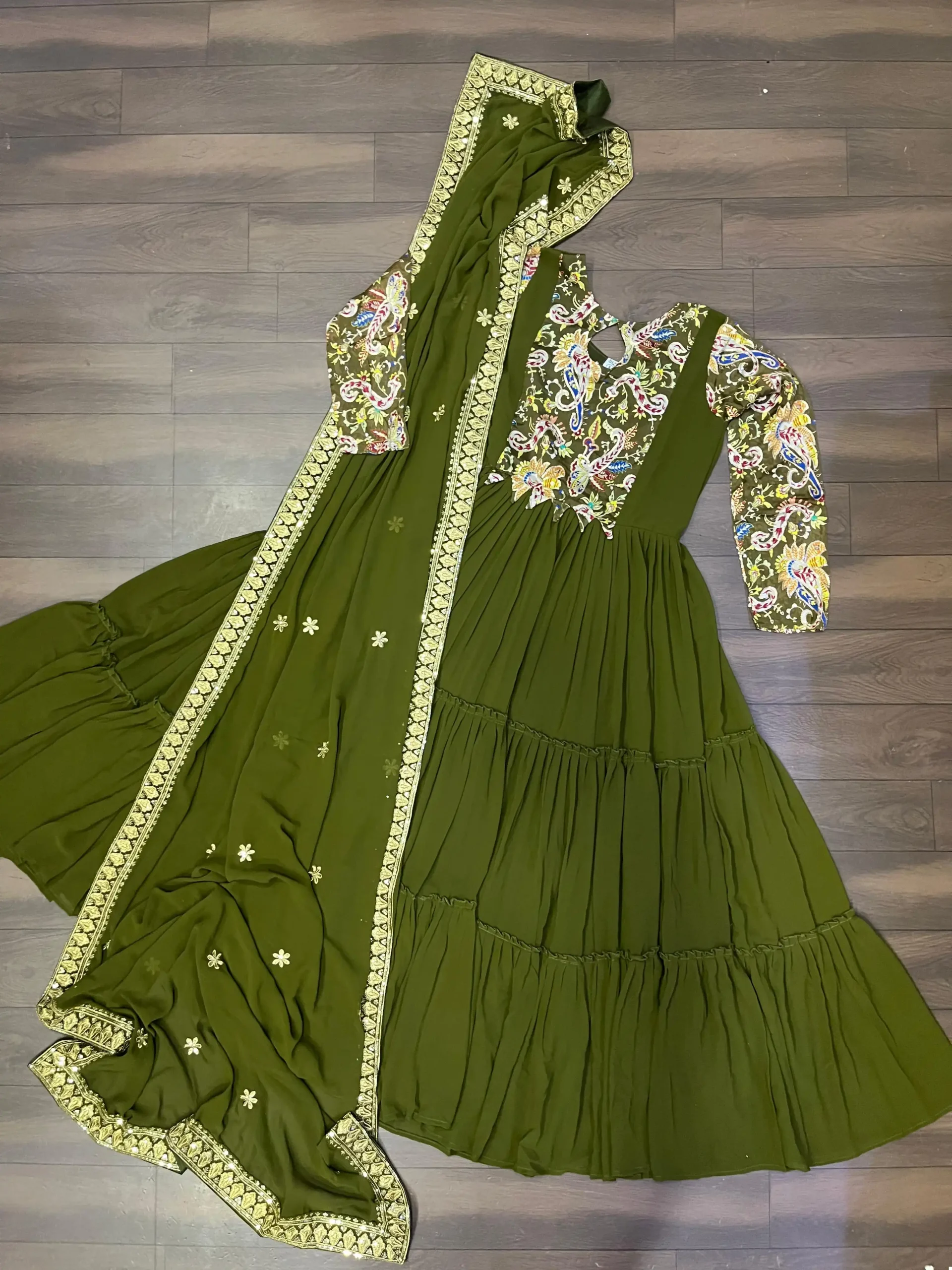 - Dupatta: Made of Faux Georgette with designer sequins embroidered work and sequins lace patta, measuring 2.30 meters.