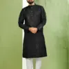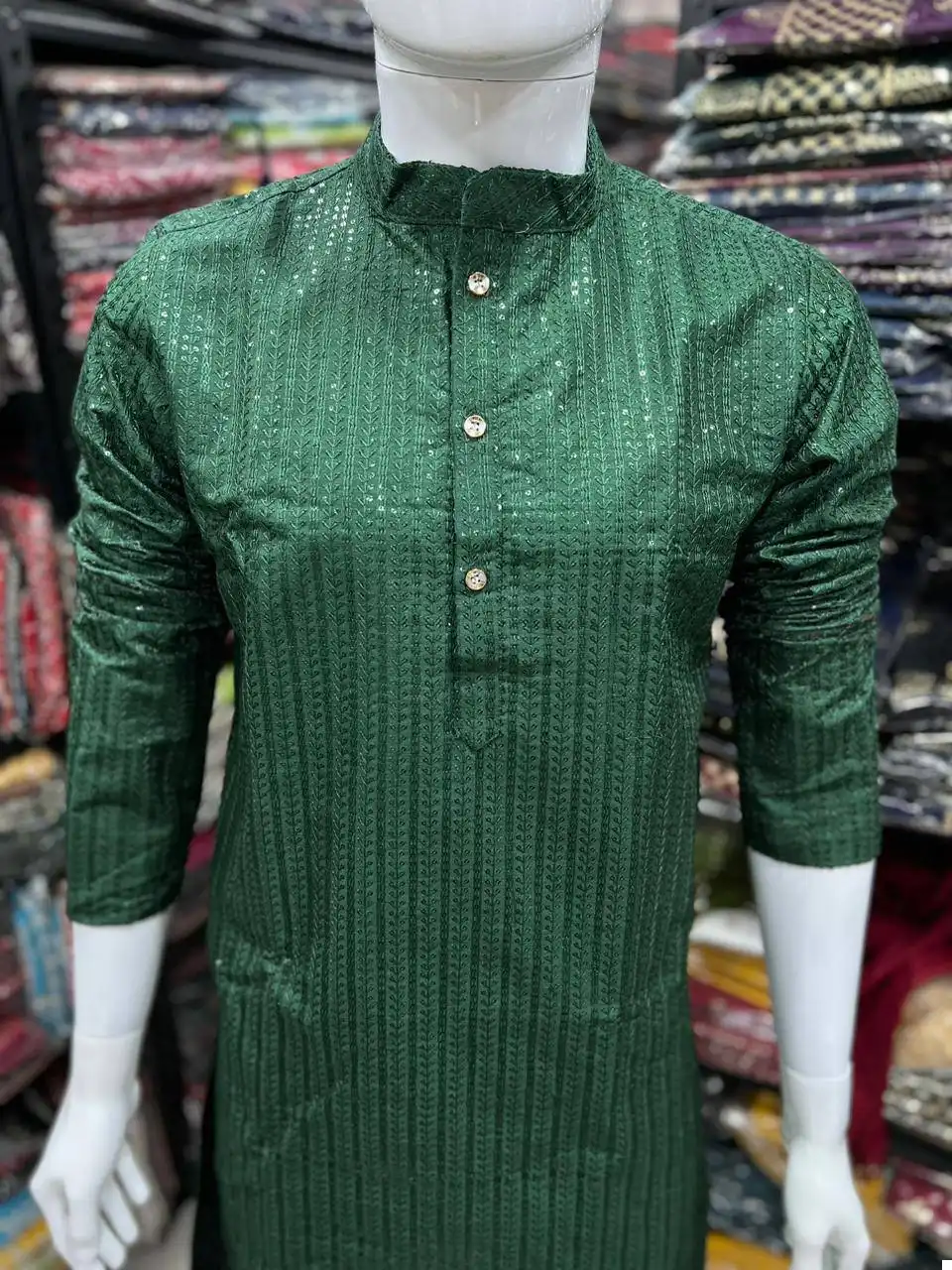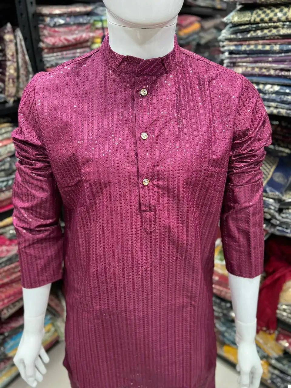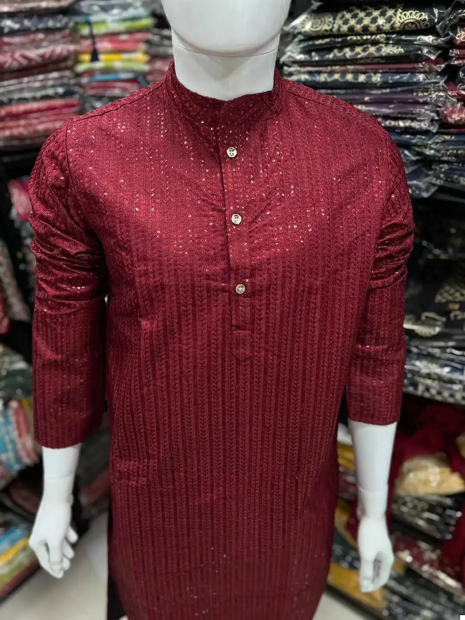 Kurta: Crafted from premium Banglori silk, this kurta features intricate sequence embroidery stitch work, adding a touch of glamour and sophistication. The exquisite detailing showcases fine craftsmanship, making it a perfect choice for special occasions. With both side pockets for added convenience, this kurta strikes the perfect balance between style and functionality.