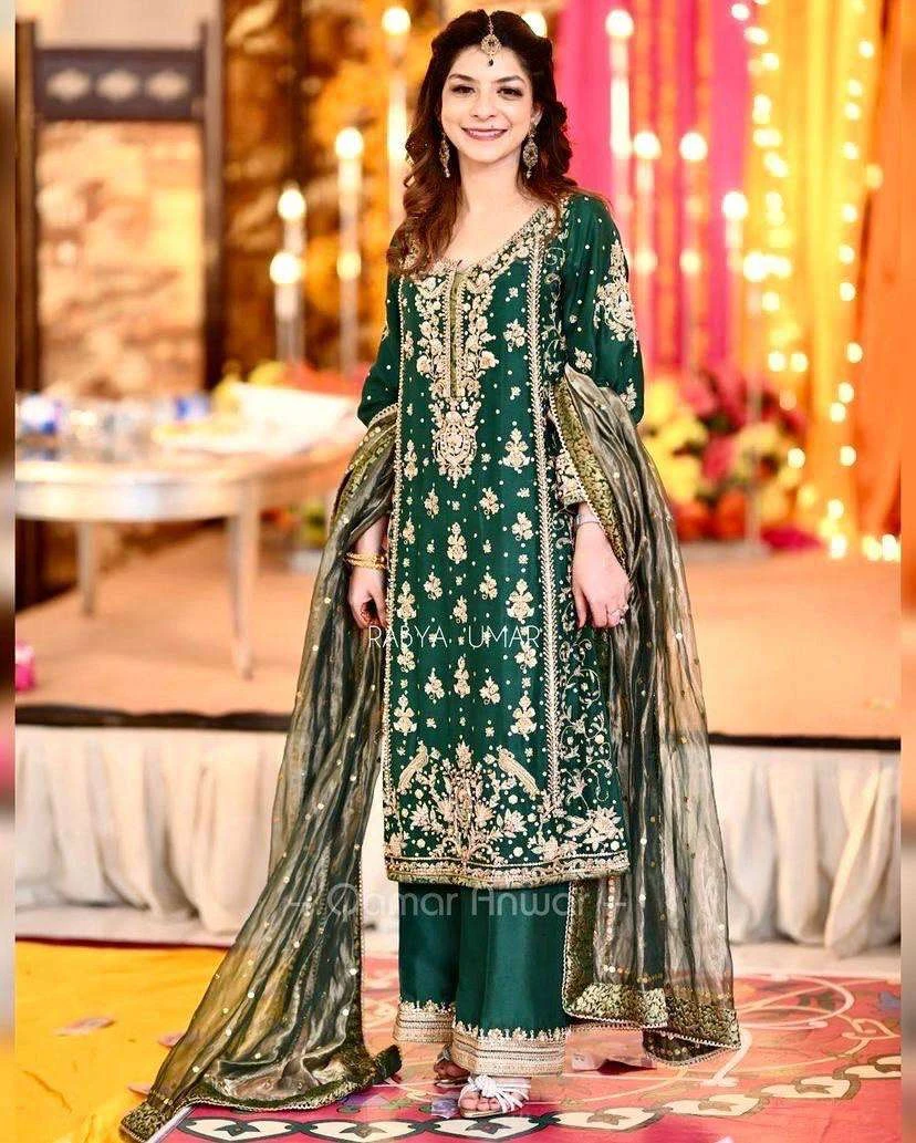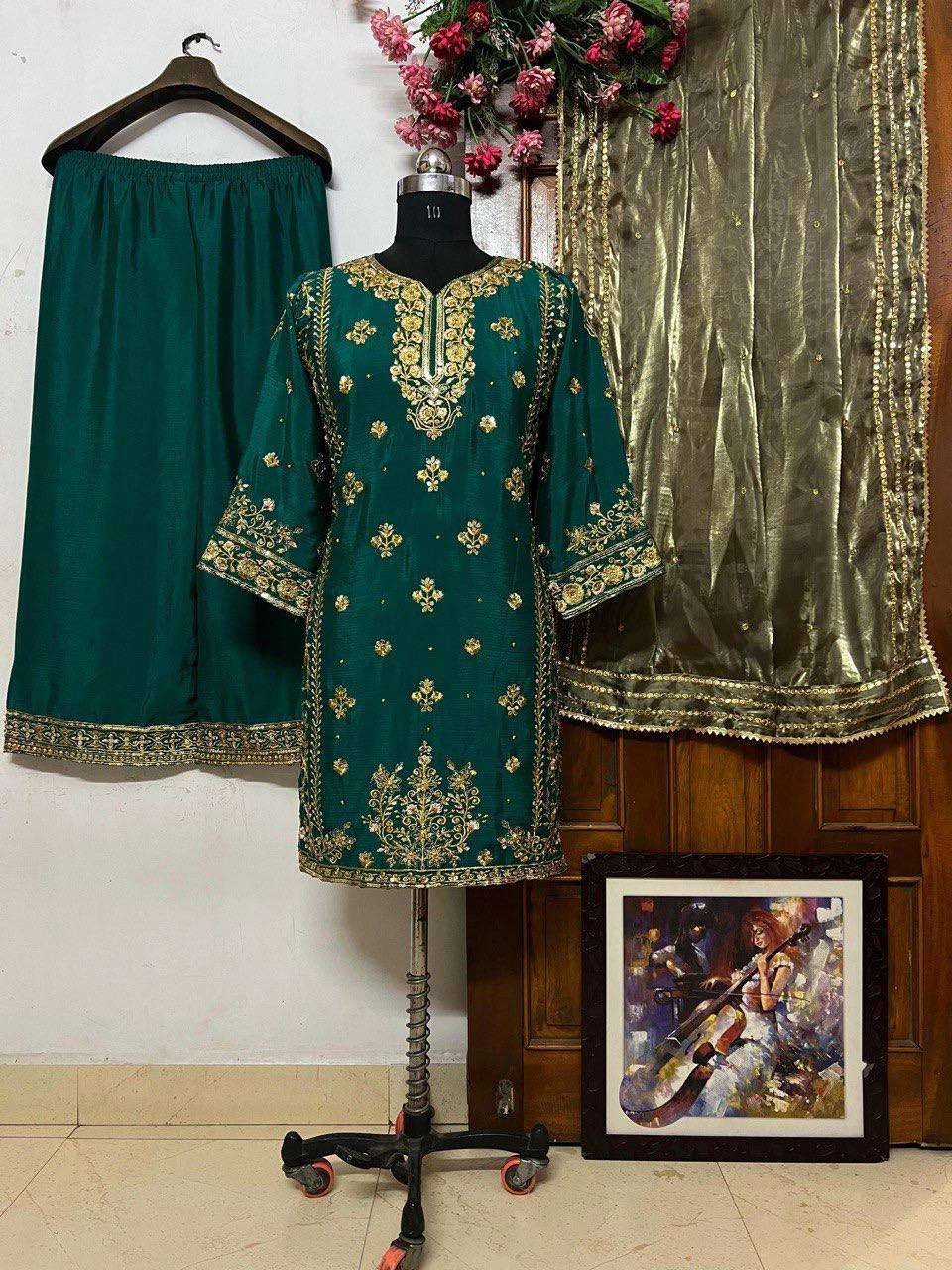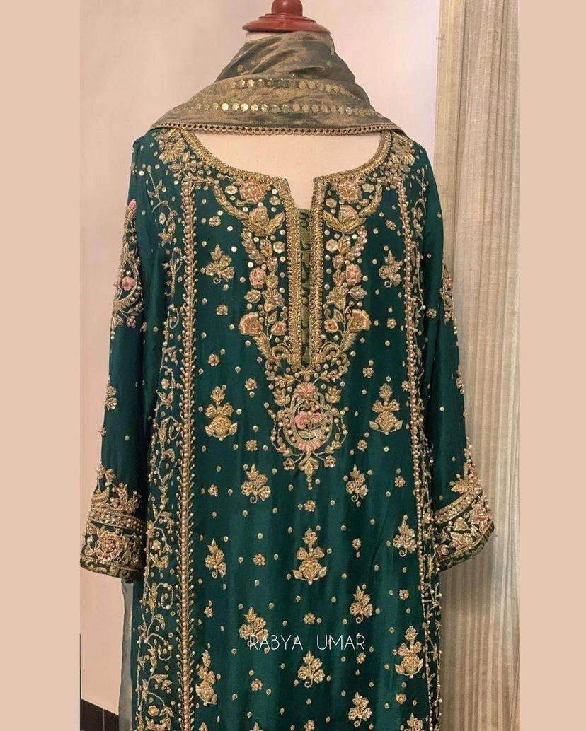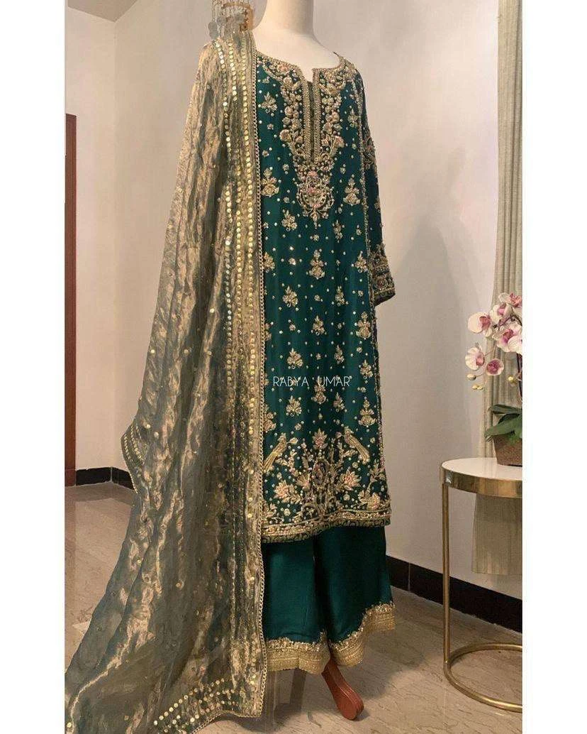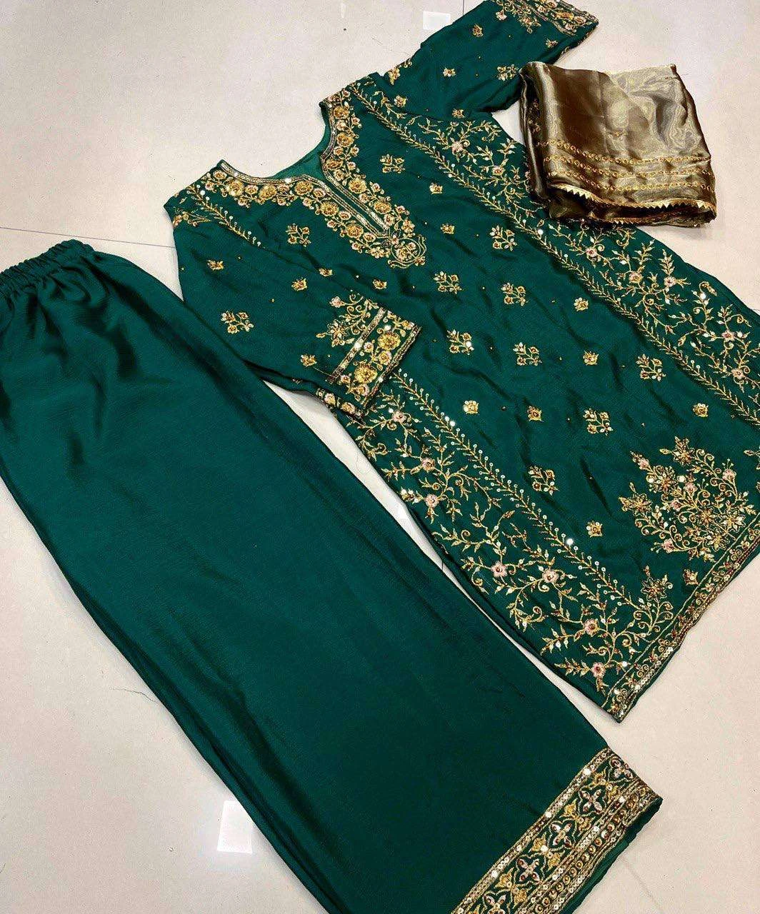 - Bottom: Matching Heavy Chinnon Silk bottoms featuring Sequins and Zari Embroidery Work, paired with a comfortable Micro Crepe inner lining.
