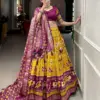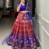 Tussar Silk Lehenga: Crafted from luxurious Tussar Silk, this lehenga showcases a beautiful Patola print with foil work. The drawstring waist is not only stylish but also comfortable to wear. Heavy tassels and a zip enhance the overall look, making it easy to put on. The lehenga’s 4-meter flair adds graceful movement to your every step.