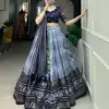 Blouse: The set includes a Tussar Silk blouse piece, echoing the Ikkat print and foil work found on the lehenga. With 0.80 meters of fabric, it allows for a custom-tailored fit to complement the grandeur of the lehenga.