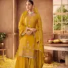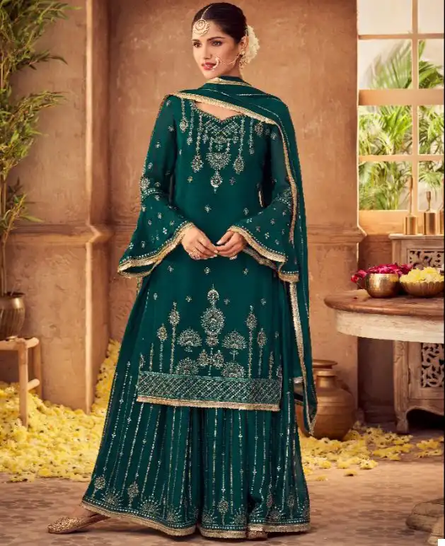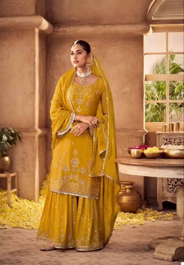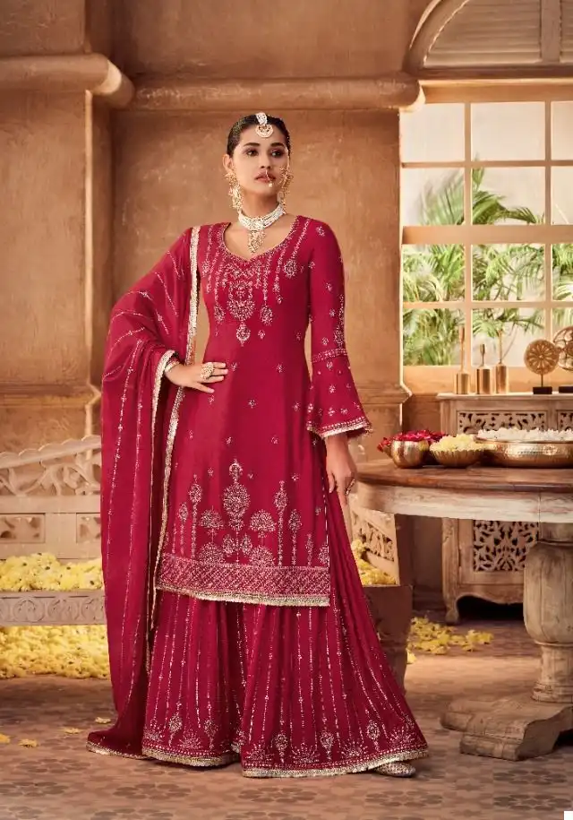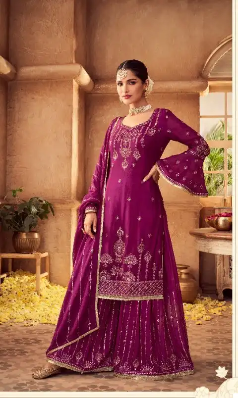 Top, Bottom, and Dupatta: Each piece in this ensemble is crafted from premium Chinon fabric, renowned for its luxurious texture and graceful drape. Adorned with intricate embroidery and shimmering sequin work, the top, bottom, and dupatta come together to create a cohesive and mesmerizing look. The coordinated design ensures a harmonious blend of style and sophistication, making it perfect for special occasions and events.