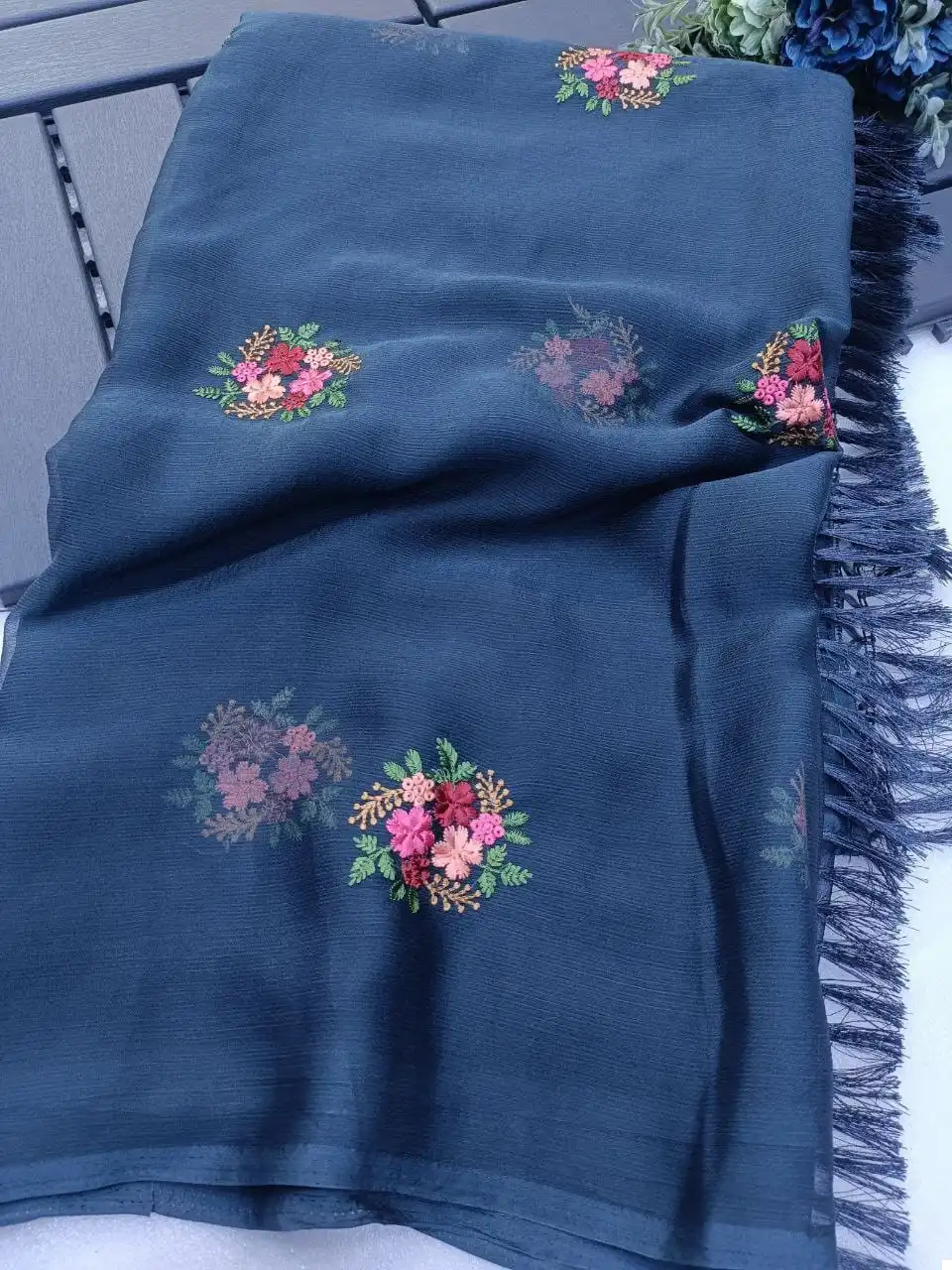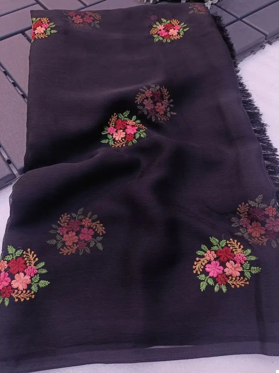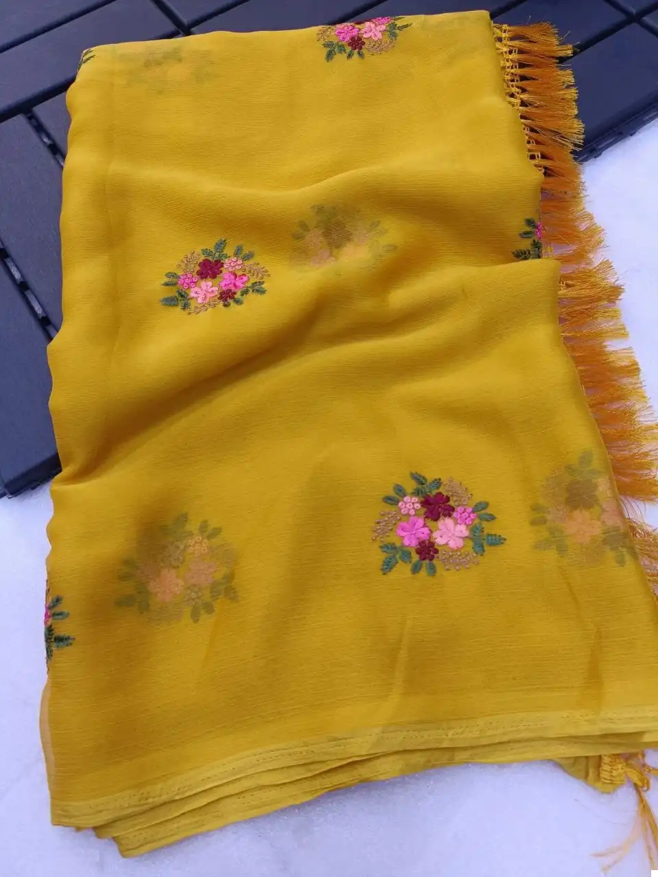 Don’t miss the chance to own this exquisite Chiffon Saree with multi-colored thread embroidery and attached tassels. Select your preferred color and order now to make a fashion statement with this one-of-a-kind saree.