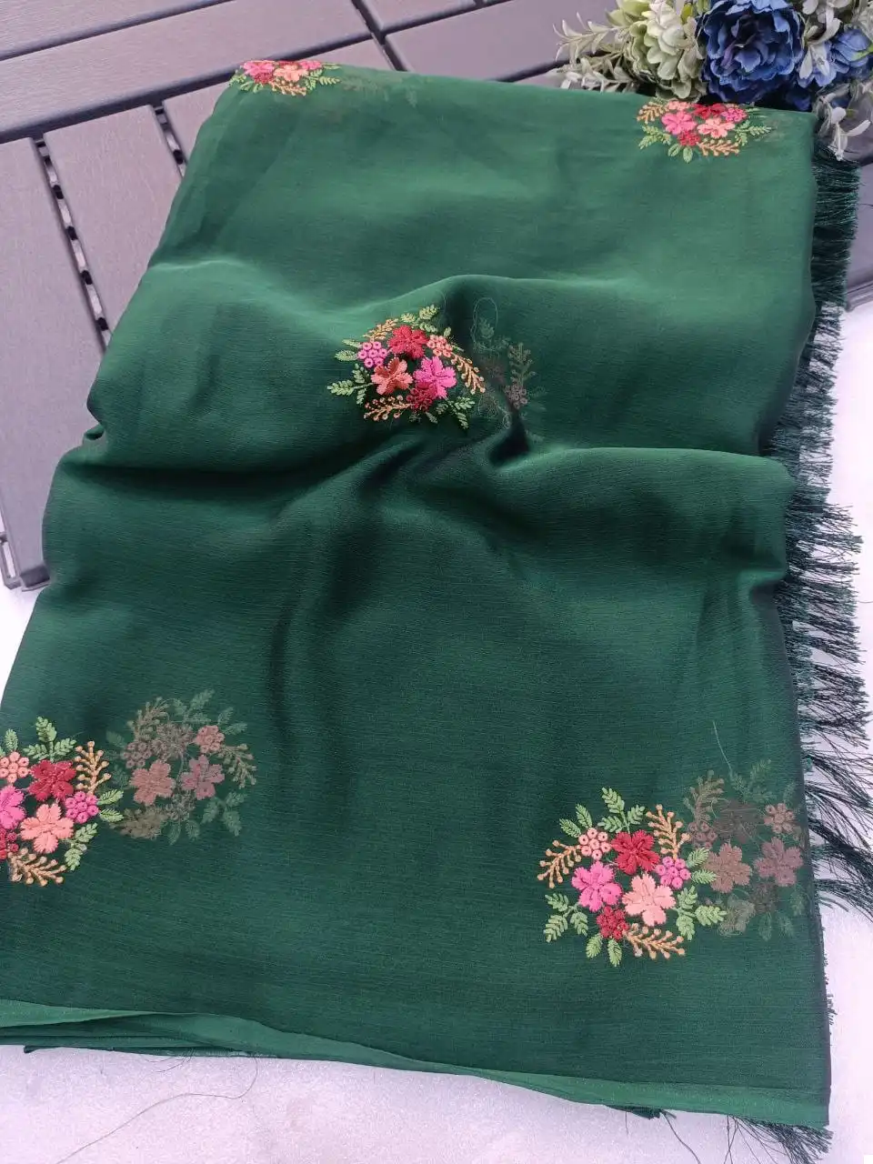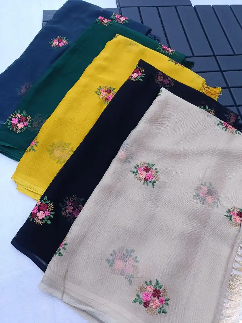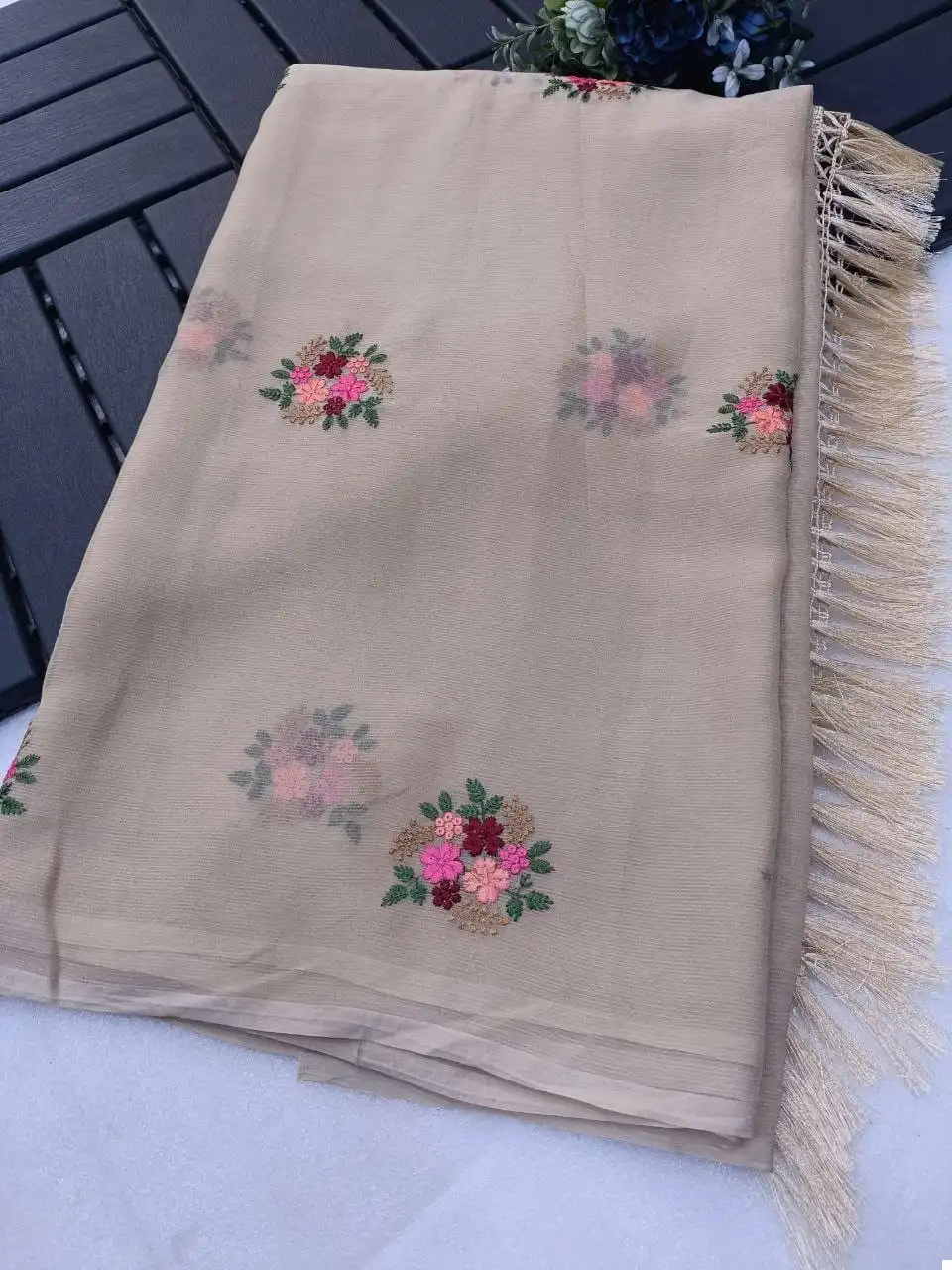 Don’t miss the chance to own this exquisite Chiffon Saree with multi-colored thread embroidery and attached tassels. Select your preferred color and order now to make a fashion statement with this one-of-a-kind saree.