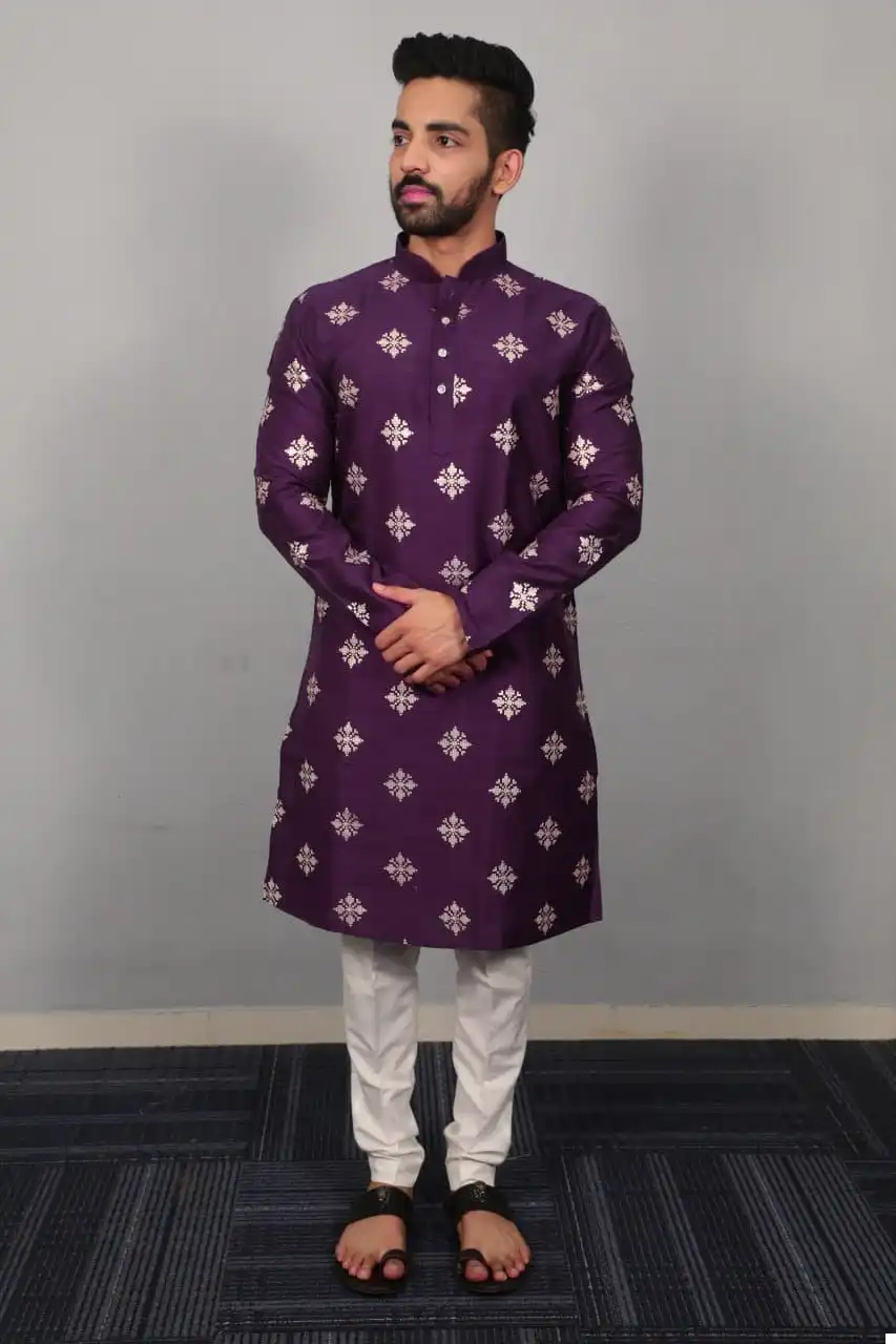 - Kurta: Immerse yourself in luxury with our Kurta, embellished with intricate Crotch Stitch and Matte Copper Sequence Work. Crafted from Soft Parbon Silk fabric, the Kurta offers a rich and luxurious feel, ensuring you stand out with regal charm at every occasion.