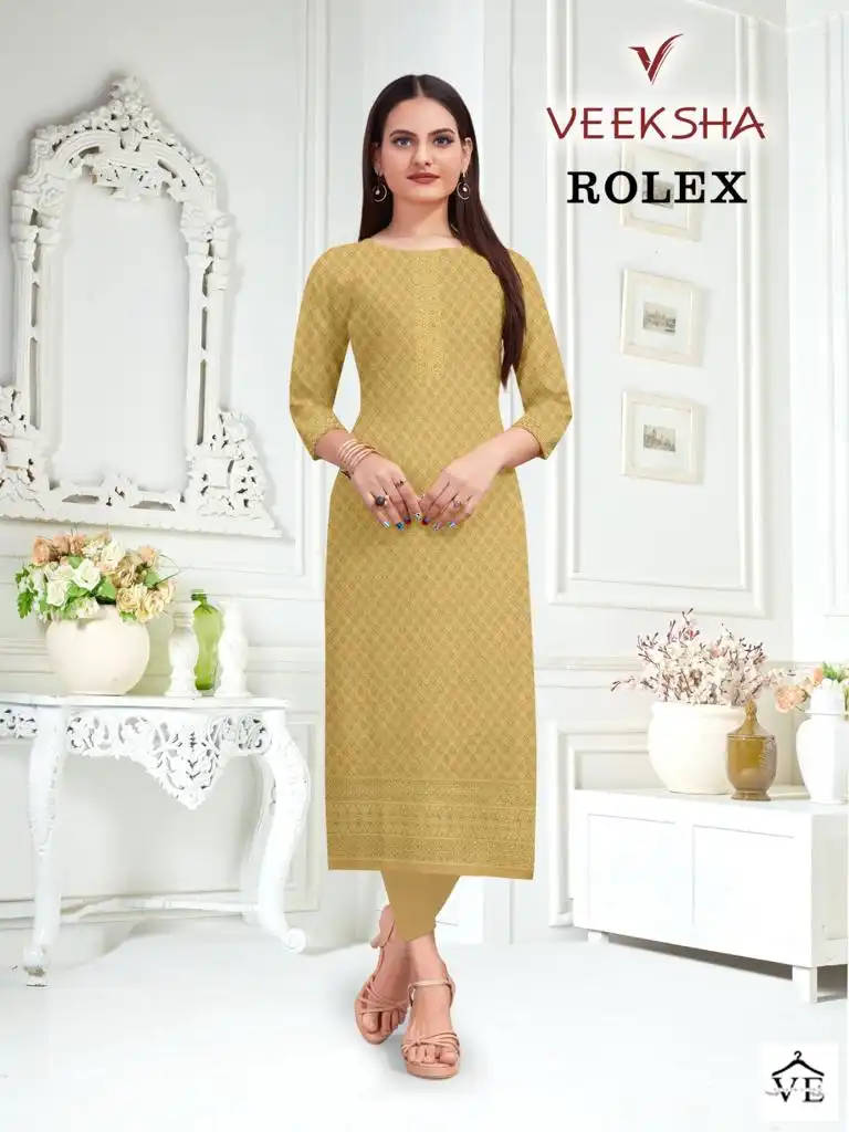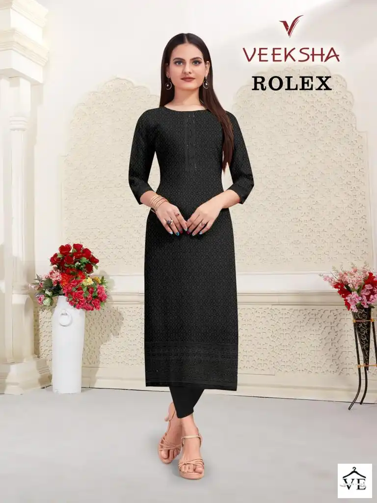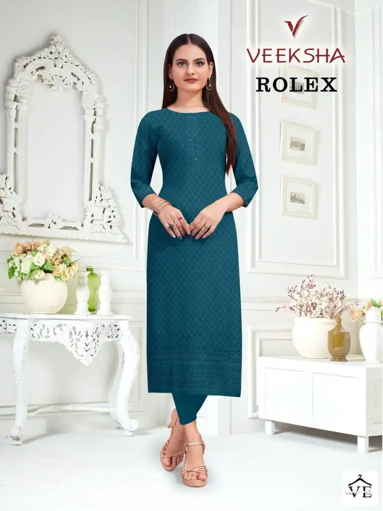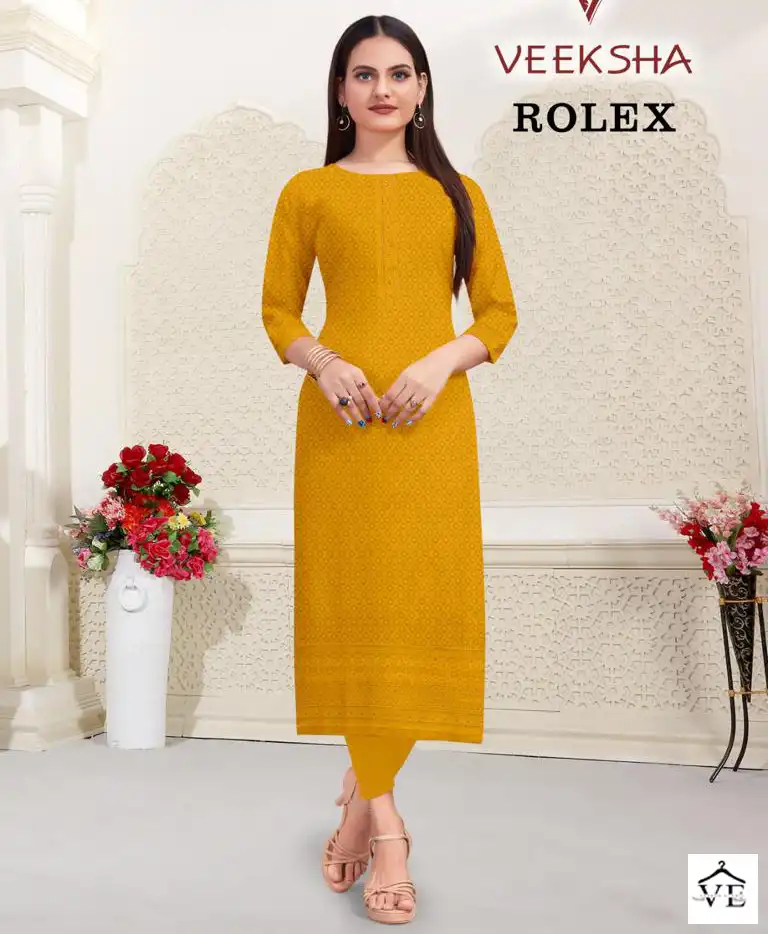Vardan Ethnic Rolex Rayon Wholesale Kurtis Catalog 4 Pcs. We deal in Kurtis, Sarees, Dresses Materials, Leggings, and Designer Salwar Kameez.