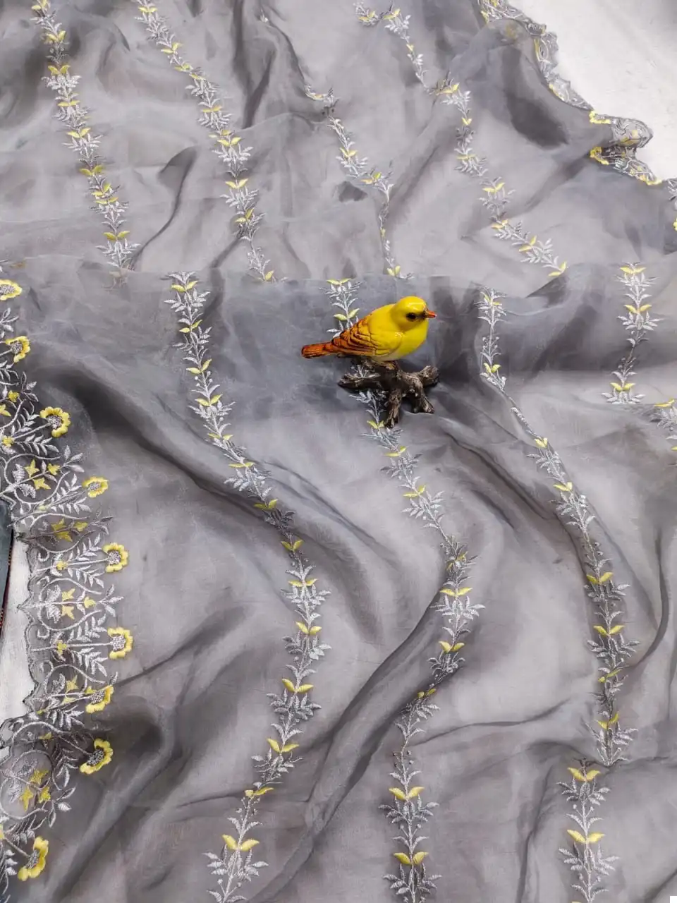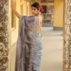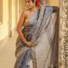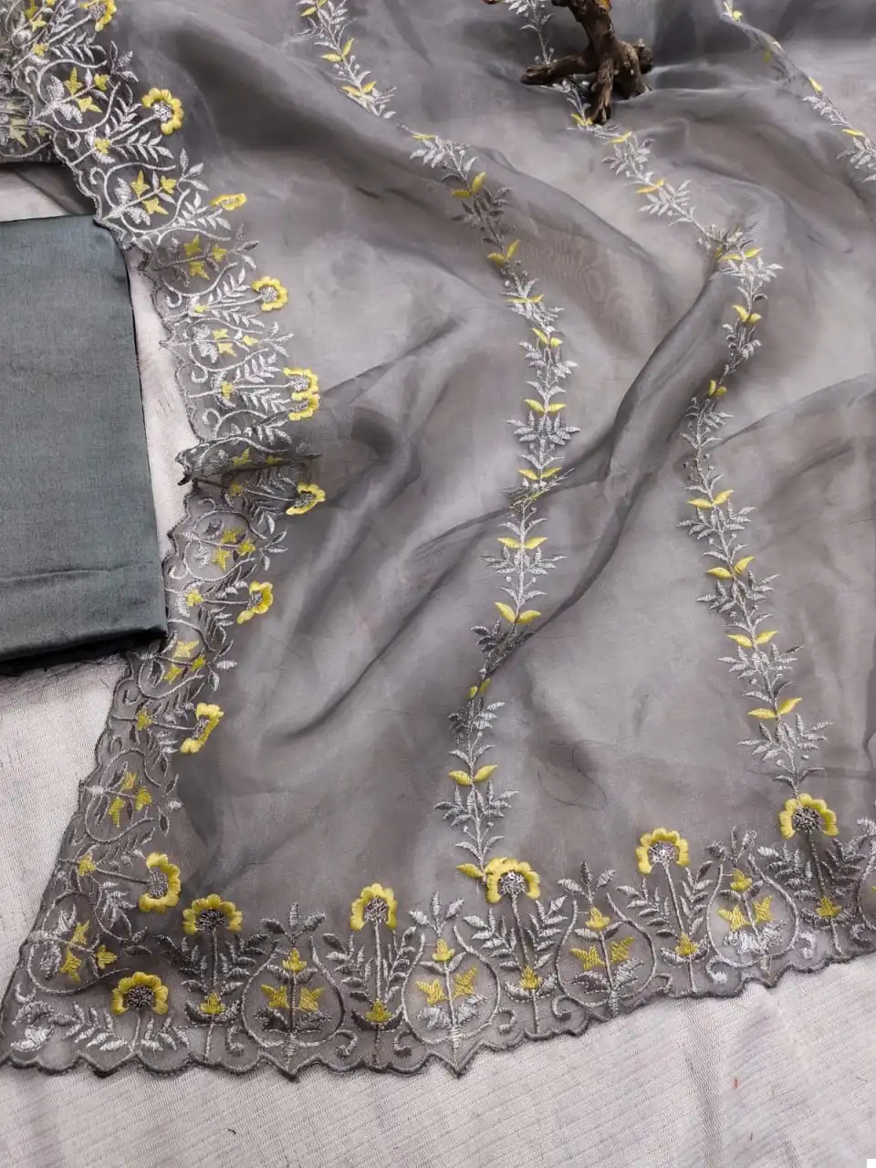 Bottom: The set includes a bottom made from mono-diamond silk in a solid plain color that matches the saree’s hue. The simplicity of the bottom complements the intricate detailing on the top, ensuring a well-balanced and stylish look.