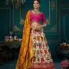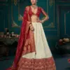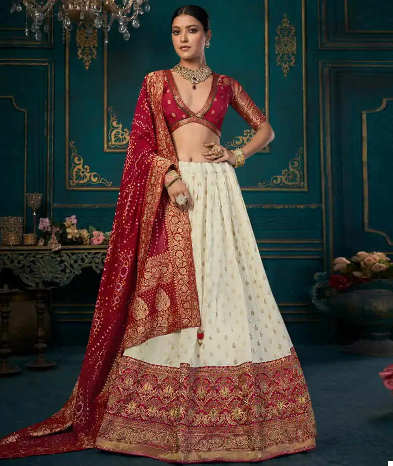 Lehenga: Our Dola Silk Lehenga is a true work of art. Crafted from high-quality Dola Silk fabric, it features intricate weaving, khatli work, and thread work that elevate its visual appeal. The lehenga’s design is a perfect blend of tradition and contemporary fashion, ensuring that you look stunning and timeless. Whether you’re the bride, bridesmaid, or a guest at a wedding, this lehenga is designed to make you stand out with grace.