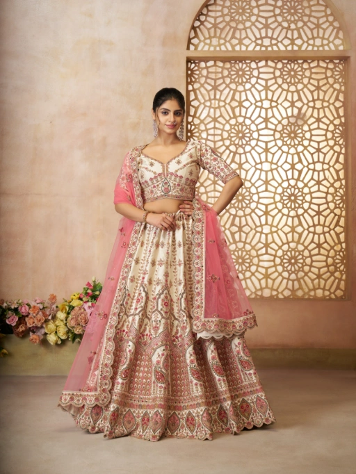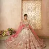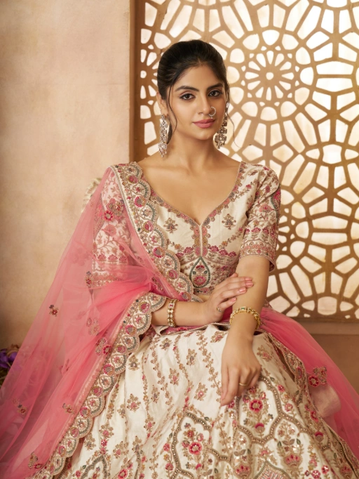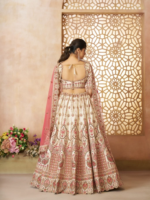 Buy Vardan Ethnic Whimsical White Imperial Patterned Bridal Lehenga online at a wholesale rate. This luxurious cream bridal lehenga spells glam and sophistication. The skirt features imperial paisley and medallion patterns set in panels and a heavily embellished border. Designed with grace, the blouse beautifully complements the skirt. The set is finished with a charming light pink sheer dupatta. The blouse features a wide scoop neck and a deep V with a tie-up fastening at the back. Complement with traditional Kundan jewellery to elevate its regal essence.