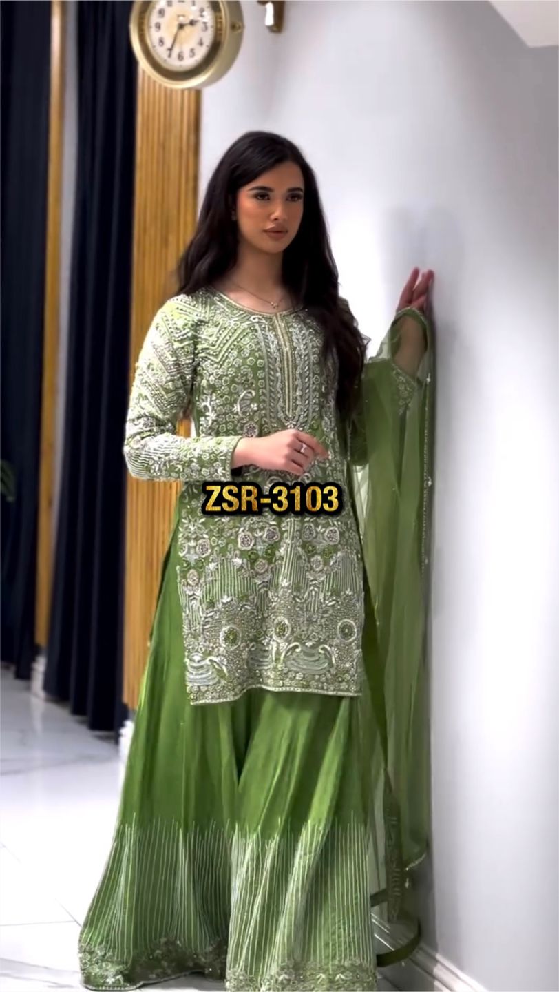 Elevate your festive wardrobe with the ZSR-3103 Designer Party Wear Set, crafted to perfection for a regal look. This fully stitched, ready-to-wear ensemble is an impeccable choice for parties, weddings, and special celebrations.