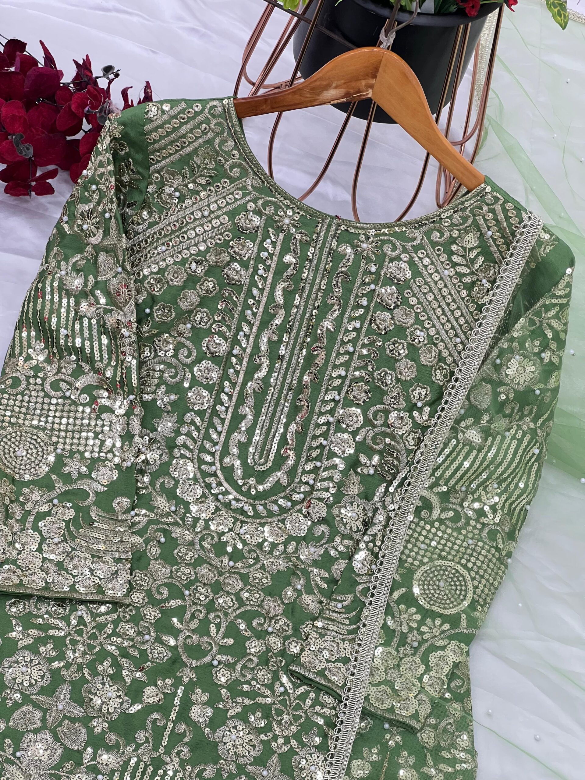 - Fabric: Heavy Pure Chinon Silk with matching 5mm embroidery sequence and moti work.