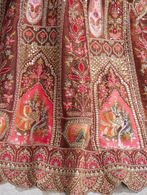 Make a graceful statement with this elegant mocha-colored Banarasi Wedding lehenga set, a true symbol of traditional charm blended with modern finesse. Expertly crafted from luxurious Banarasi silk, the lehenga showcases intricate aari embroidery with sequins, delicate floral detailing, and striking bird motifs. The generous 4-meter flair offers a flowing silhouette that’s perfect for twirls and graceful entrances. Paired with a richly embroidered matching blouse and a soft net dupatta embellished with intricate threadwork, this ensemble is a timeless pick for festive and wedding occasions. Browse more Banarasi creations in the Vardan Ethnic Lehenga Collection and watch exclusive draping styles on our YouTube Channel.