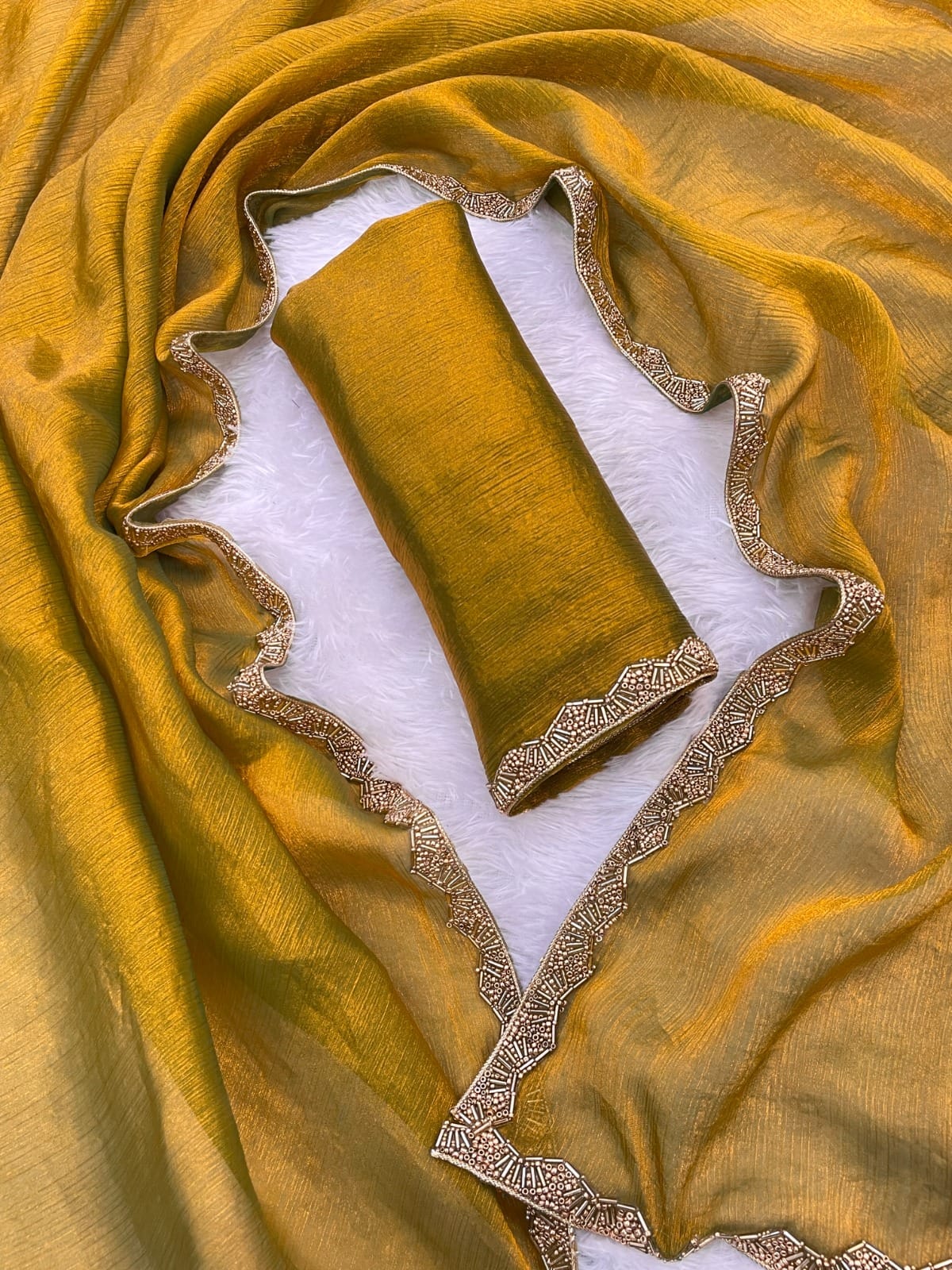 • Saree: Frandy Crush Fabric with Katdana Moti Lace Border