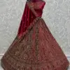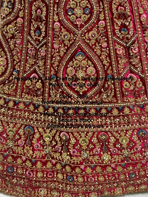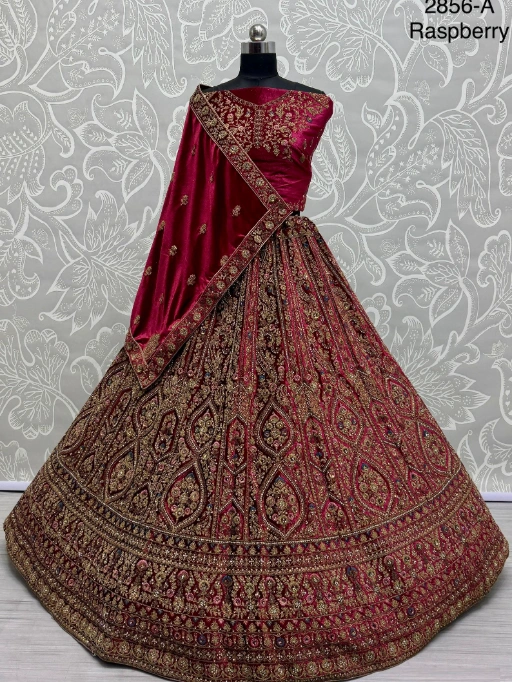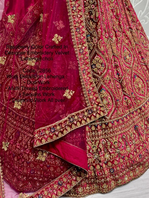 Shop the regal Raspberry Velvet Bridal Lehenga Choli with Dori, Sequins, Multi-thread, and Diamond work—perfect for weddings and grand occasions. Premium velvet base paired with ornate detailing and softnet dupatta makes this ensemble truly luxurious.