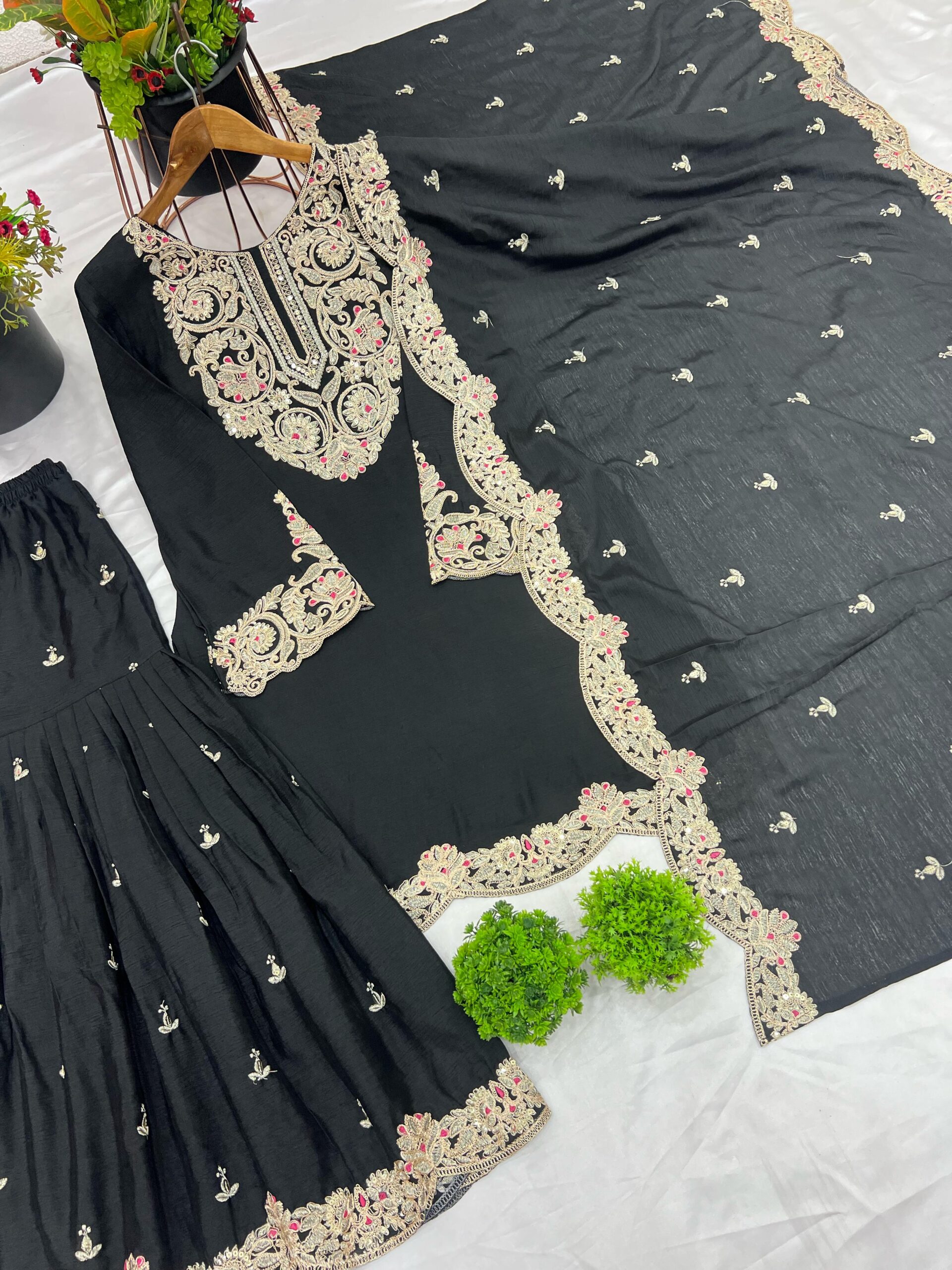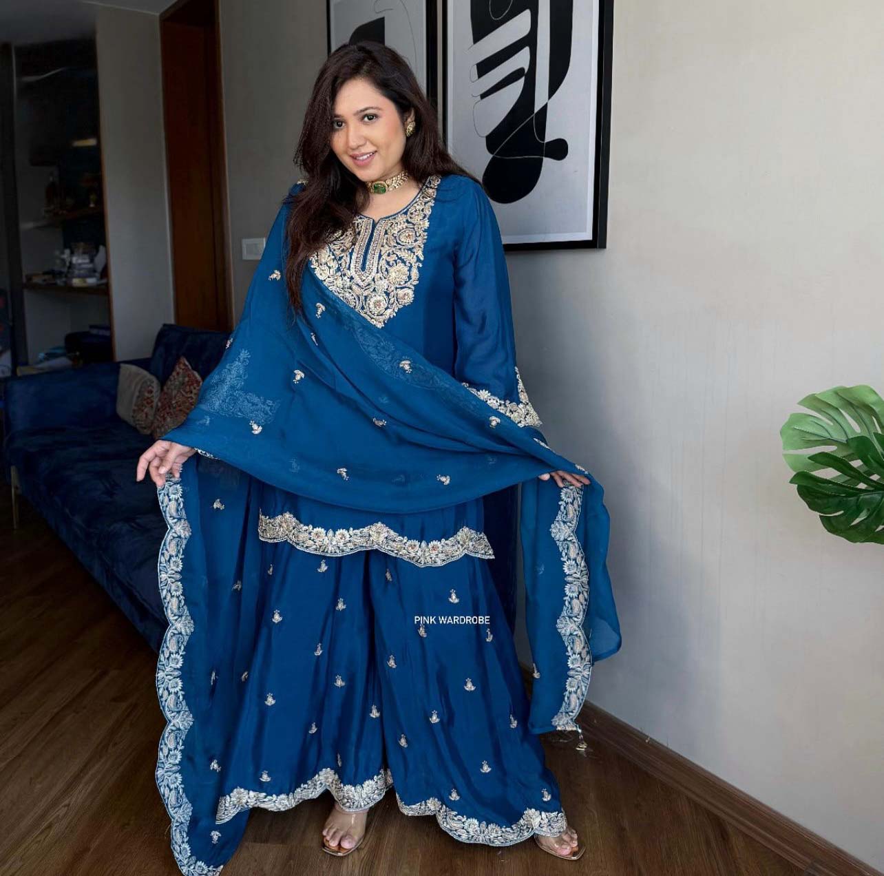 Step into luxury with SRK-5231, a stunning Pure Chinnon Silk Palazzo Set designed with intricate Heavy Embroidery Coding Dori-Sequence Work. This fully stitched, ready-to-wear ensemble is perfect for festive occasions, weddings, and celebrations!