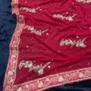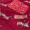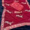 - Saree Details: The sarees are fashioned from Heavy Georgette, a fabric cherished for its graceful drape and slightly textured surface. These sarees are intricately decorated with fancy embroidery, featuring zari (a traditional metallic thread), \