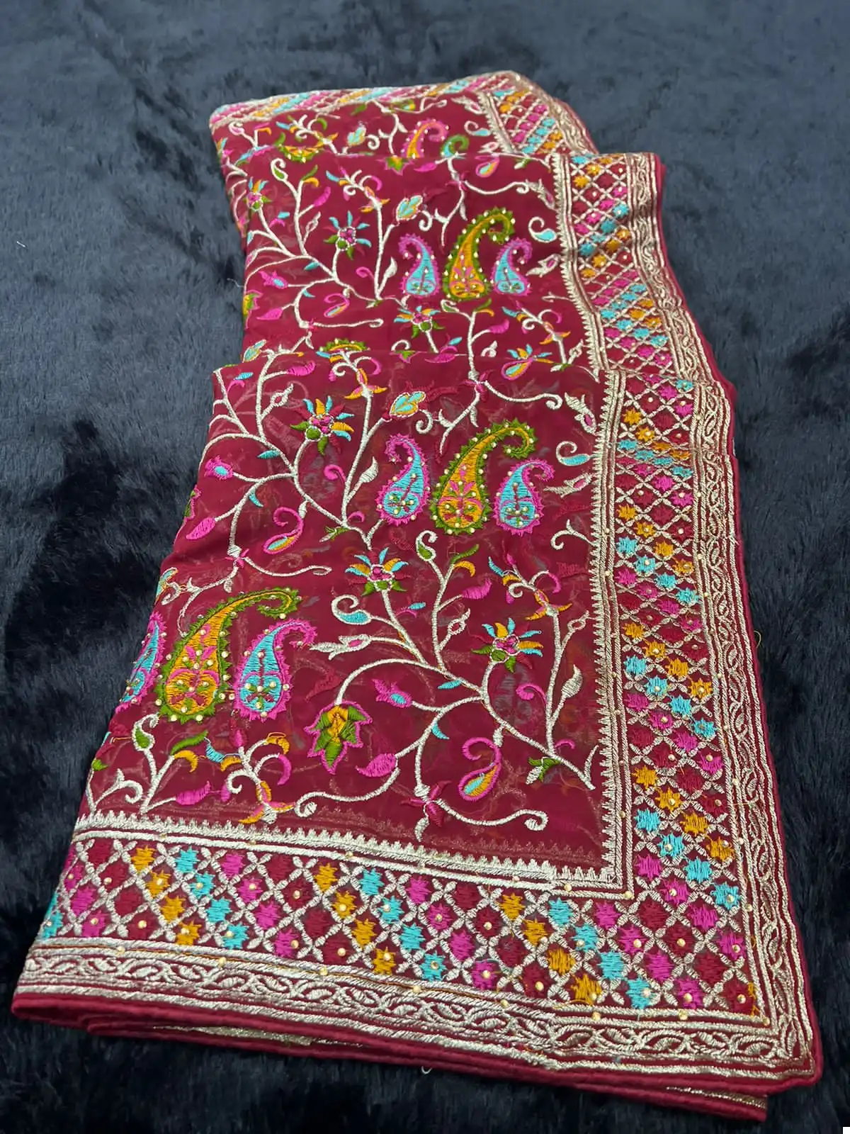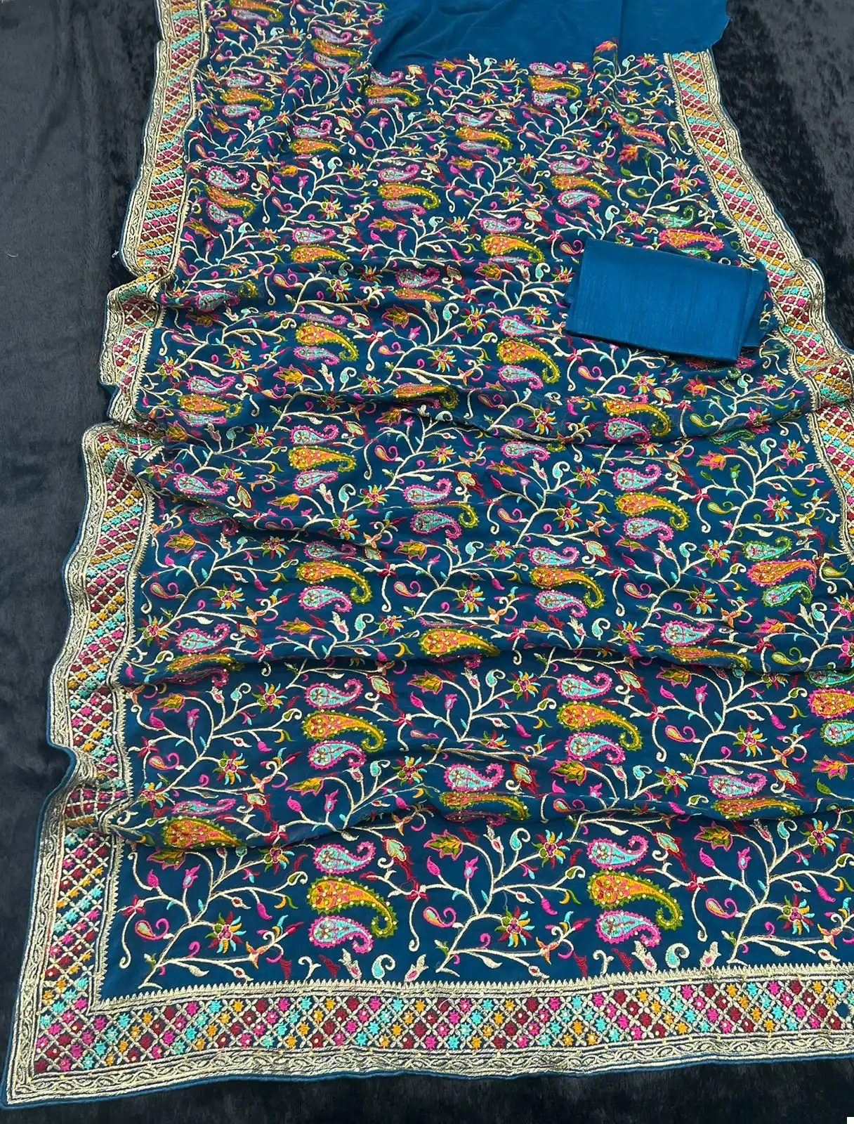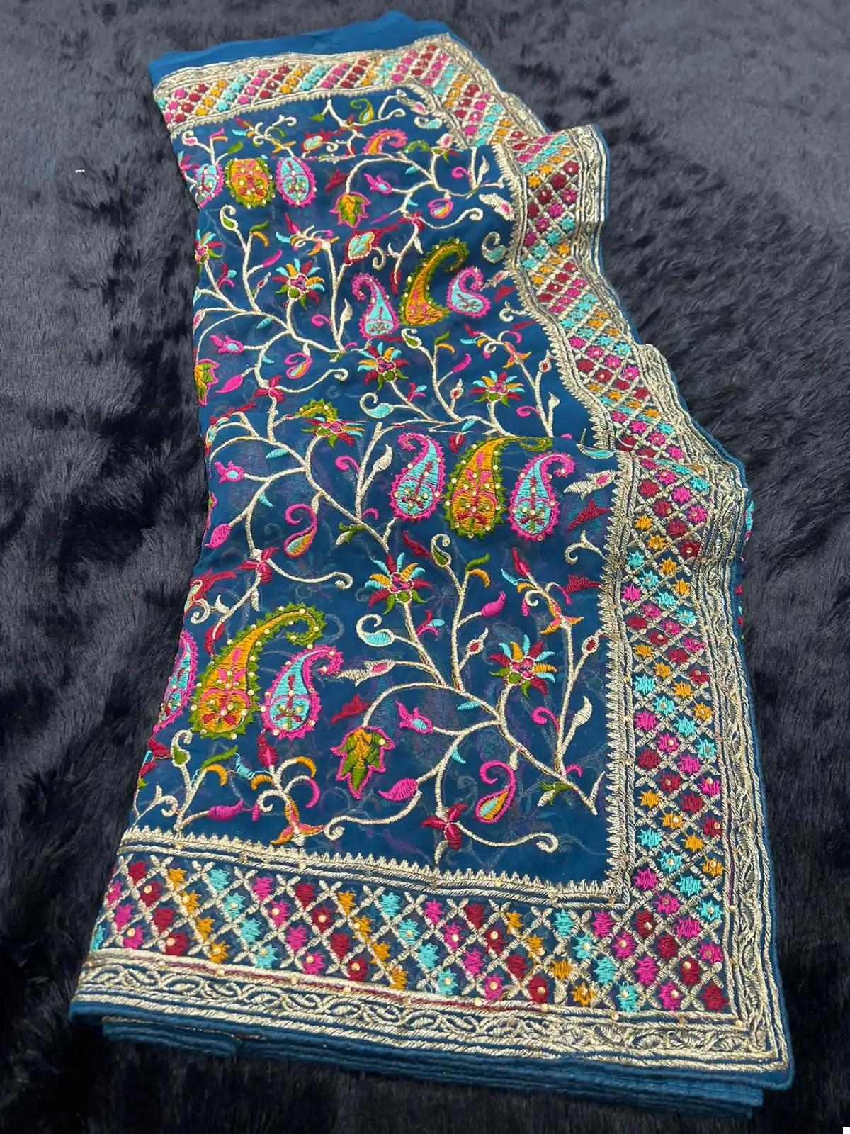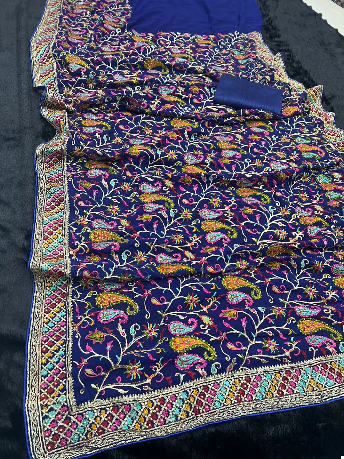 Saree Fabric and Artistry: Each saree in this collection is a masterpiece, crafted from the finest georgette known for its fluid drape and luxurious feel. Adorned with intricate embroidery that weaves together thread, zari, and Mukty work, these sarees are a testament to skilled artisanship. The embroidery enhances the fabric’s texture, creating a visually stunning and tactile experience.