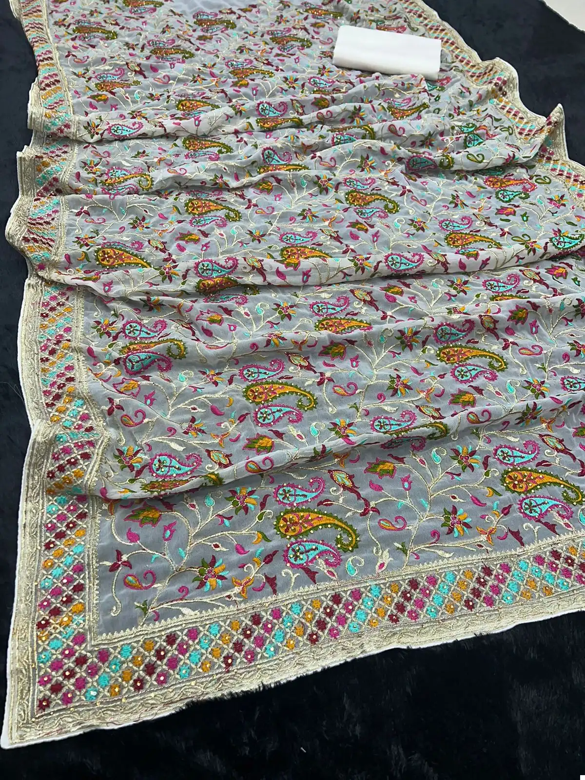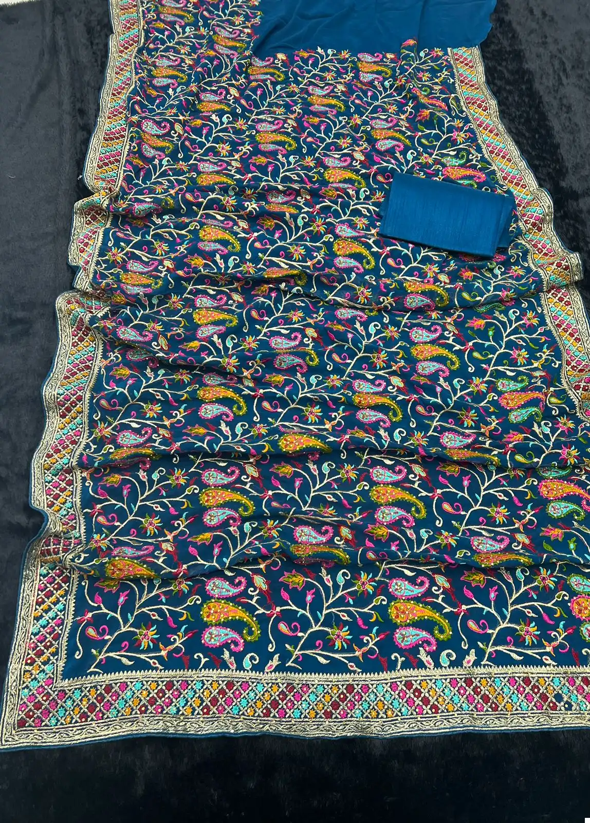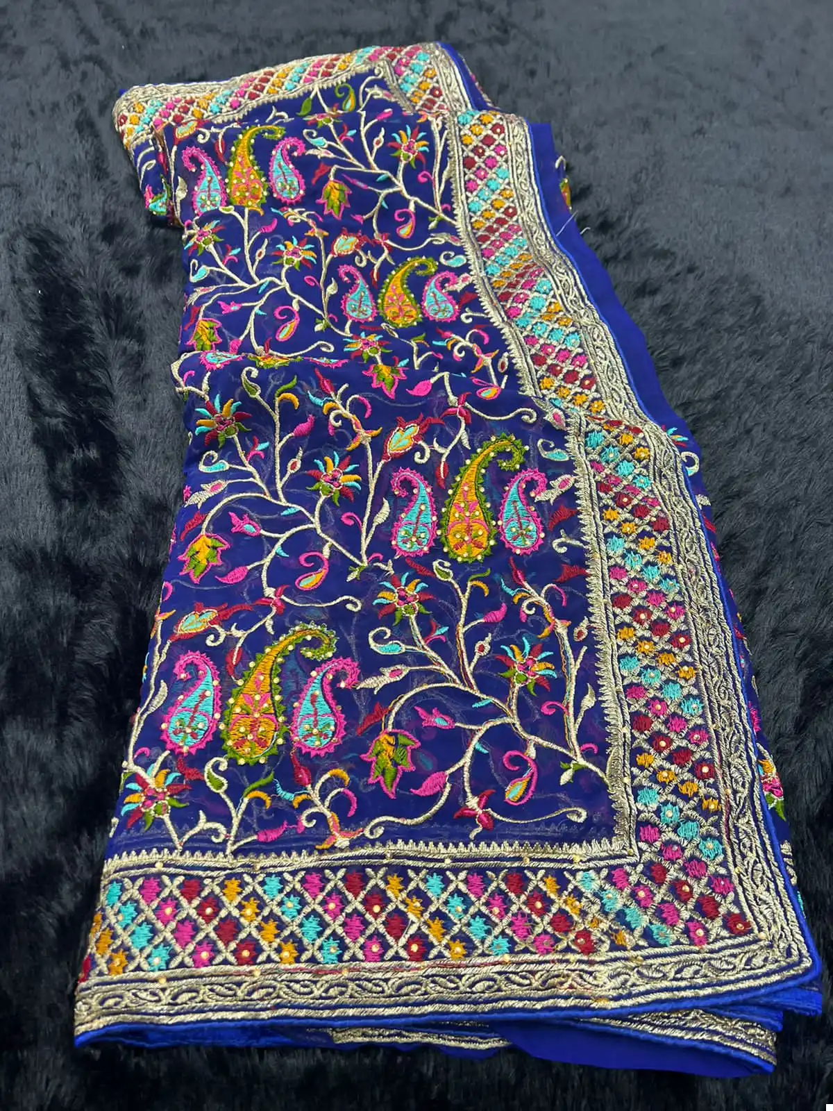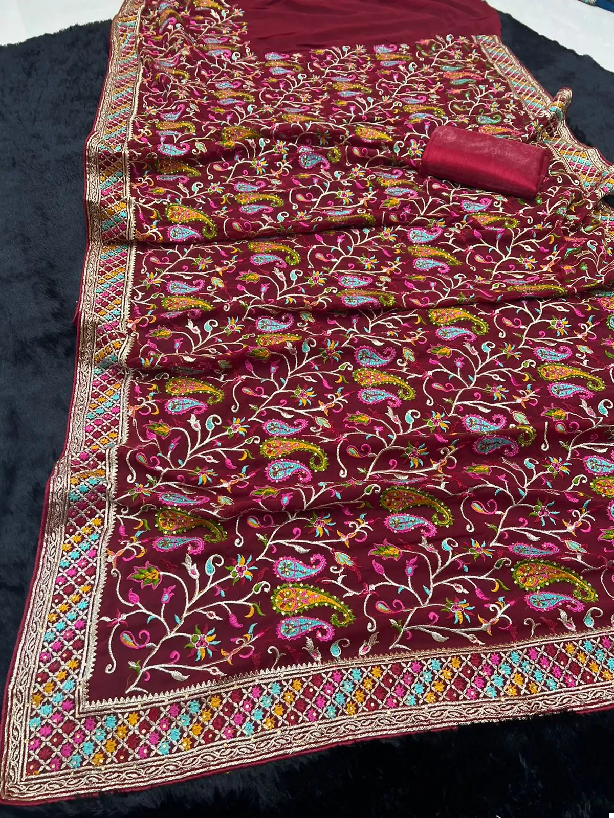Saree Fabric and Artistry: Each saree in this collection is a masterpiece, crafted from the finest georgette known for its fluid drape and luxurious feel. Adorned with intricate embroidery that weaves together thread, zari, and Mukty work, these sarees are a testament to skilled artisanship. The embroidery enhances the fabric’s texture, creating a visually stunning and tactile experience.