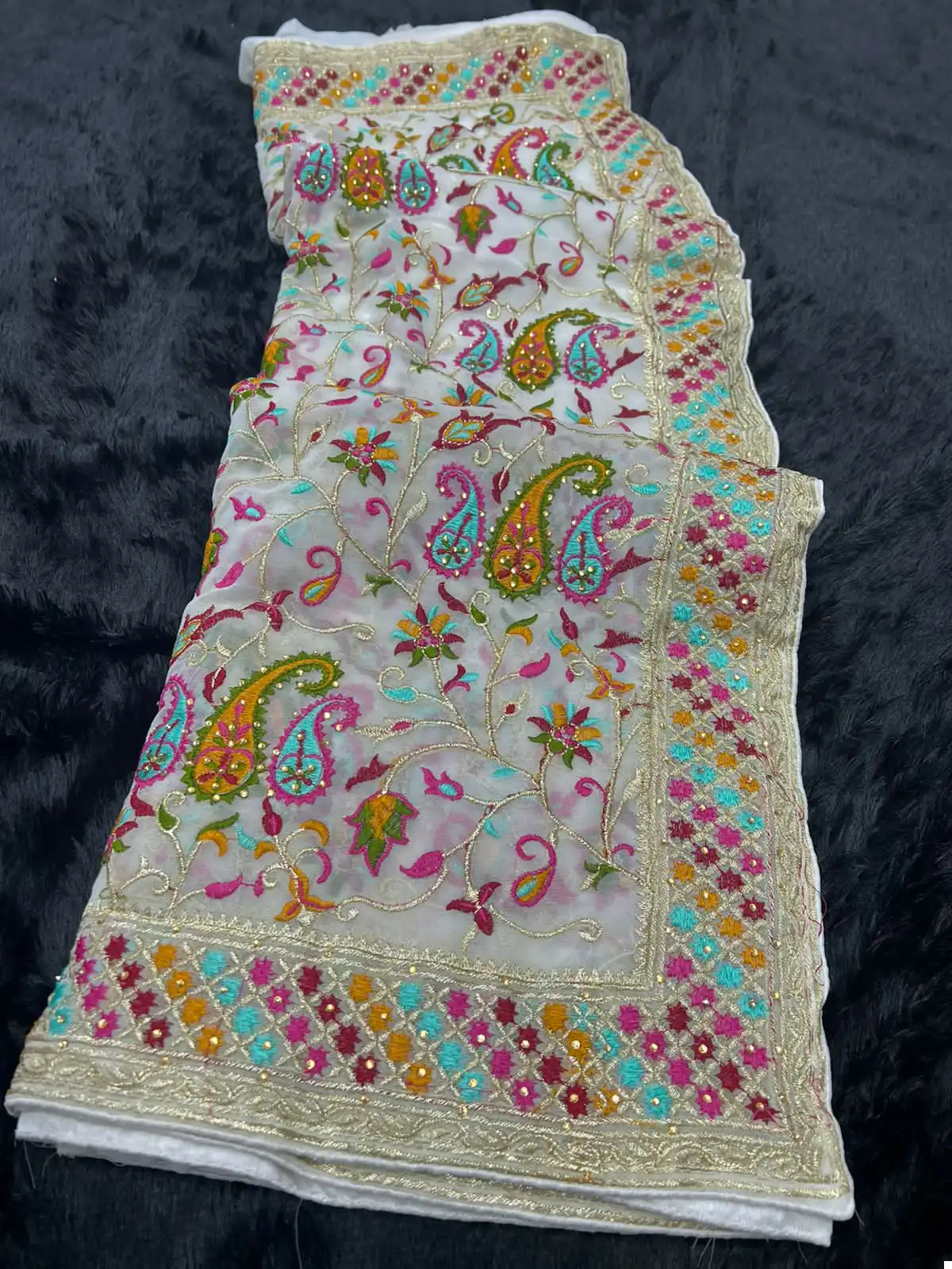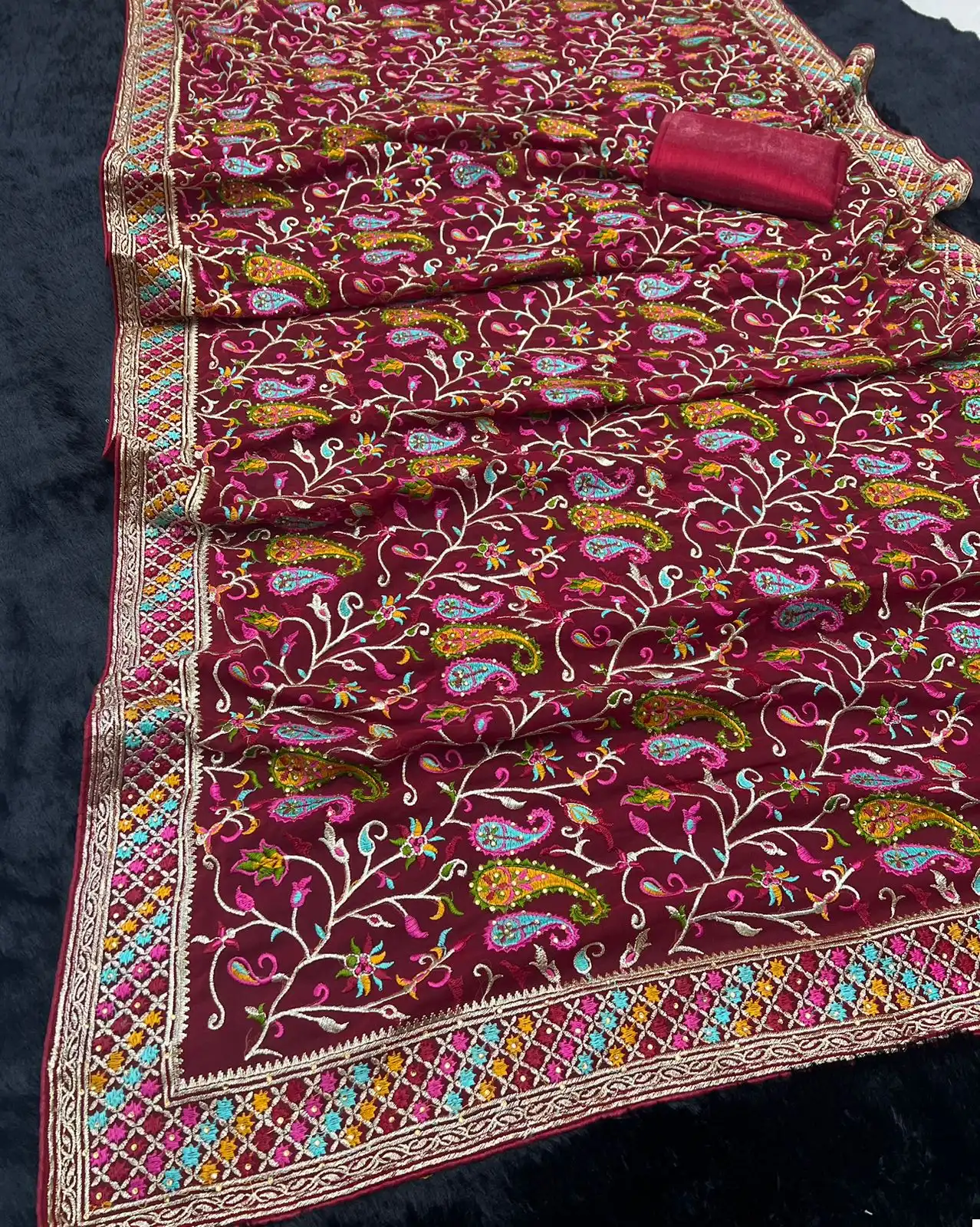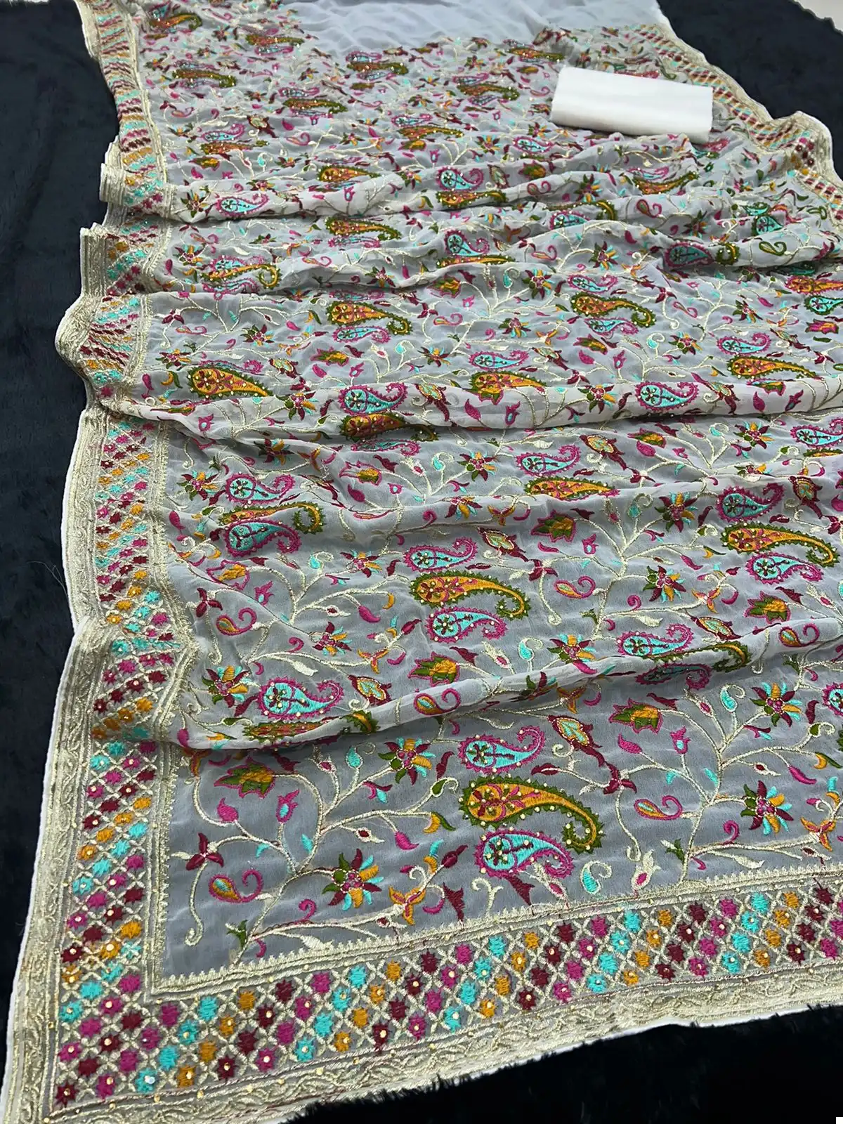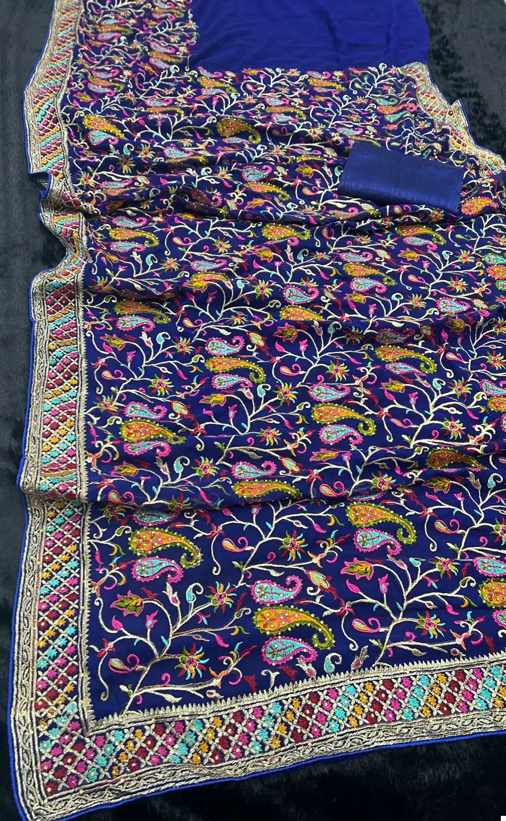 Saree Fabric and Artistry: Each saree in this collection is a masterpiece, crafted from the finest georgette known for its fluid drape and luxurious feel. Adorned with intricate embroidery that weaves together thread, zari, and Mukty work, these sarees are a testament to skilled artisanship. The embroidery enhances the fabric’s texture, creating a visually stunning and tactile experience.
